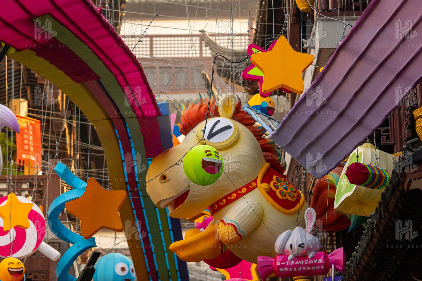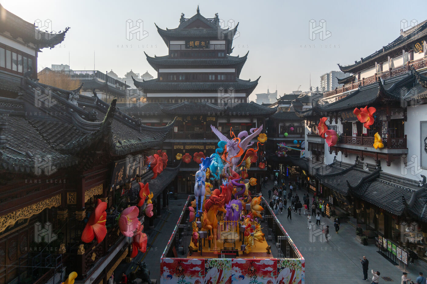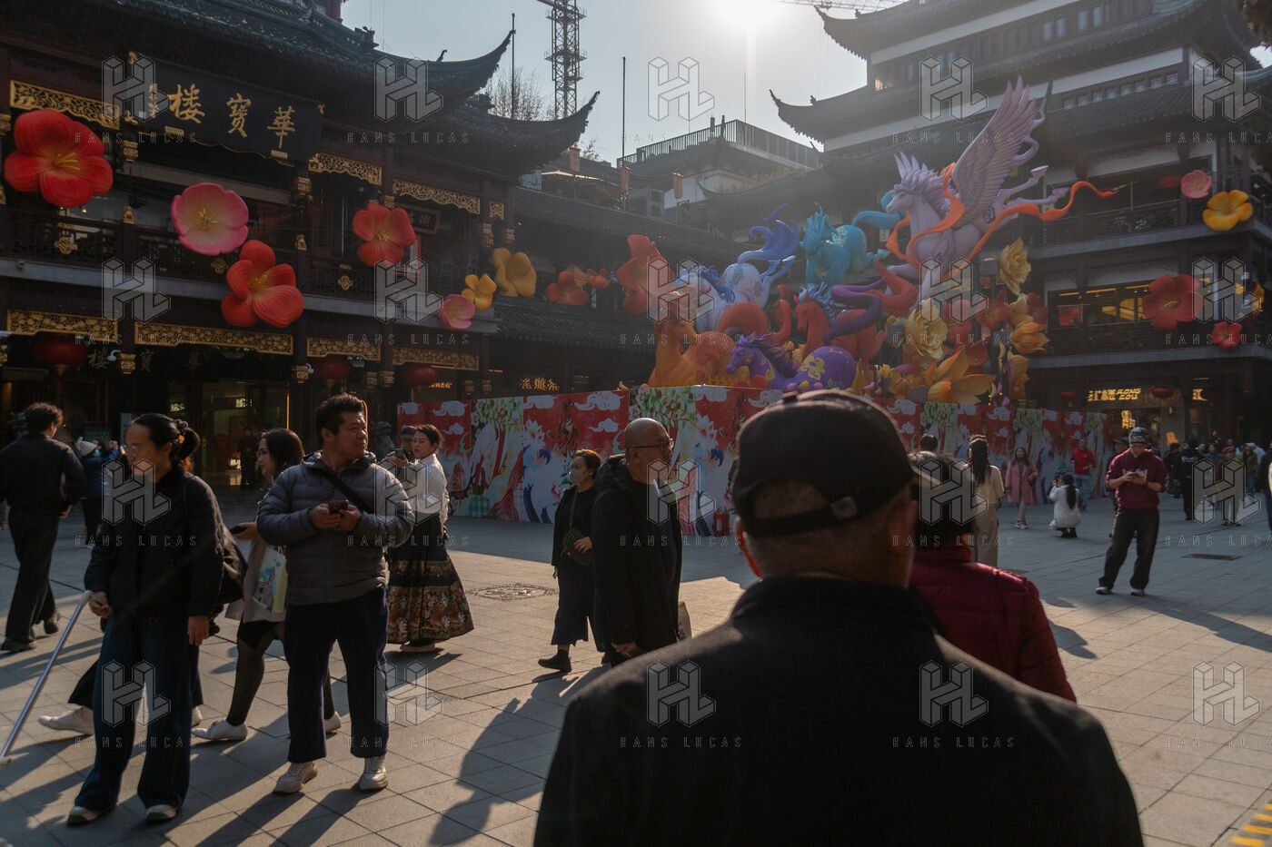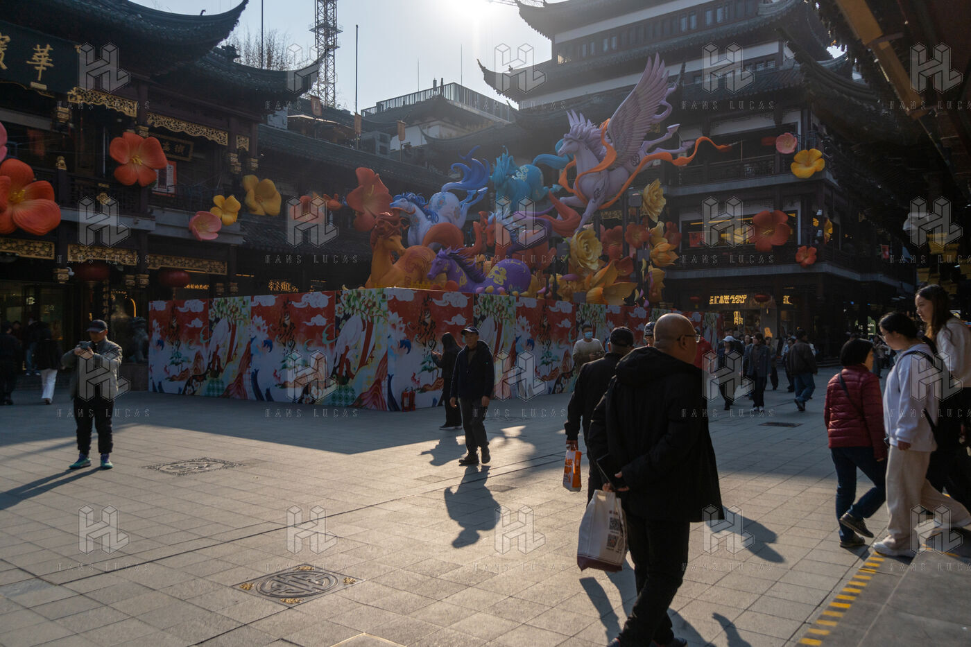 This series captures the final stages of lantern preparations at Yuyuan Garden ahead of the Lantern Festival in 2026. Photographed during the day, the images highlight the installation process, decorative details, and the presence of visitors moving through the historic market streets. A central lantern sculpture depicting horses reflects the Year of the Horse, offering a behind-the-scenes view of the festival before nightfall transforms the space.