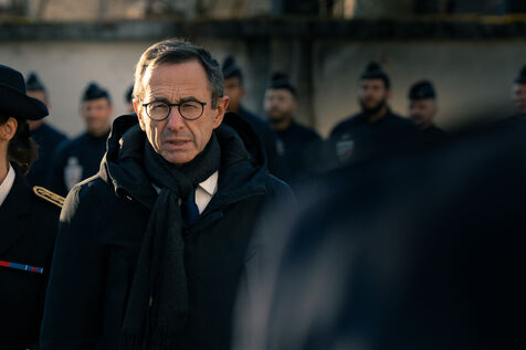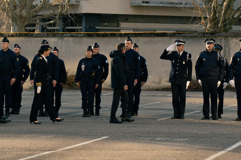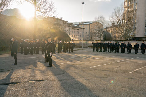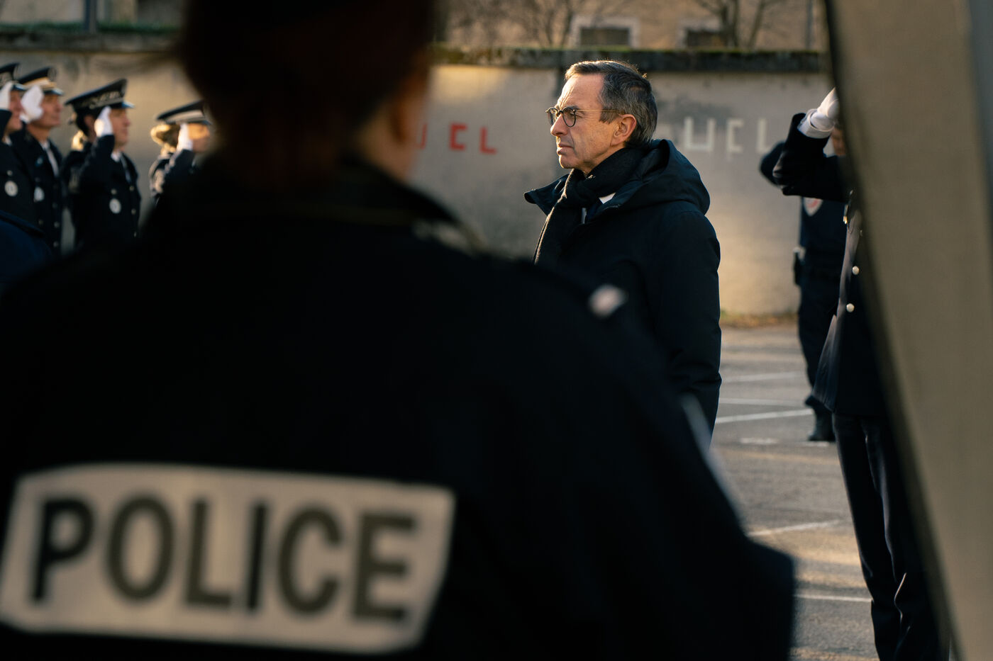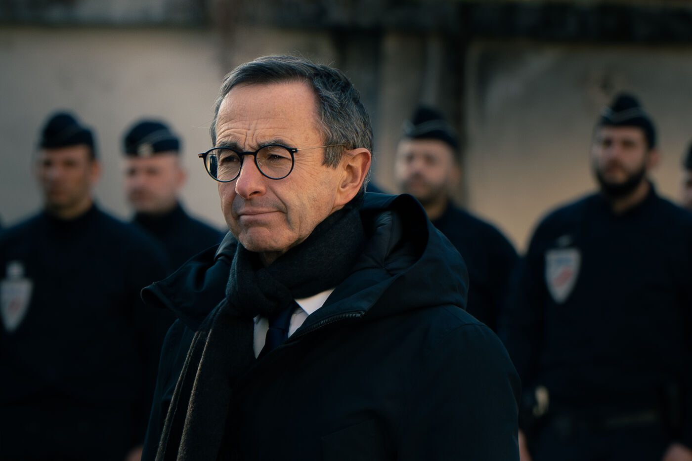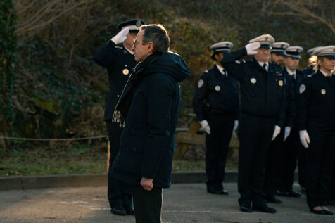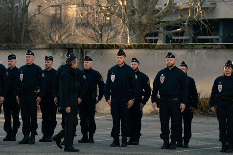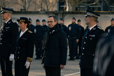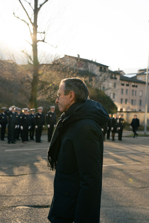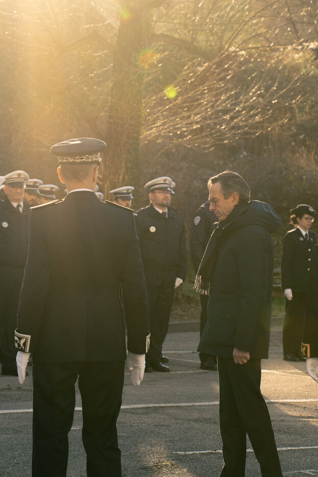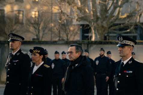 Bruno Retailleau, ministre de l'intérieur français a assisté à une cérémonie d'hommage aux policiers morts en service dans la cour d'honneur de l'hôtel de police de Grenoble, en Isère en France le 14 février 2025.