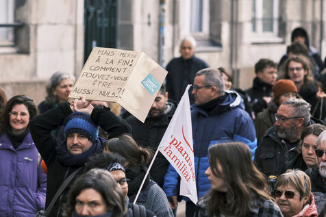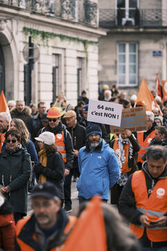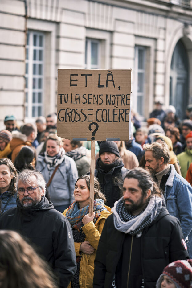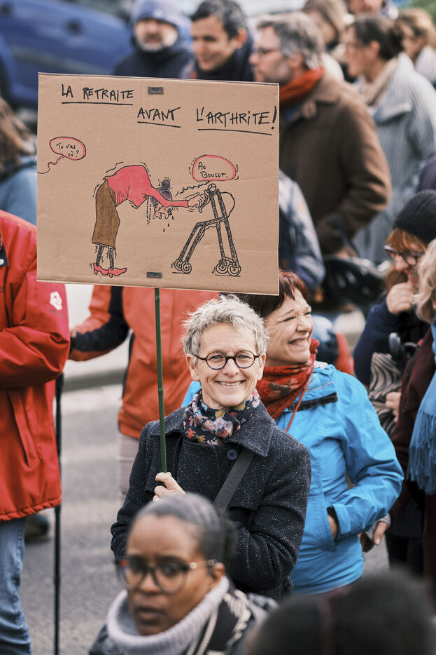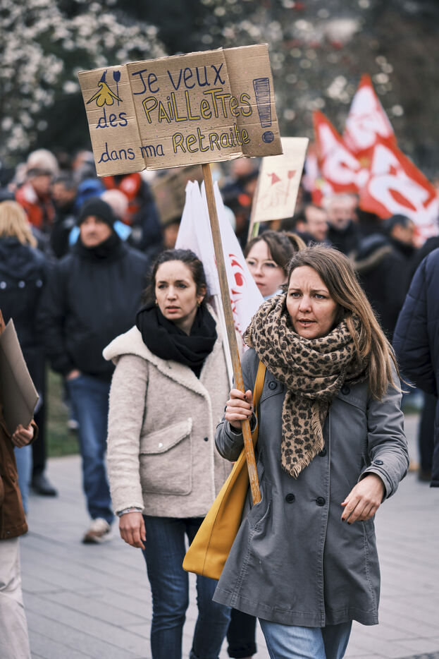 Signs from demonstrators against pension reform in Nantes on Tuesday 7 March 2023. Some are also illustrating other political taglines.