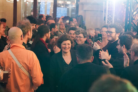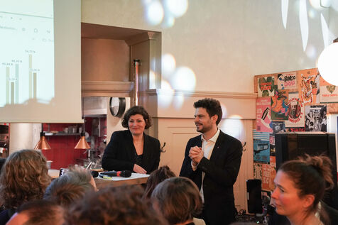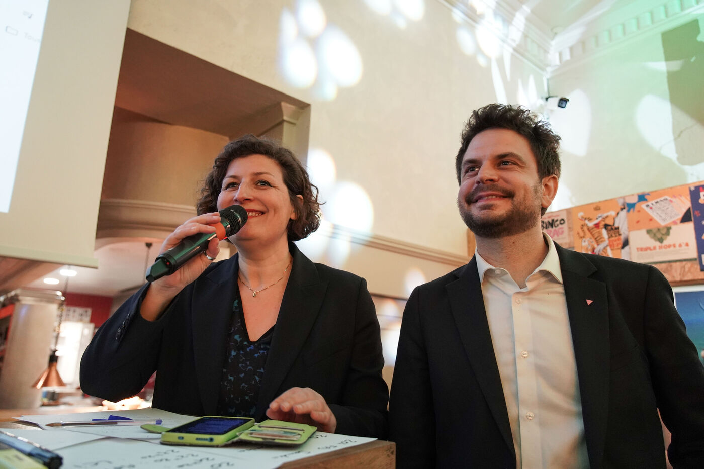 Jeanne Barseghian (Ecolos) et Florian Kobryn (LFI) avec leurs militants à leur QG à Strasbourg. Ils perdent le second tour des élections municipales.