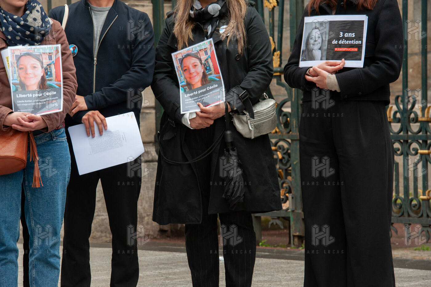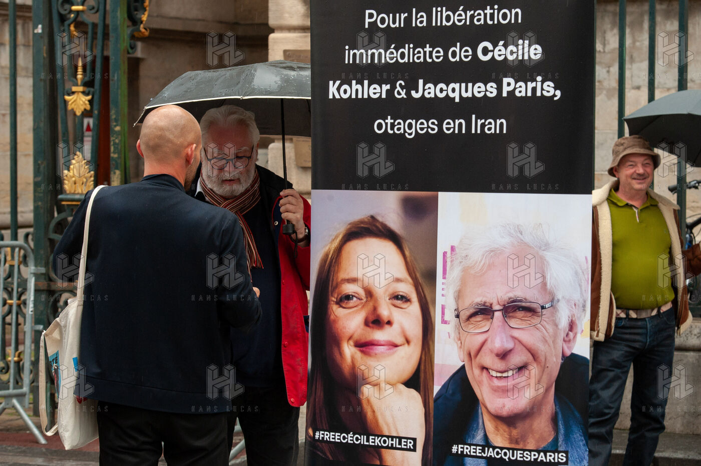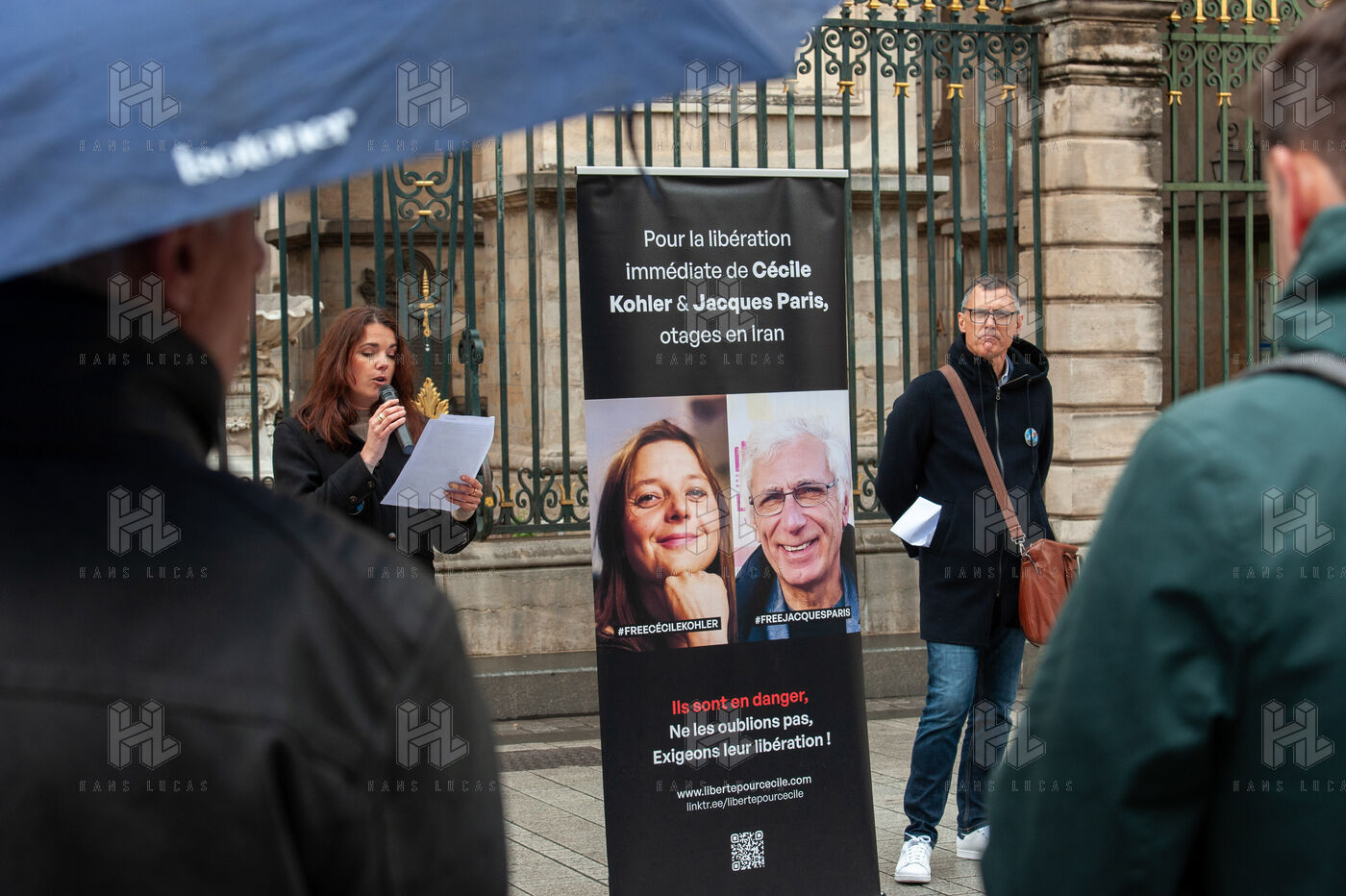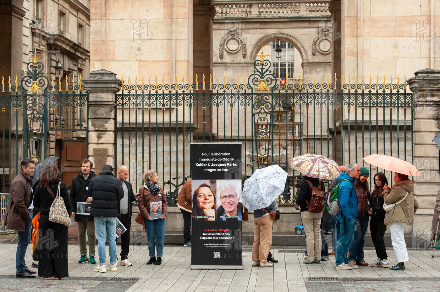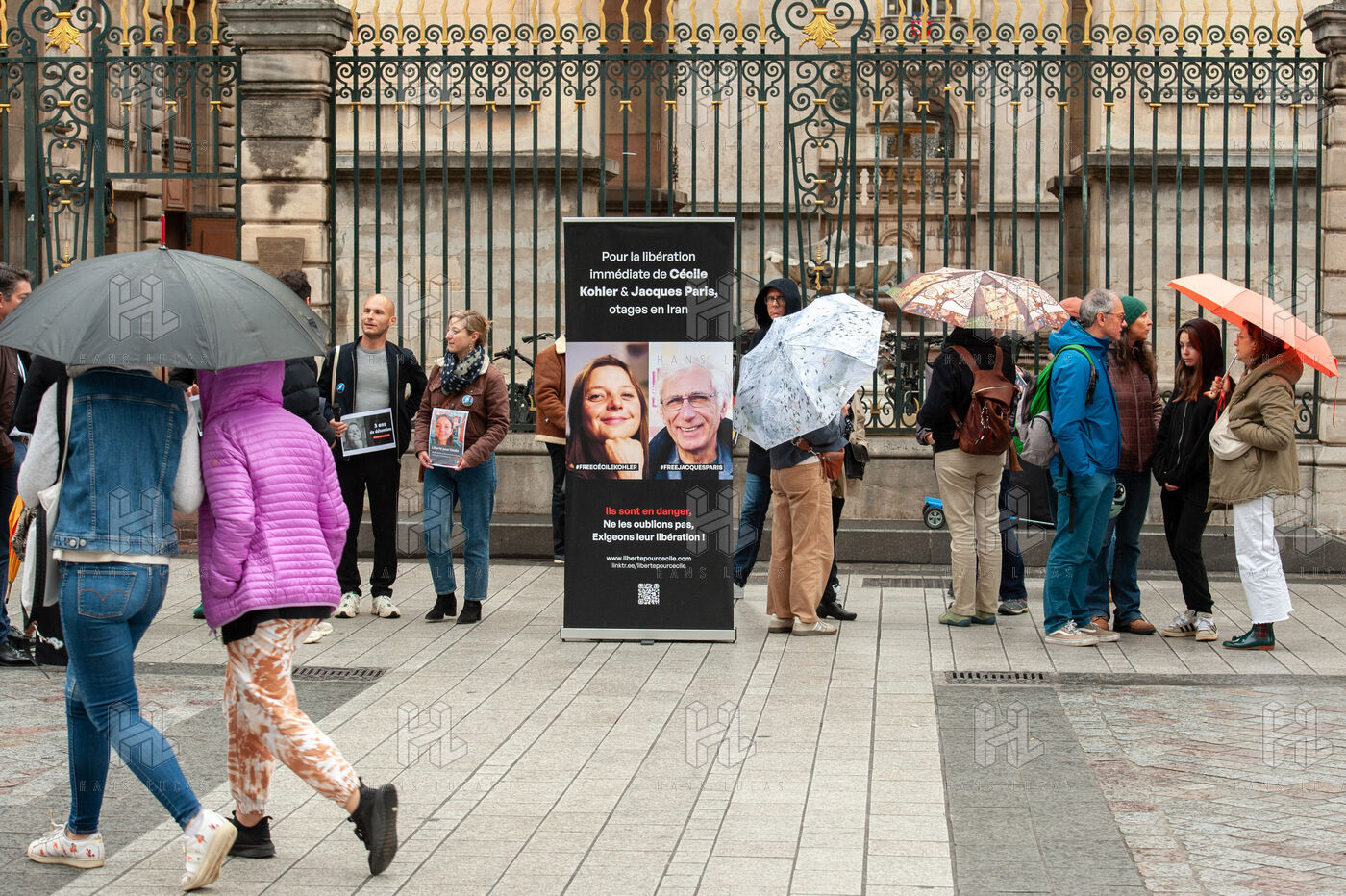 In Lyon, in the Rhône region of France, on May 7, 2025, hundreds of people gather to support two French hostages, Cécile Kohler and Jacques Paris, who have been detained in Iran for three years.