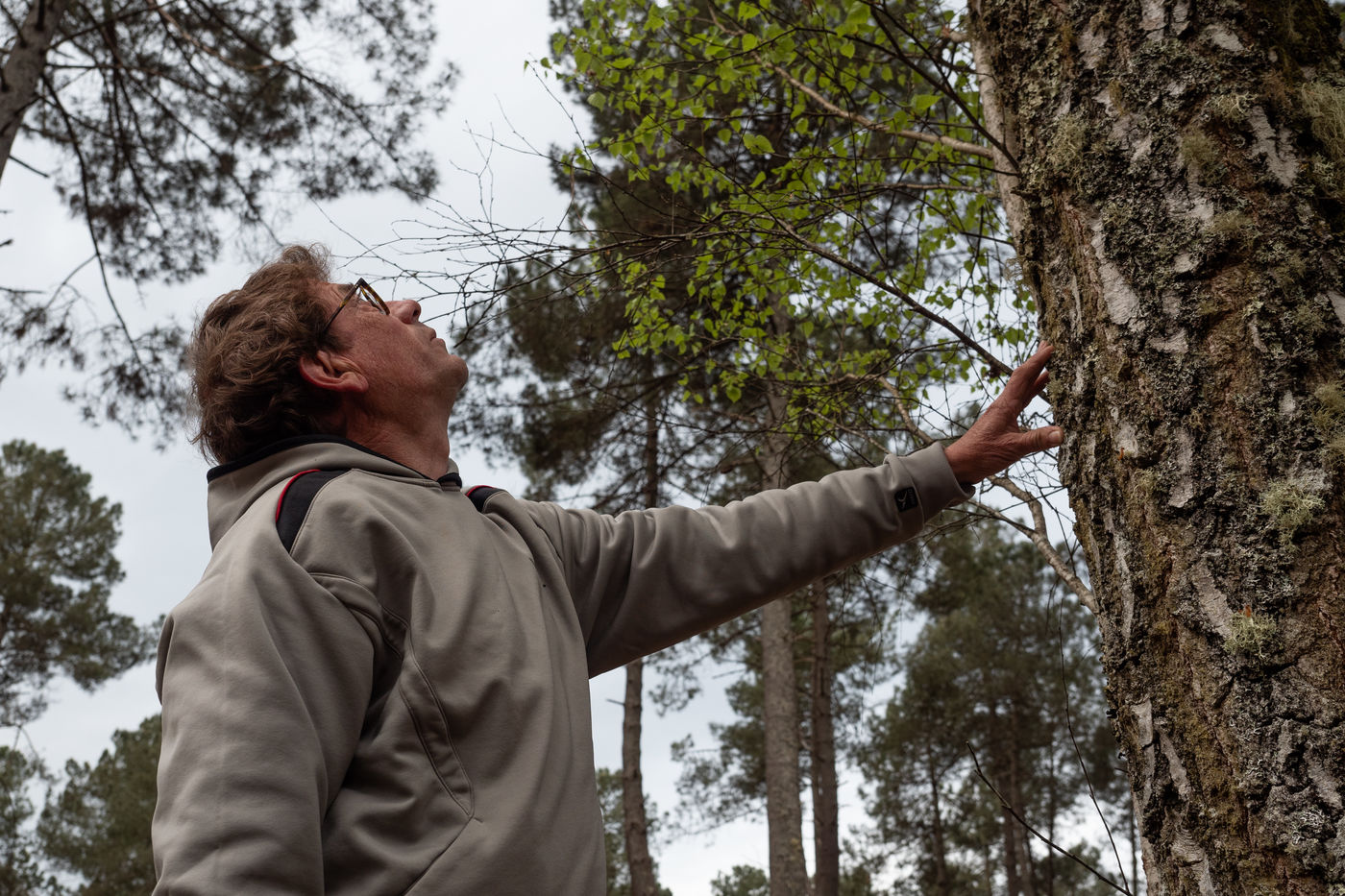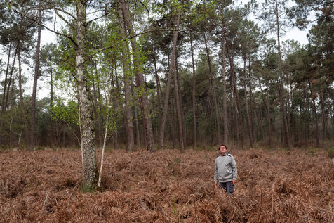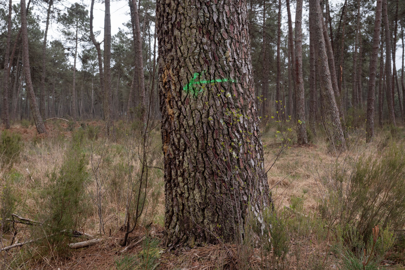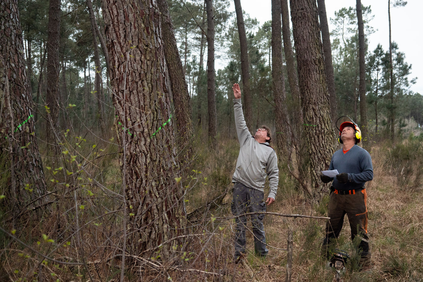 France, Maillas, 2022-04-12. Eric Castex est gestionnaire forestier dans les Landes et travaille avec la méthode Pro Silva. Début avril, il suivait un chantier sur une parcelle de pin maritime natif en futaie irrégulière, dont il est le gestionnaire, pour une coupe d'arbres agés d'environ 80 ans.