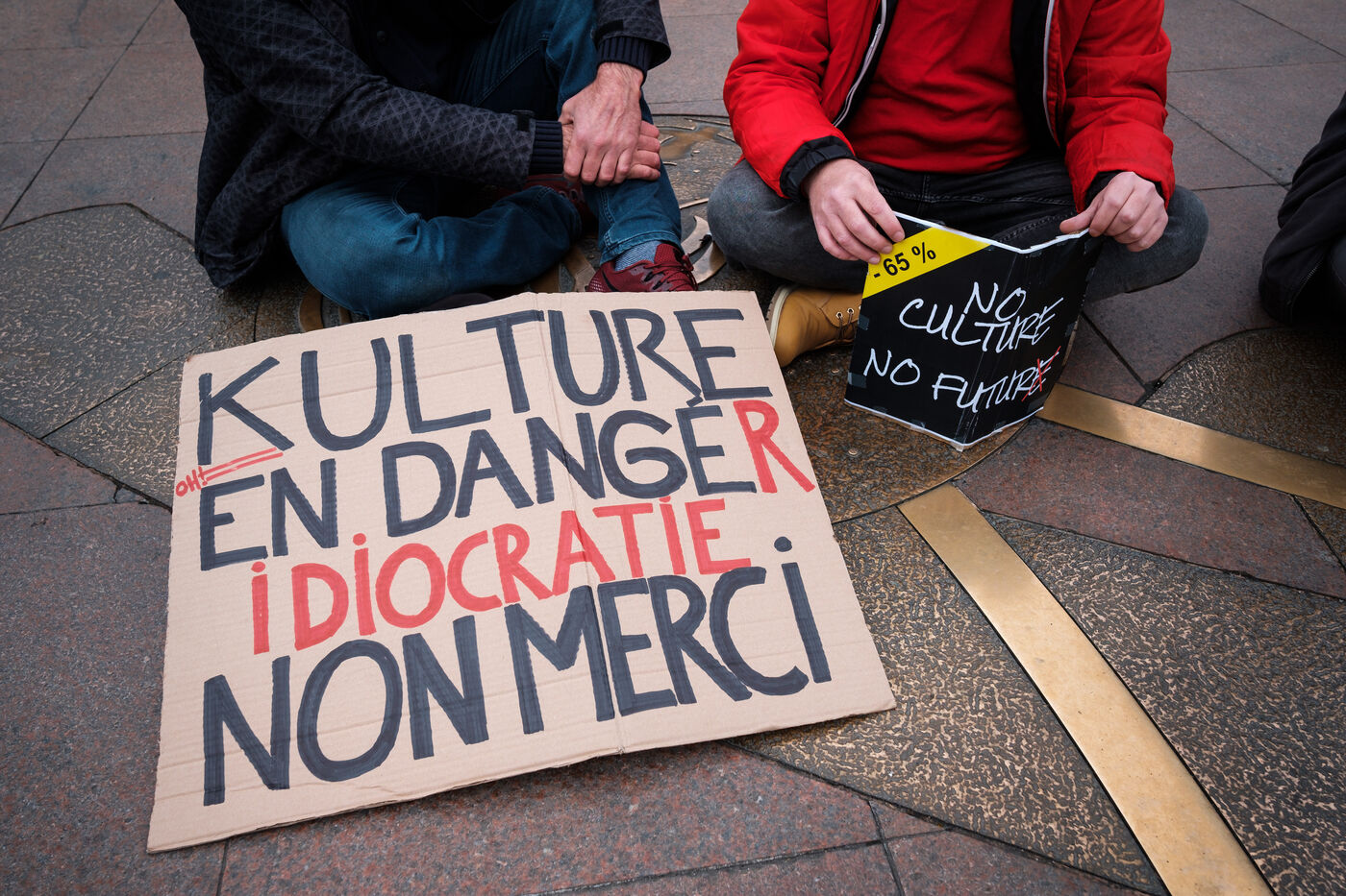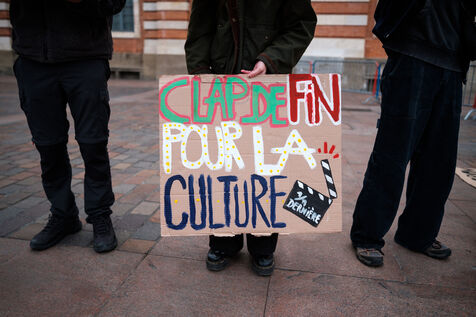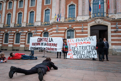 France, Toulouse, 2025-03-27. Rassemblement contre l'austérité et les coupes budgétaires dans la culture et les services public. Plusieurs centaines de personnes du milieu de la culture ont réalisé une manifestation avec un Die in place du Capitole lors de l'entrée du conseil municipal dans la mairie.