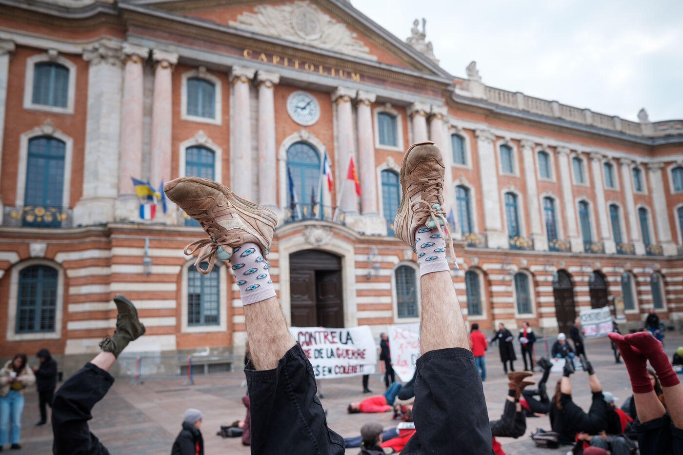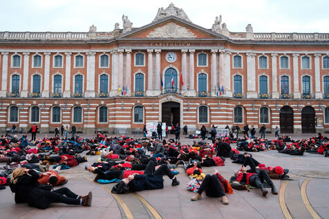 France, Toulouse, 2025-03-27. Rally against austerity and budget cuts in culture and public services. Several hundred people from the cultural sector staged a Die in at Place du Capitole as the city council entered the town hall.