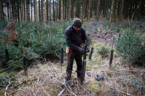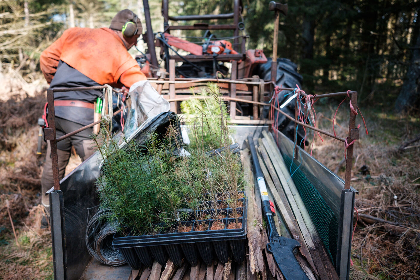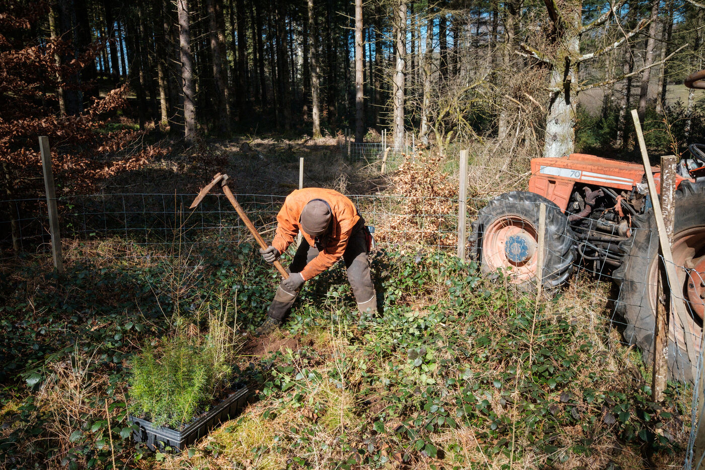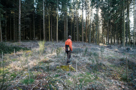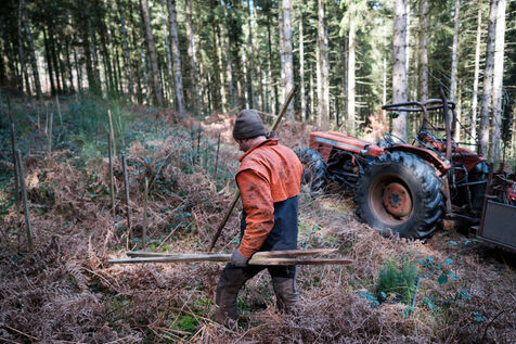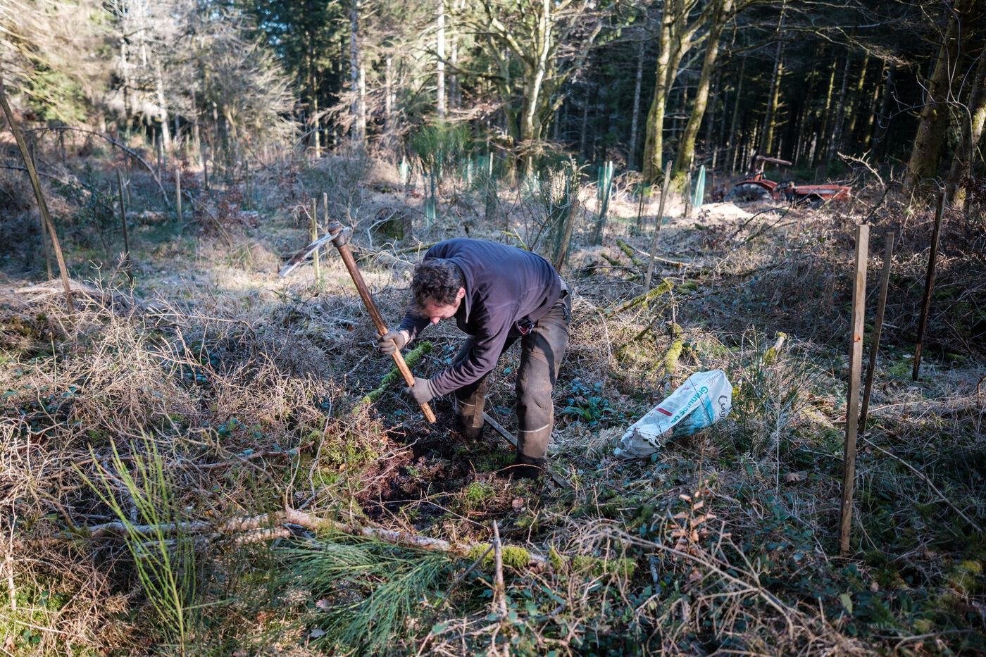France, Tarn, 2025-03-05. Mathias Bonneau est bucheron et gestionnaire forestier. Dans sa forêt il réalise au printemps un chantier de plantation de plusieurs essences d'arbres dans des dispositifs différents pour permettre d'étudier leur évolution au sein de l'écosystème. Des expérimentations qui permettent d'observer les adaptations des individus aux évolutions écologiques et climatiques dans une forêt diversifiée à couvert continu.