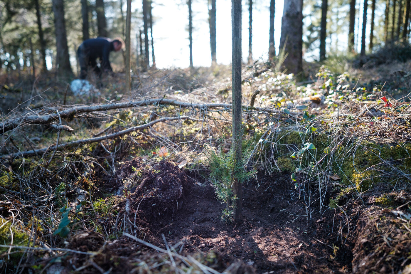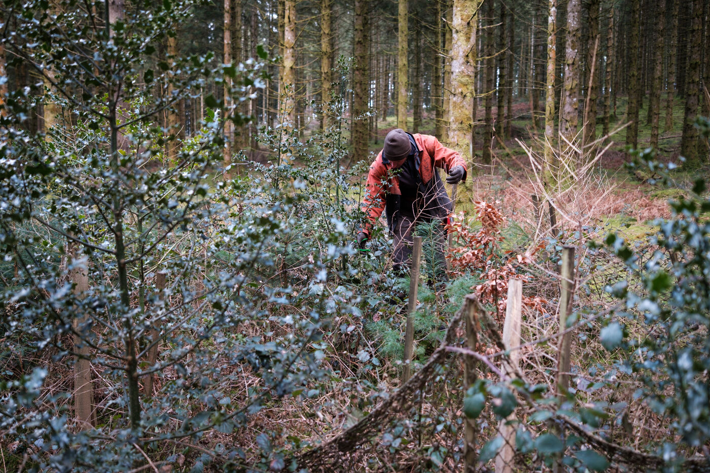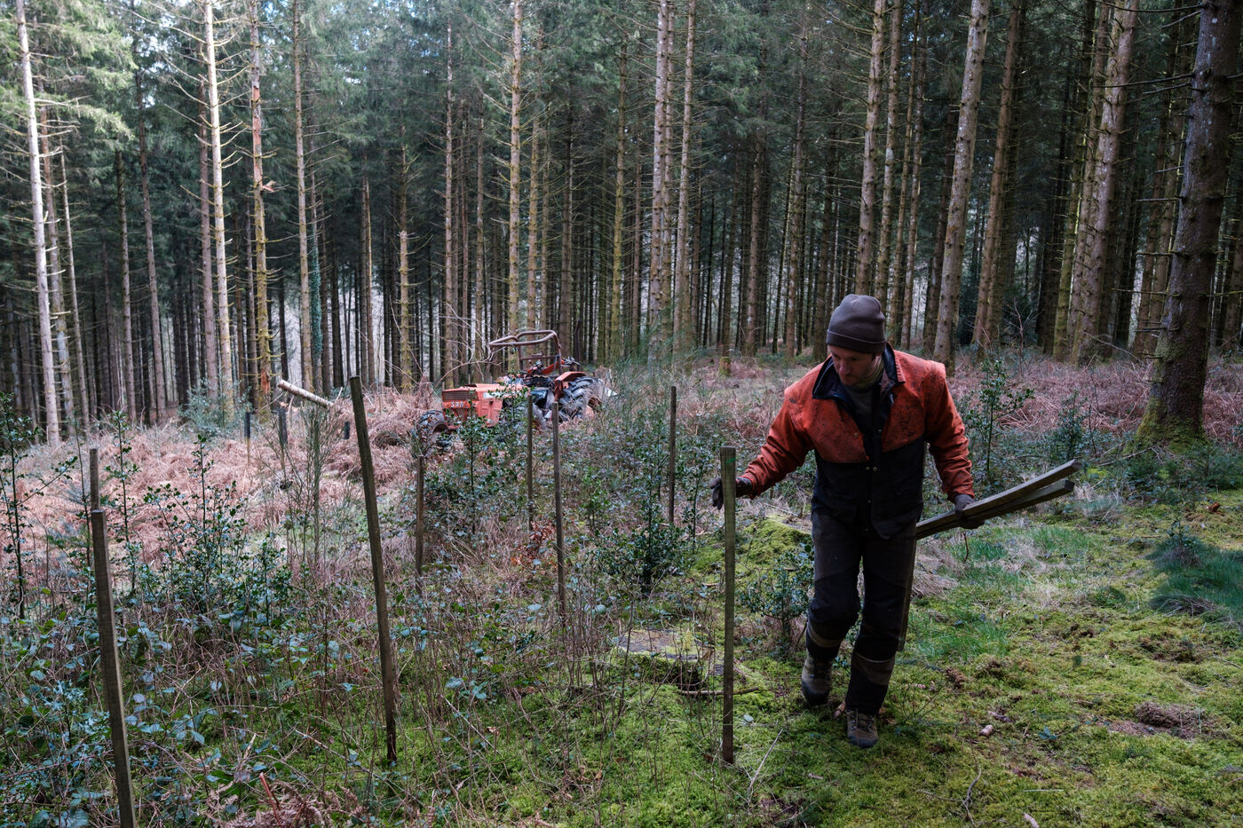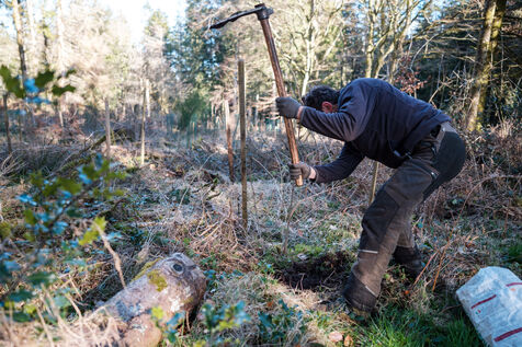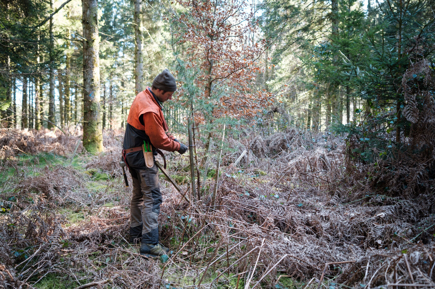 France, Tarn, 2025-03-05. Mathias Bonneau est bucheron et gestionnaire forestier. Dans sa forêt il réalise au printemps un chantier de plantation de plusieurs essences d'arbres dans des dispositifs différents pour permettre d'étudier leur évolution au sein de l'écosystème. Des expérimentations qui permettent d'observer les adaptations des individus aux évolutions écologiques et climatiques dans une forêt diversifiée à couvert continu.