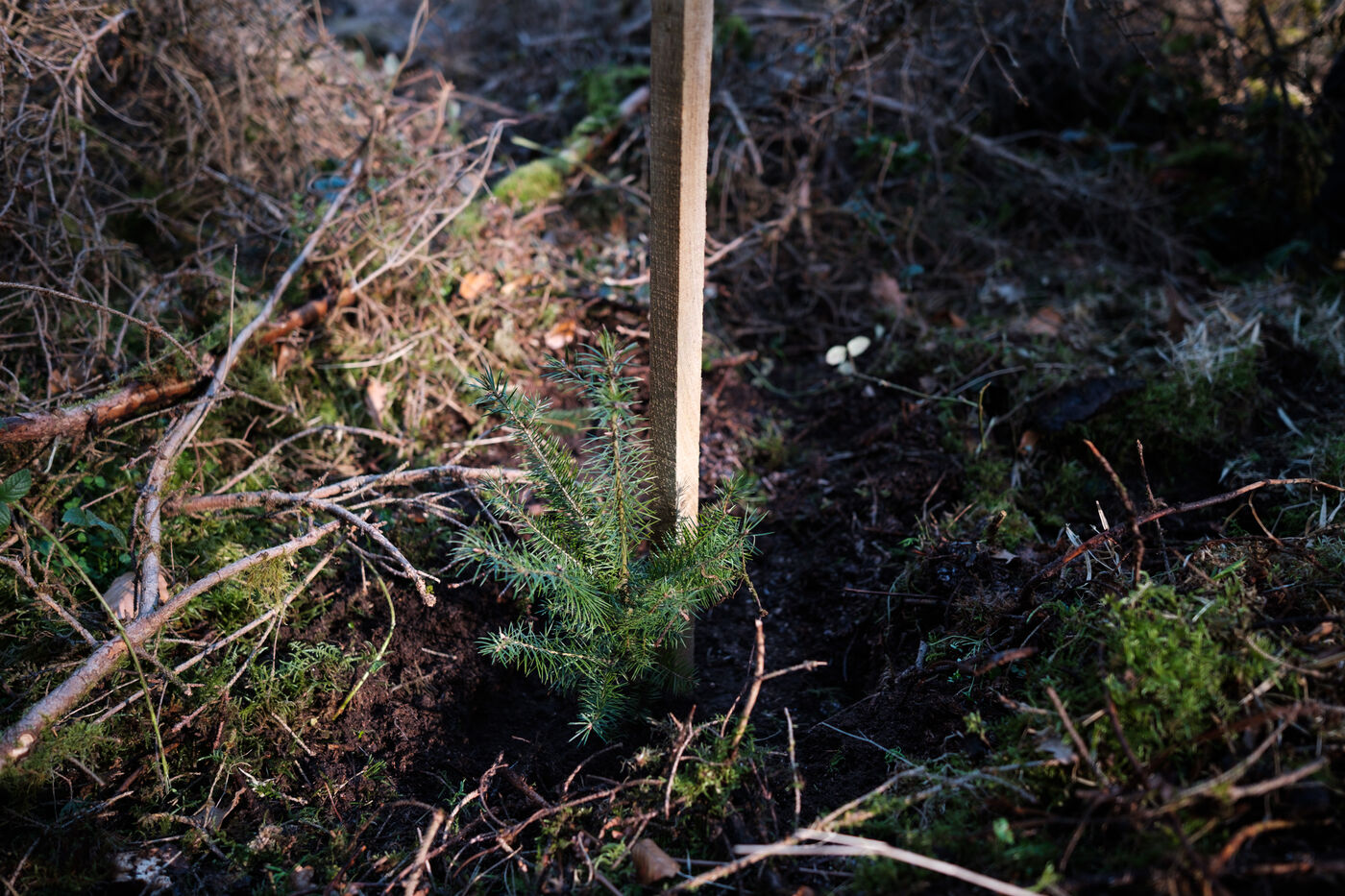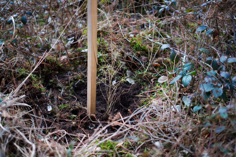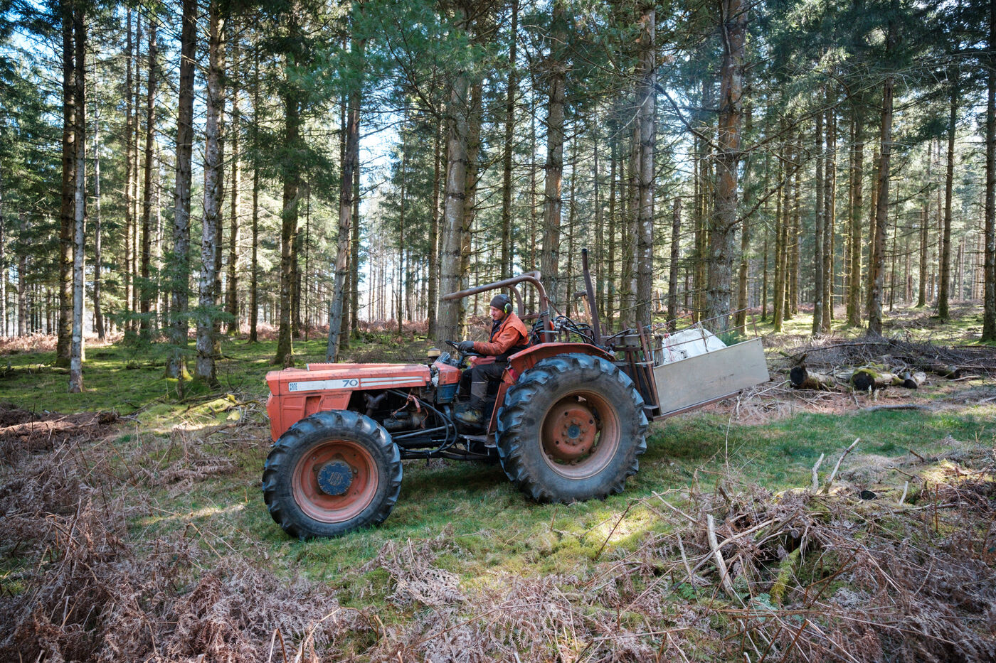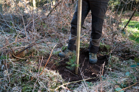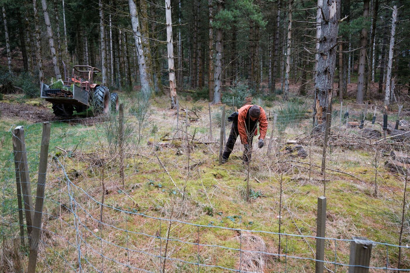 France, Tarn, 2025-03-05. Mathias Bonneau est bucheron et gestionnaire forestier. Dans sa forêt il réalise au printemps un chantier de plantation de plusieurs essences d'arbres dans des dispositifs différents pour permettre d'étudier leur évolution au sein de l'écosystème. Des expérimentations qui permettent d'observer les adaptations des individus aux évolutions écologiques et climatiques dans une forêt diversifiée à couvert continu.