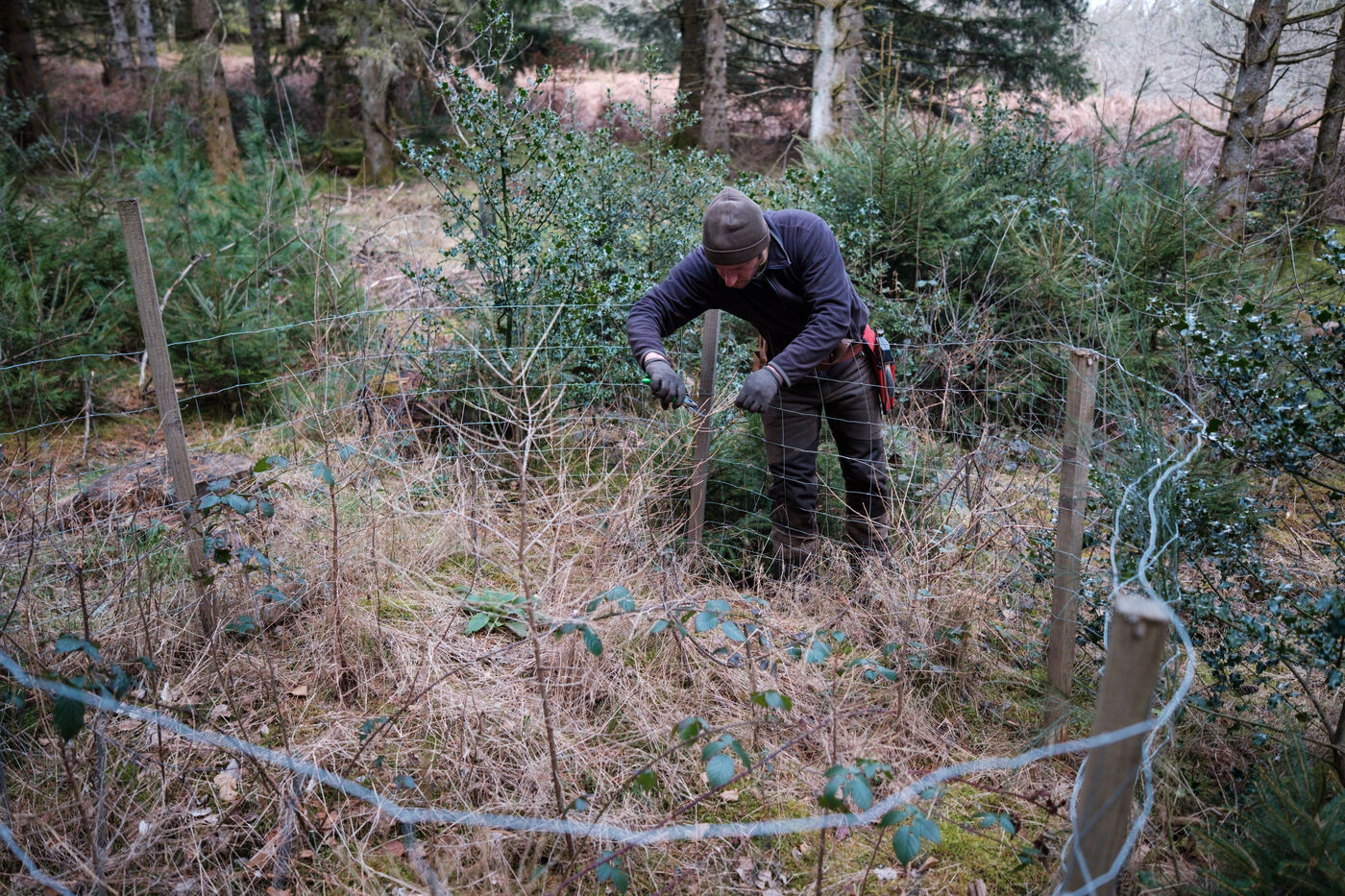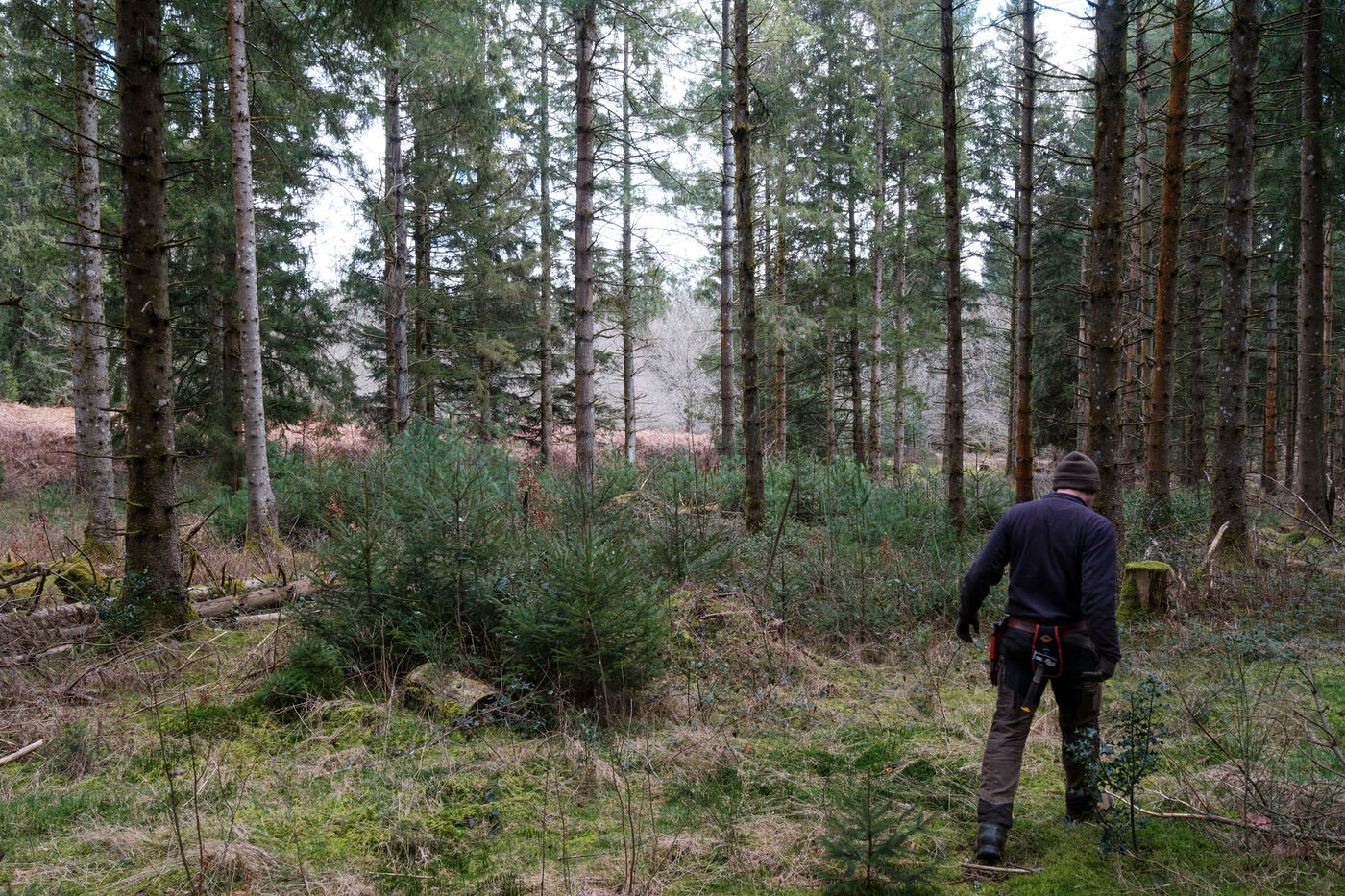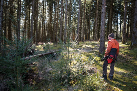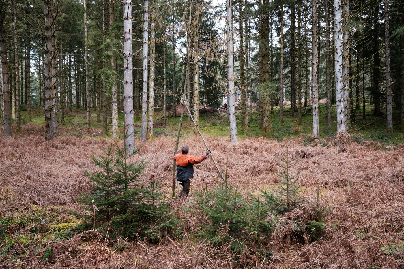 France, Tarn, 2025-03-05. Mathias Bonneau is a lumberjack and forest manager. Every spring, he plants several species of trees in his forest, using different systems to study their evolution within the ecosystem. These experiments enable us to observe how individuals adapt to ecological and climatic changes in a diversified forest with a continuous canopy.