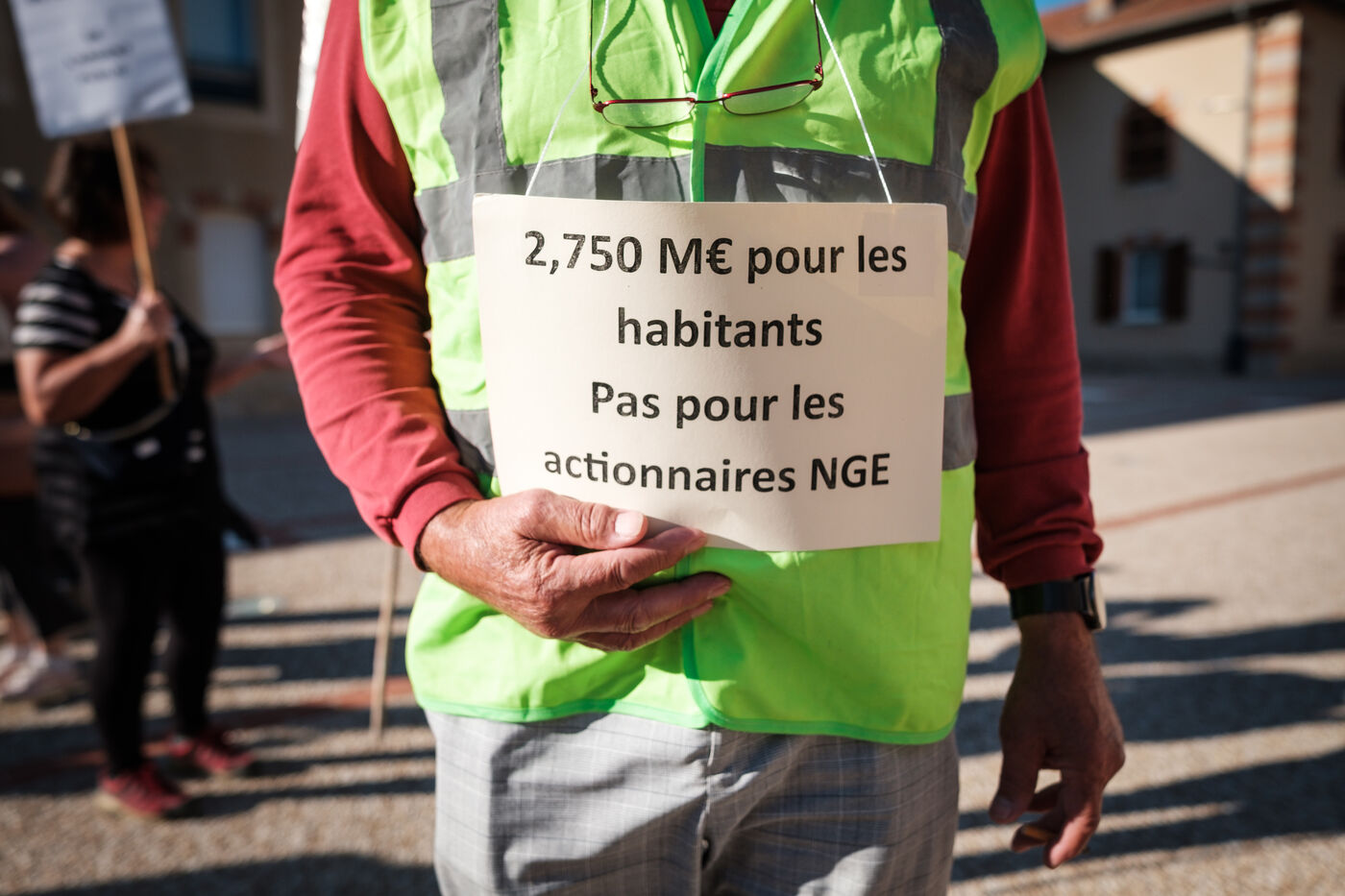 Manifestation des opposants à l'autoroute A69 lors du conseil d'agglomération Castres-Mazamet où se tient le vote pour attribuer une nouvelle subvention publique de l'agglomération au concessionnaire Atosca en contre partie d'une baisse du prix du péage, à Castres dans le département du Tarn dans le sud de la France, le 30 septembre 2025. Une subvention publique totale de 41 millions d'euros dont la communauté d'agglomération participe a hauteur de 2,750 millions d'euros.