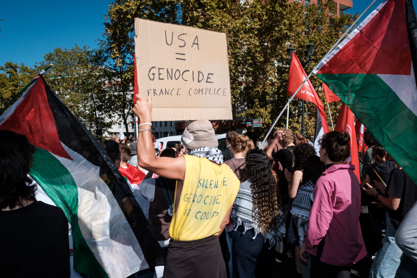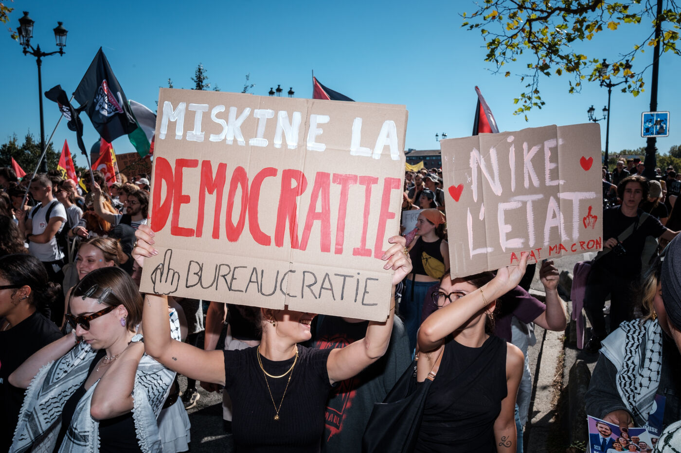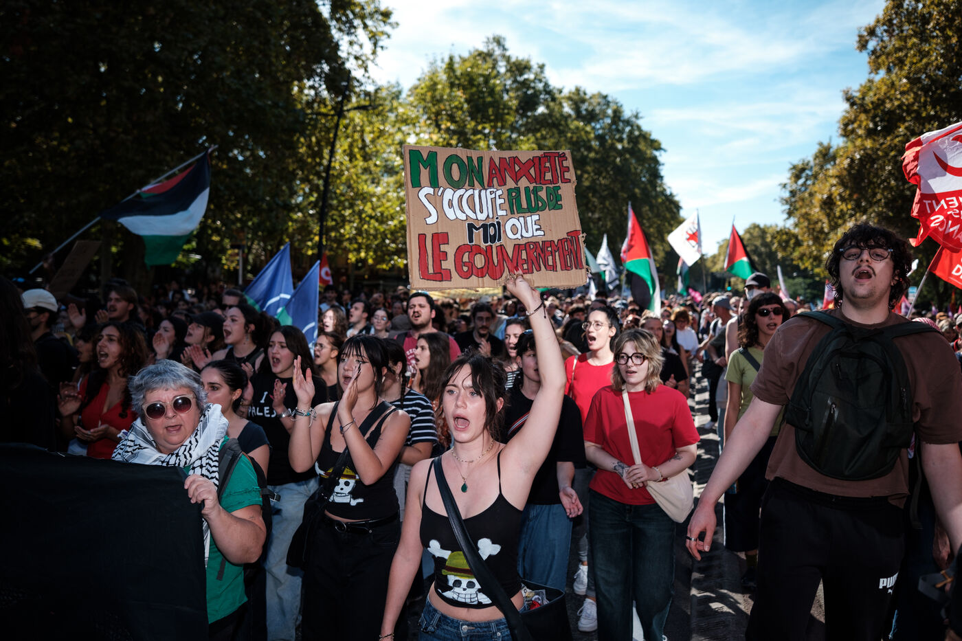 Inter-union demonstration by the “block everything” movement, act 3, in Toulouse, with mobilization in support of the Global Sumud Flotilla in Toulouse, Occitanie, France, on October 2, 2025.