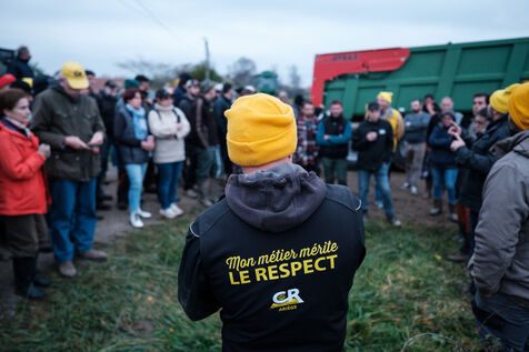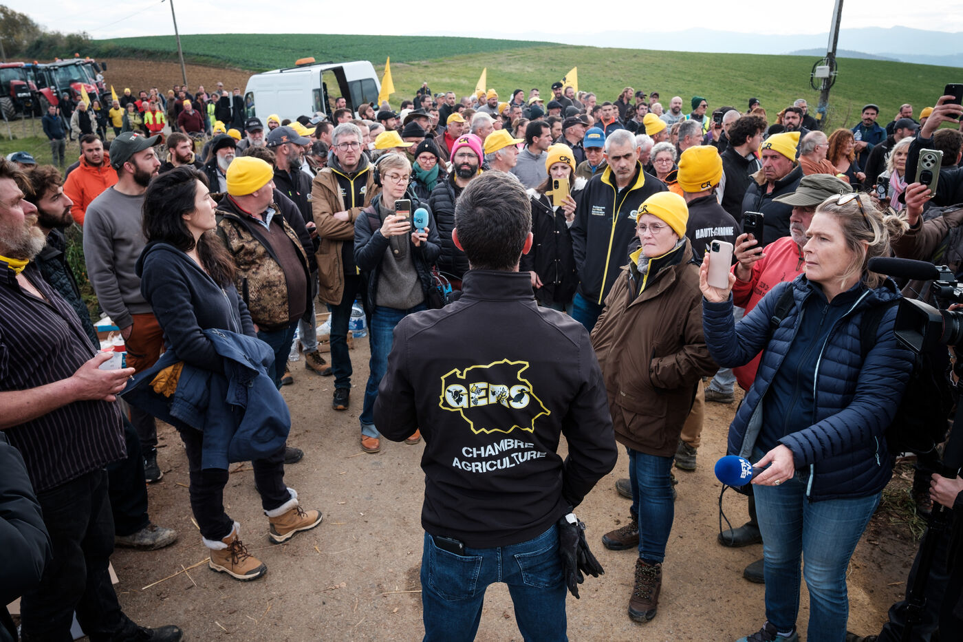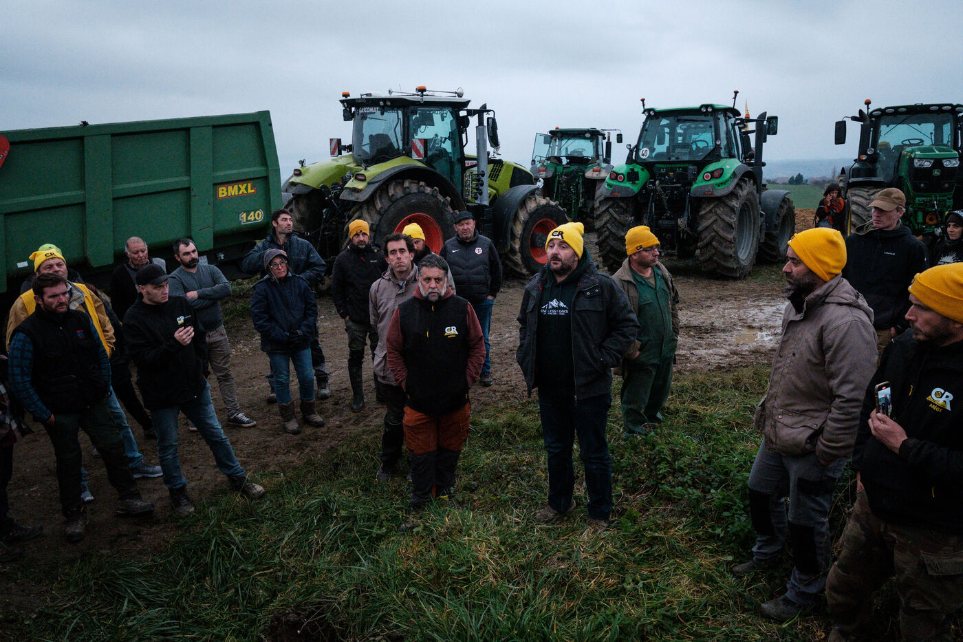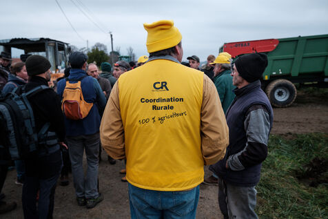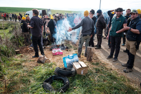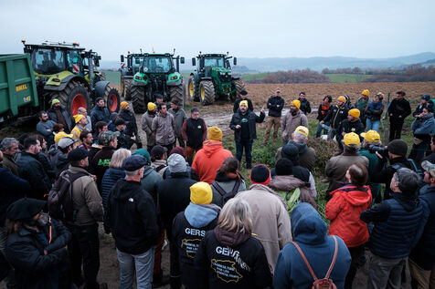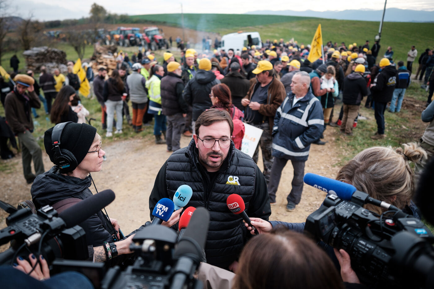 Mobilization of farmers from the Confédération Paysanne and Coordination Rurale from numerous departments who came together in solidarity to oppose the slaughter of more than 200 cows on a farm affected by the DNC in Les Bordes-sur-Arize, Ariège, Occitanie, France, on December 10, 2025.