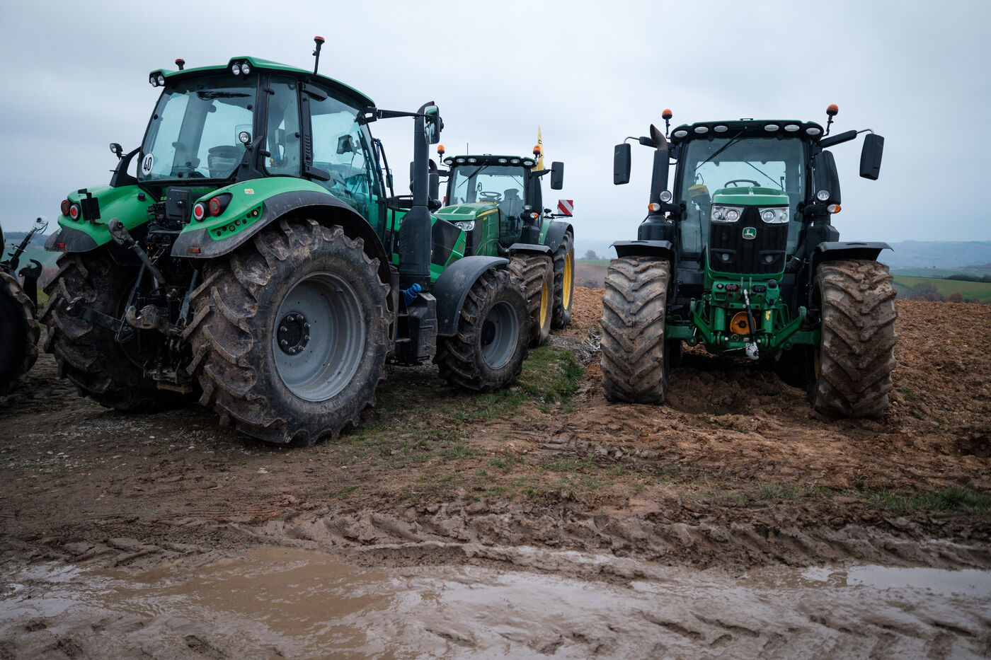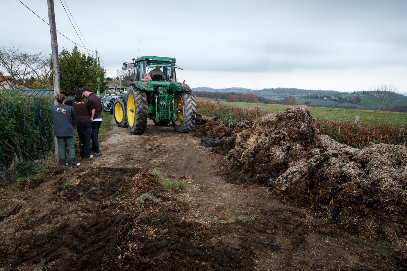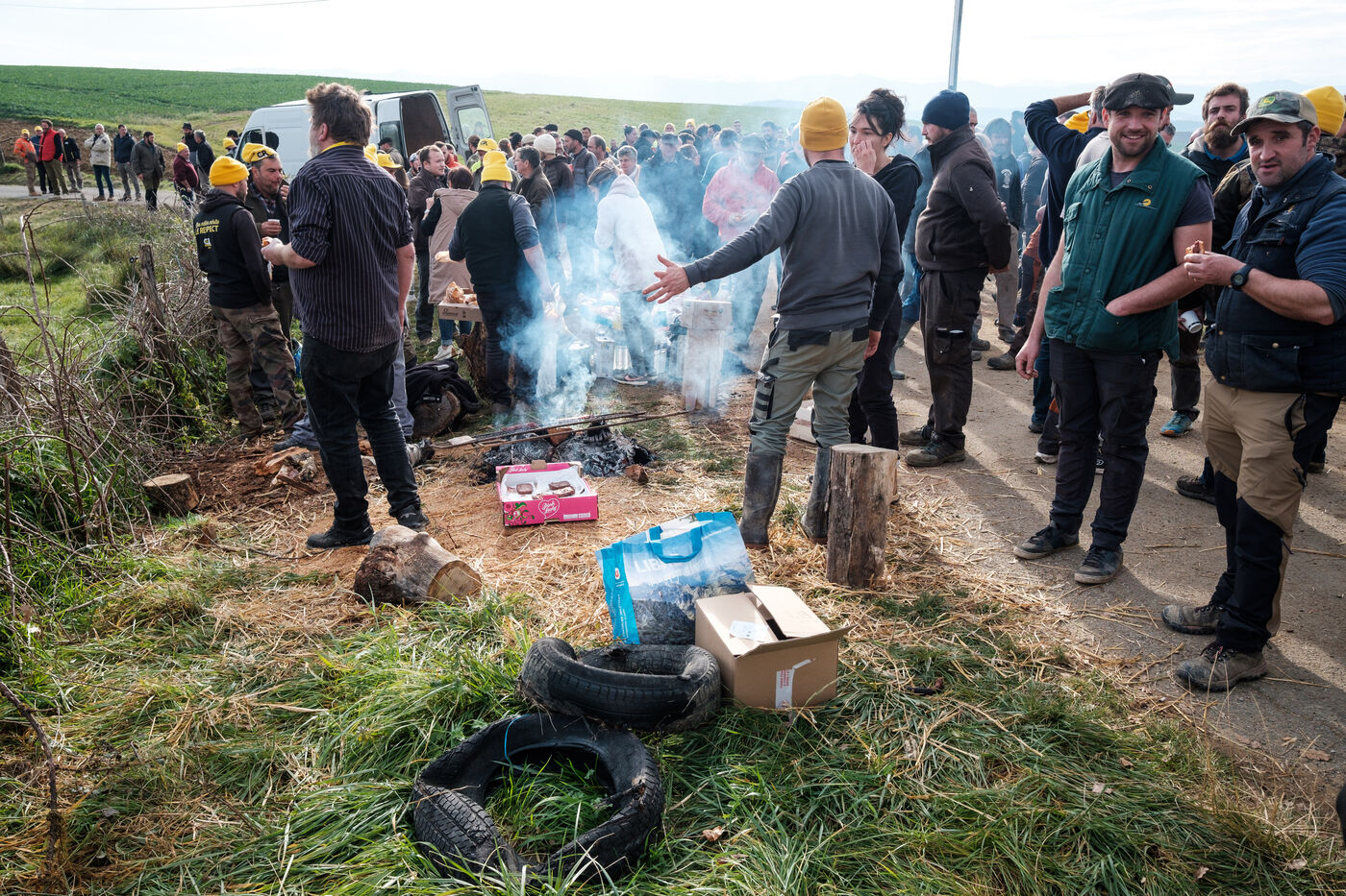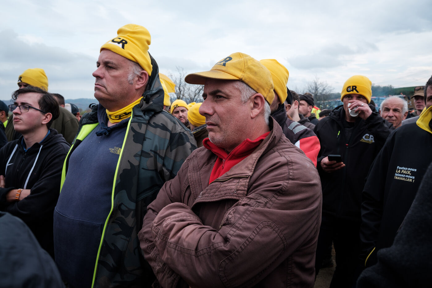 Mobilization of farmers from the Confédération Paysanne and Coordination Rurale from numerous departments who came together in solidarity to oppose the slaughter of more than 200 cows on a farm affected by the DNC in Les Bordes-sur-Arize, Ariège, Occitanie, France, on December 10, 2025.
