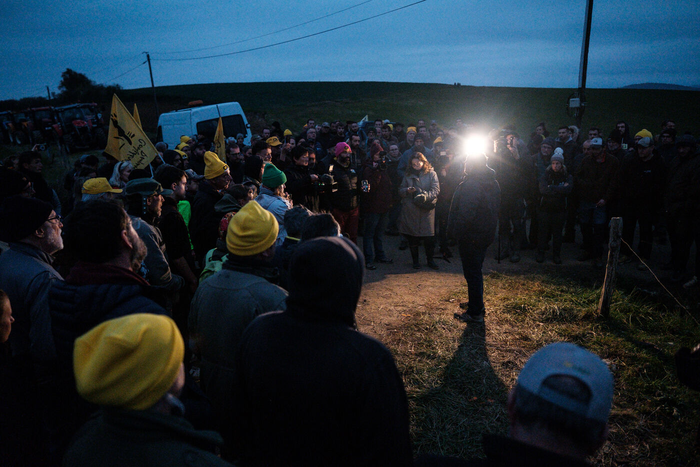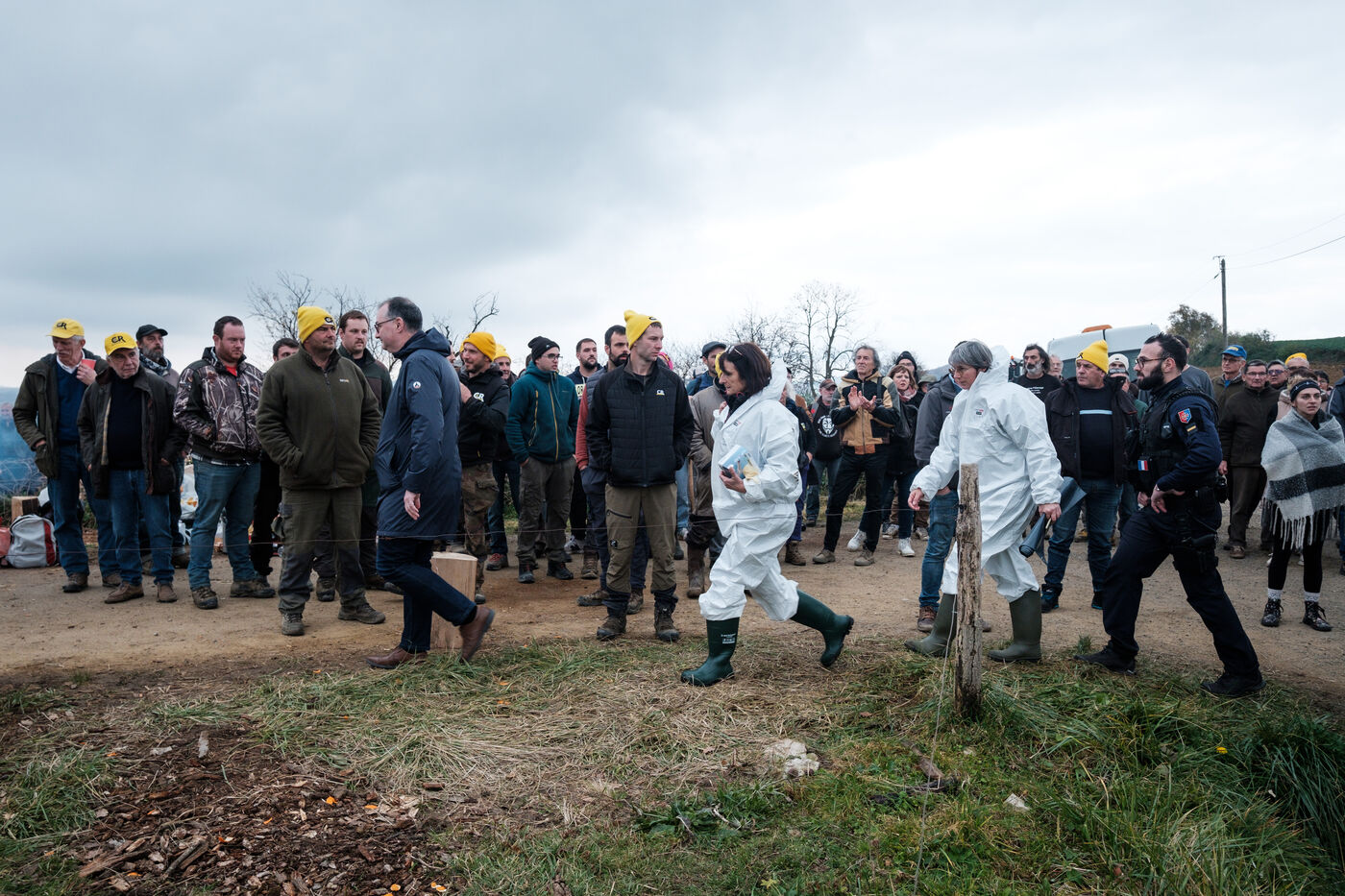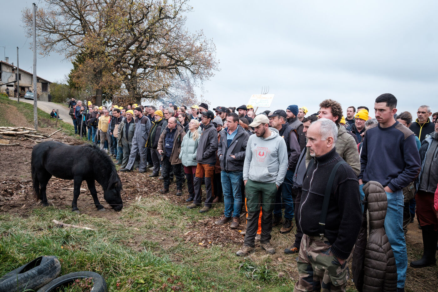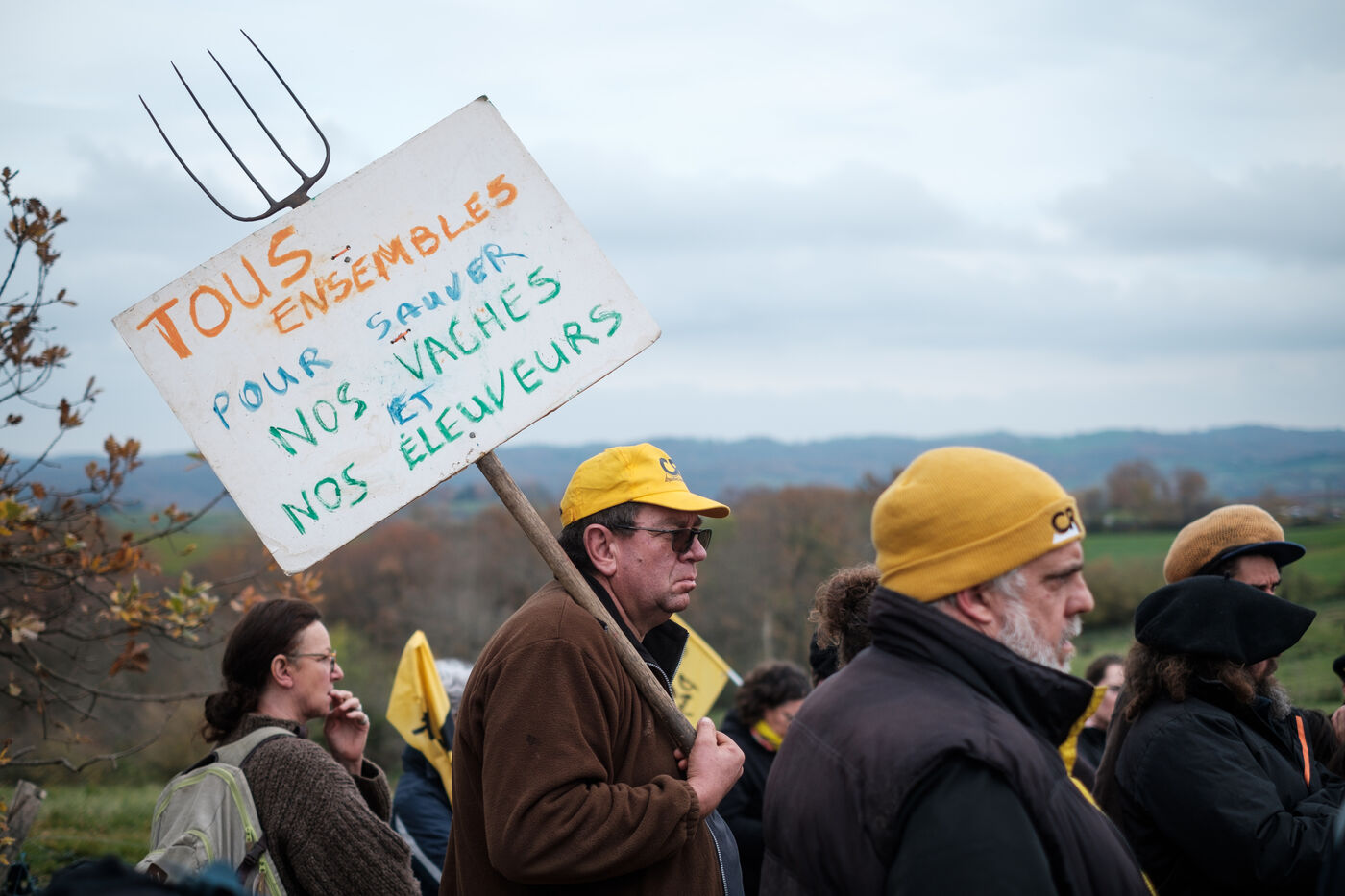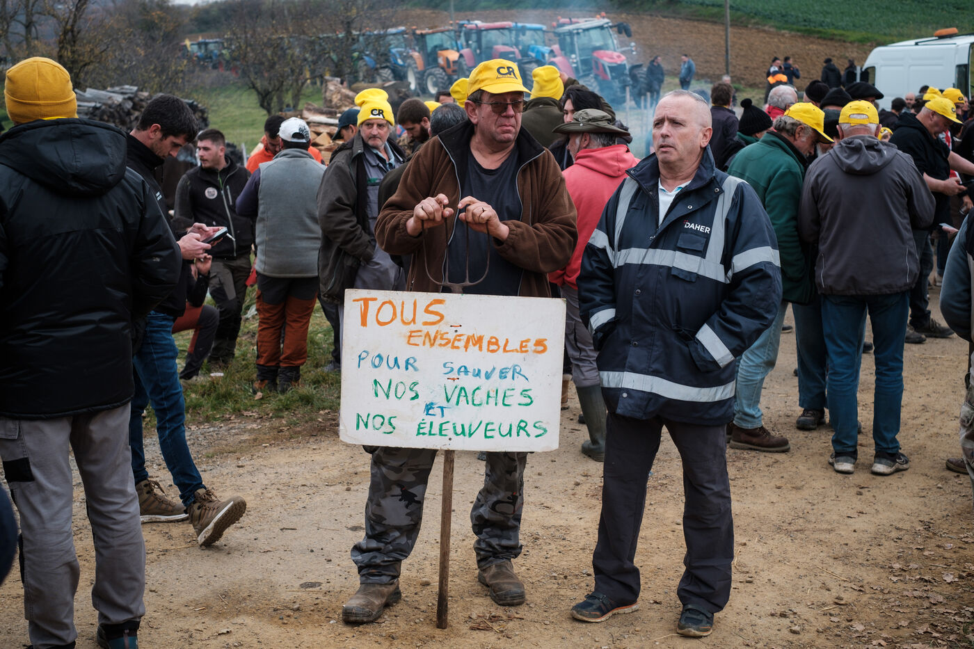 Mobilisation d'agriculteurs de la Confédération Paysanne et Coordination Rurale de nombreux départements venu en solidarité pour s'opposer à l'abattage total de plus de 200 vaches dans une ferme concernée par la DNC à Les Bordes-sur-Arize, en Ariège, en Occitanie, France, le 10 décembre 2025.