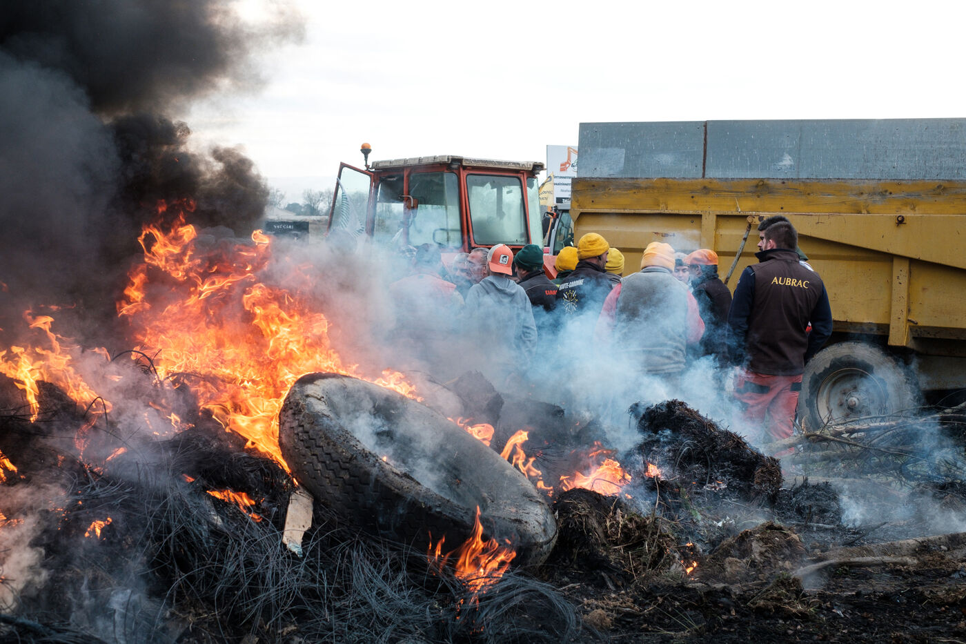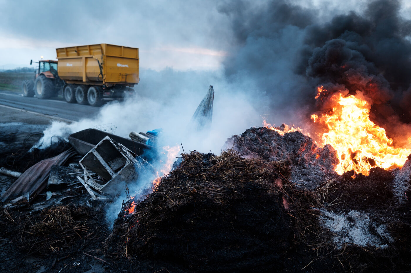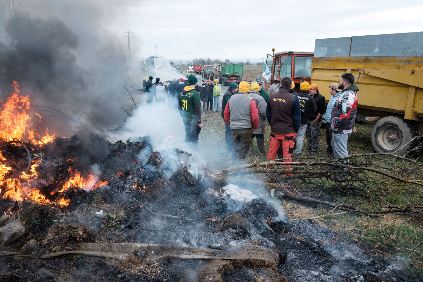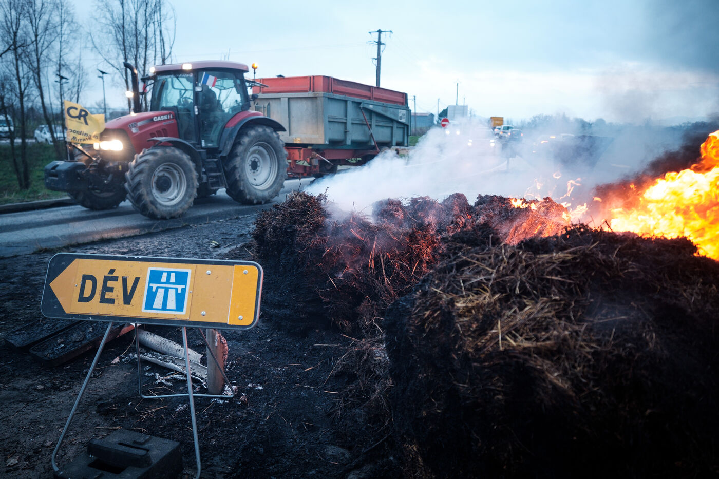 Blockade by farmers from Coordination rurale, Confédération paysanne and FNSEA (FDSEA 31) on the A64 motorway at Cazères in Haute-Garonne, Occitanie, France, on 30 December 2025. This protest is part of the campaign against the government's policy of culling cattle infected with CND (contagious nodular dermatitis).