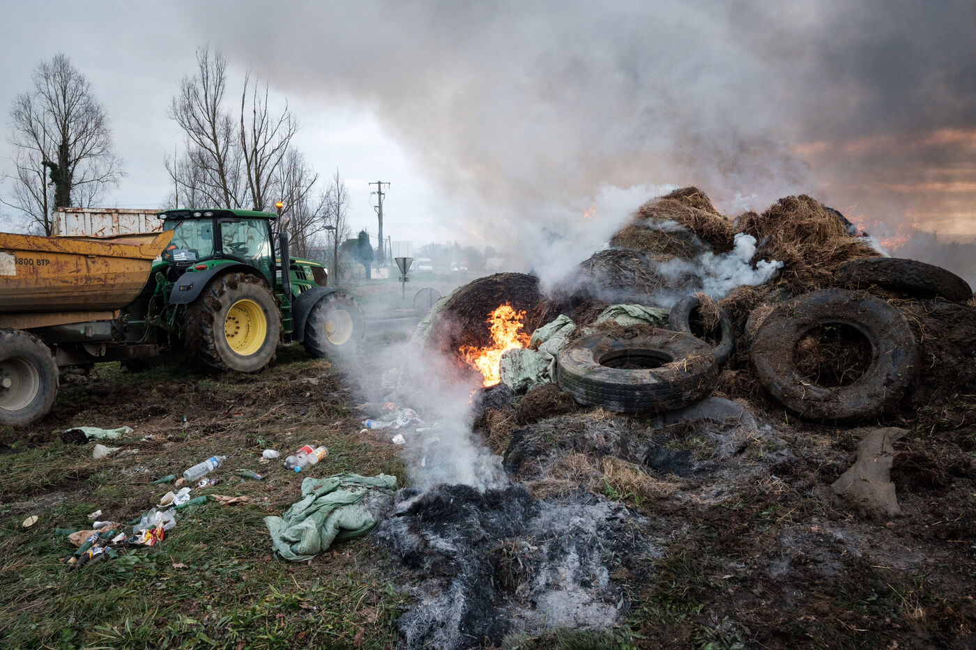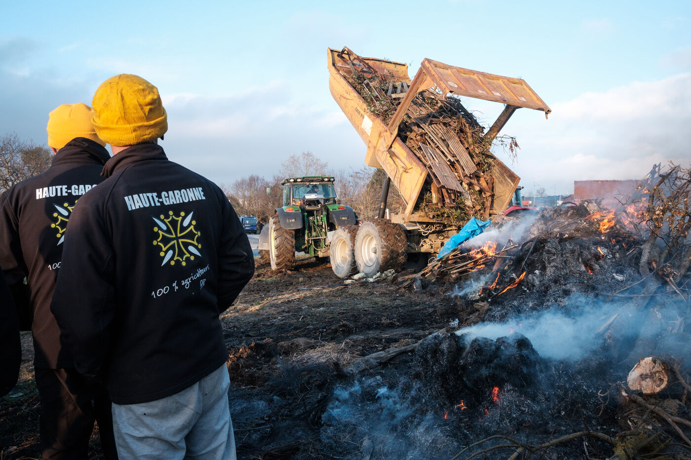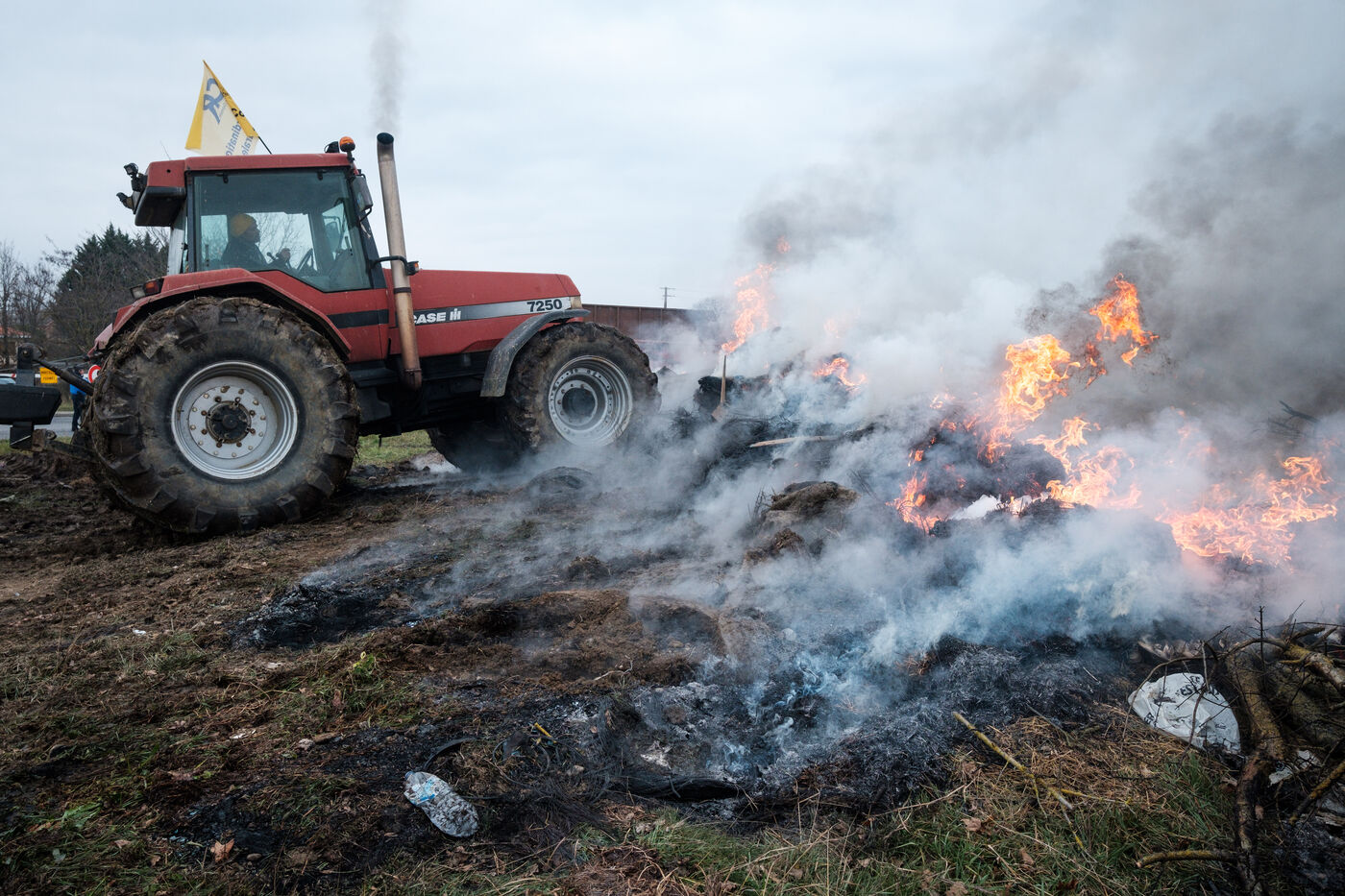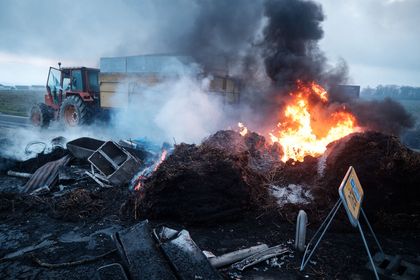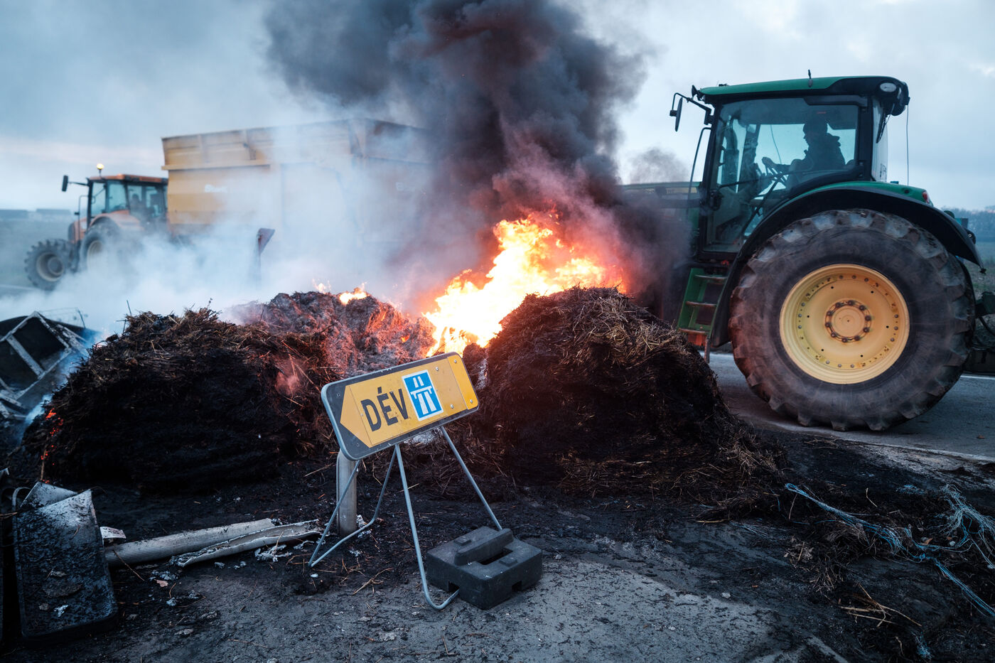 Blockade by farmers from Coordination rurale, Confédération paysanne and FNSEA (FDSEA 31) on the A64 motorway at Cazères in Haute-Garonne, Occitanie, France, on 30 December 2025. This protest is part of the campaign against the government's policy of culling cattle infected with CND (contagious nodular dermatitis).