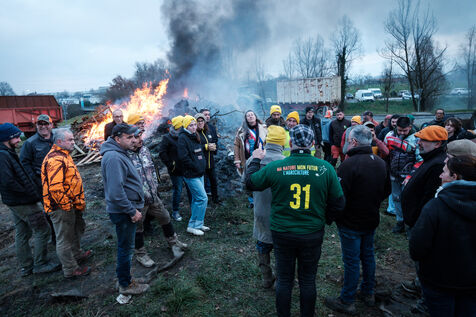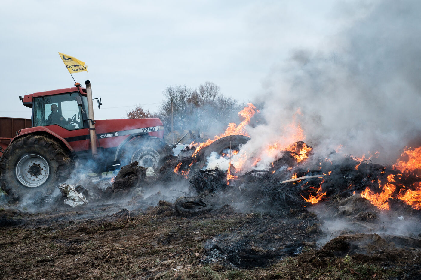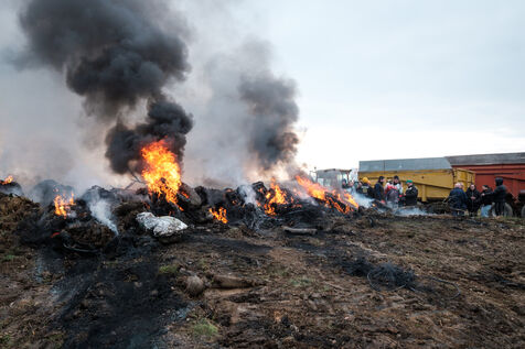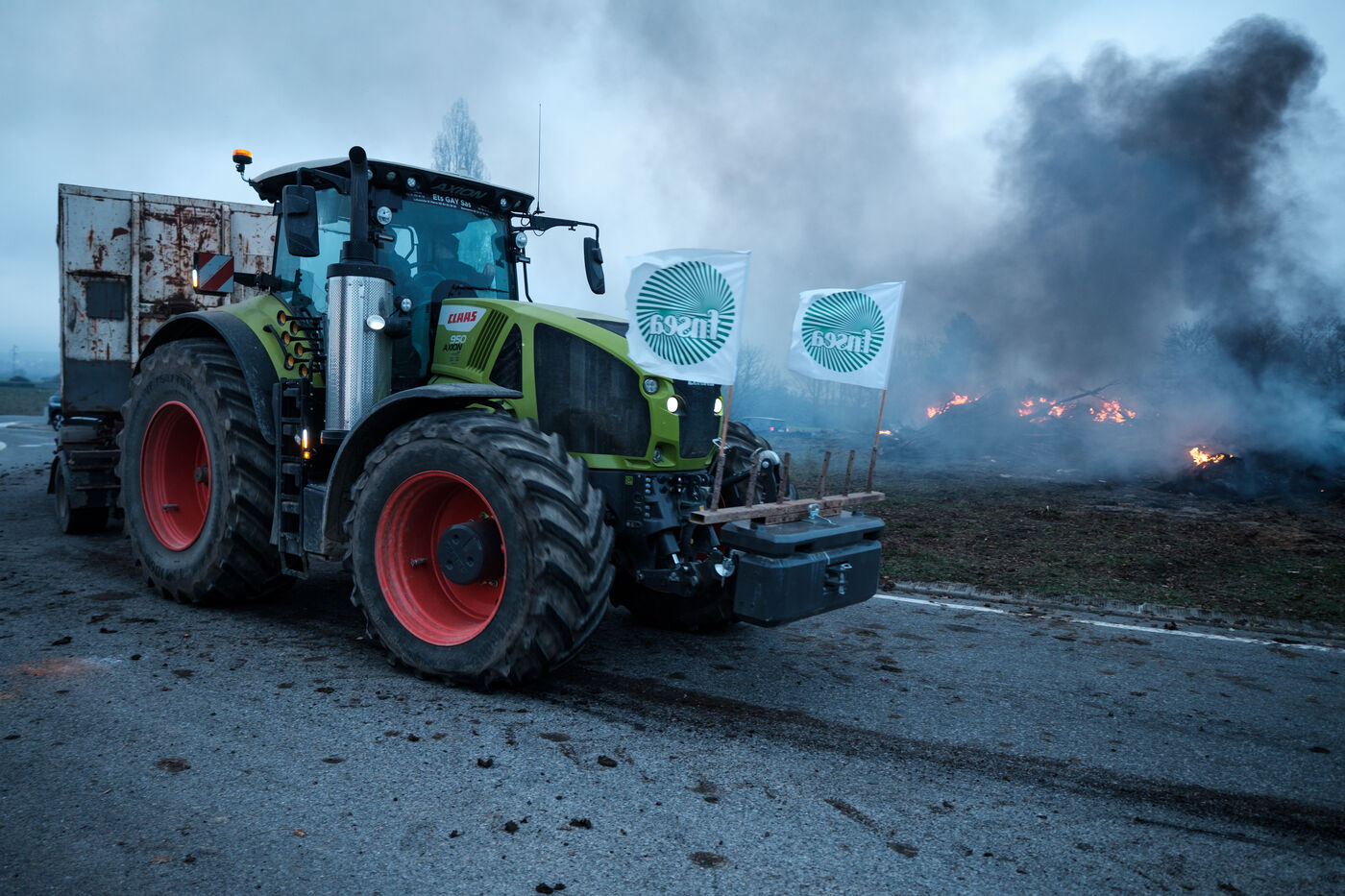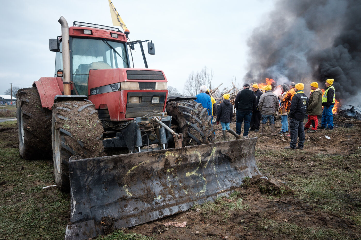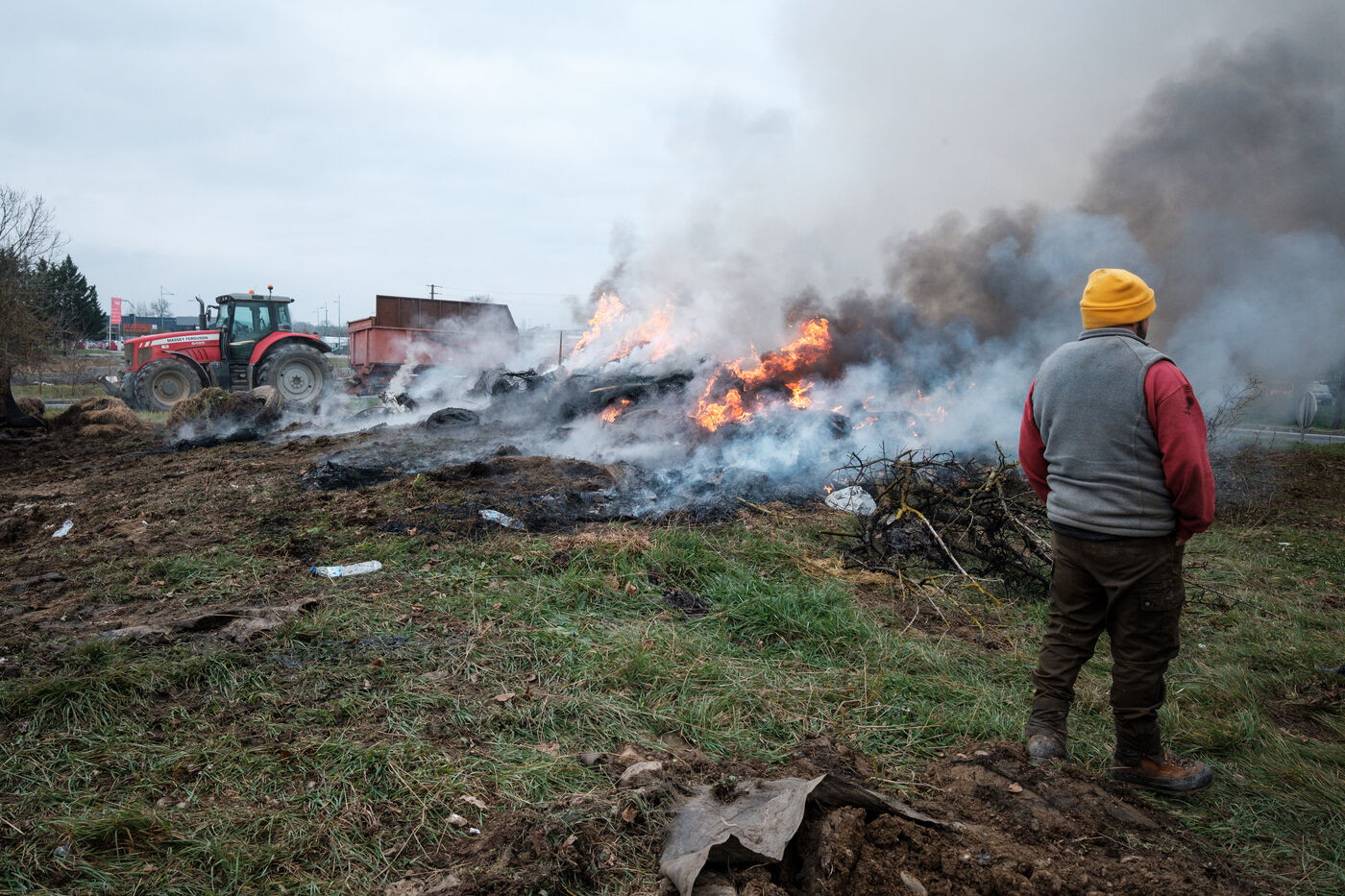 Blockade by farmers from Coordination rurale, Confédération paysanne and FNSEA (FDSEA 31) on the A64 motorway at Cazères in Haute-Garonne, Occitanie, France, on 30 December 2025. This protest is part of the campaign against the government's policy of culling cattle infected with CND (contagious nodular dermatitis).