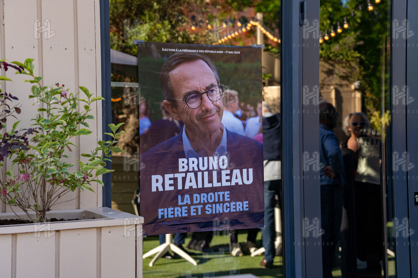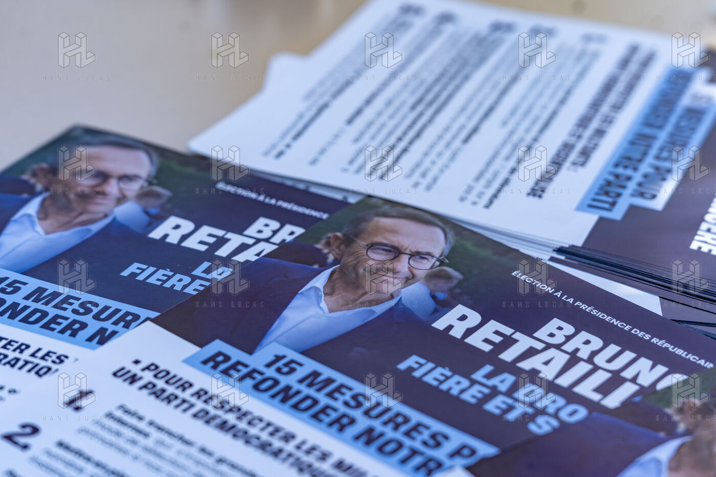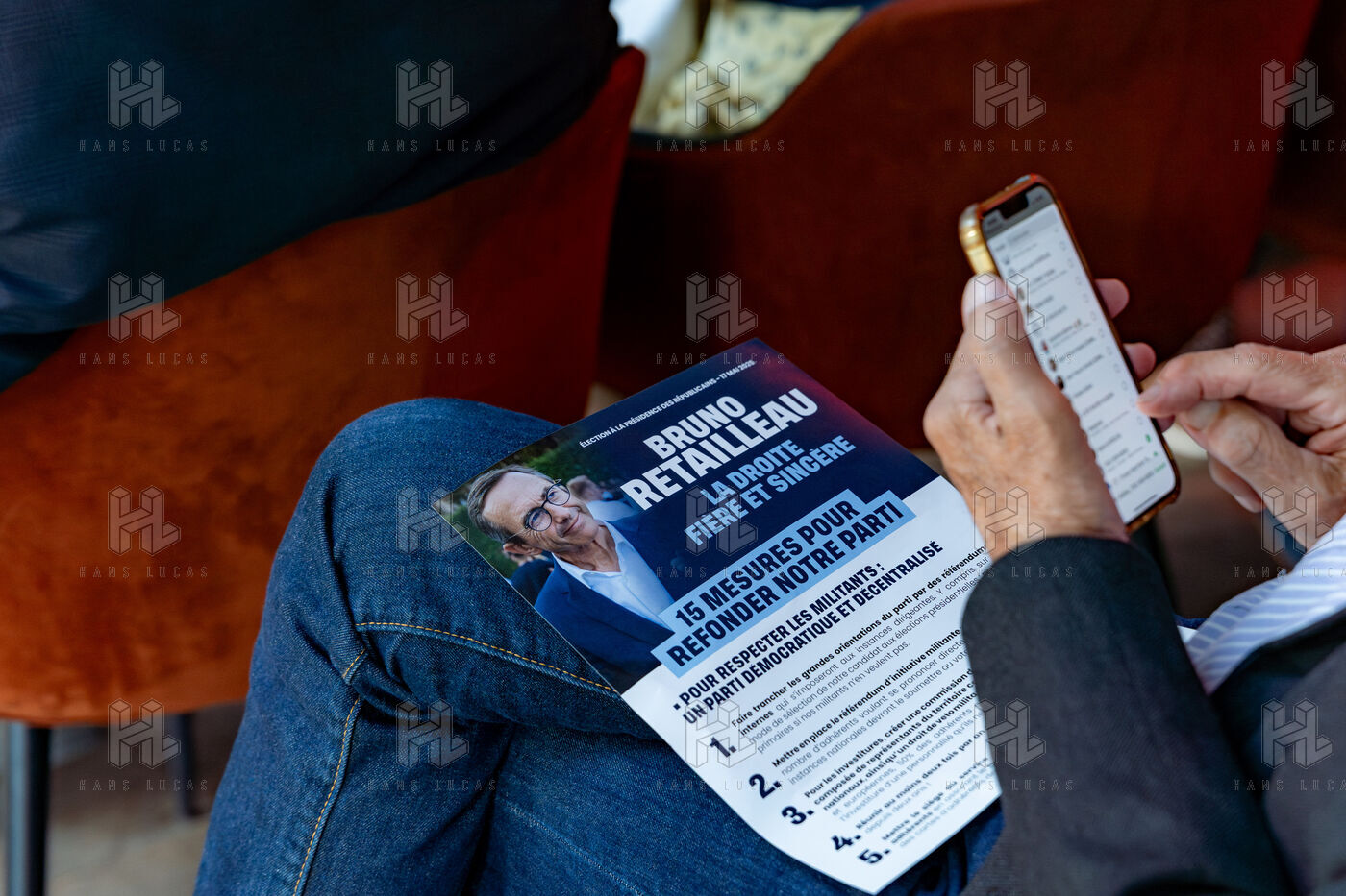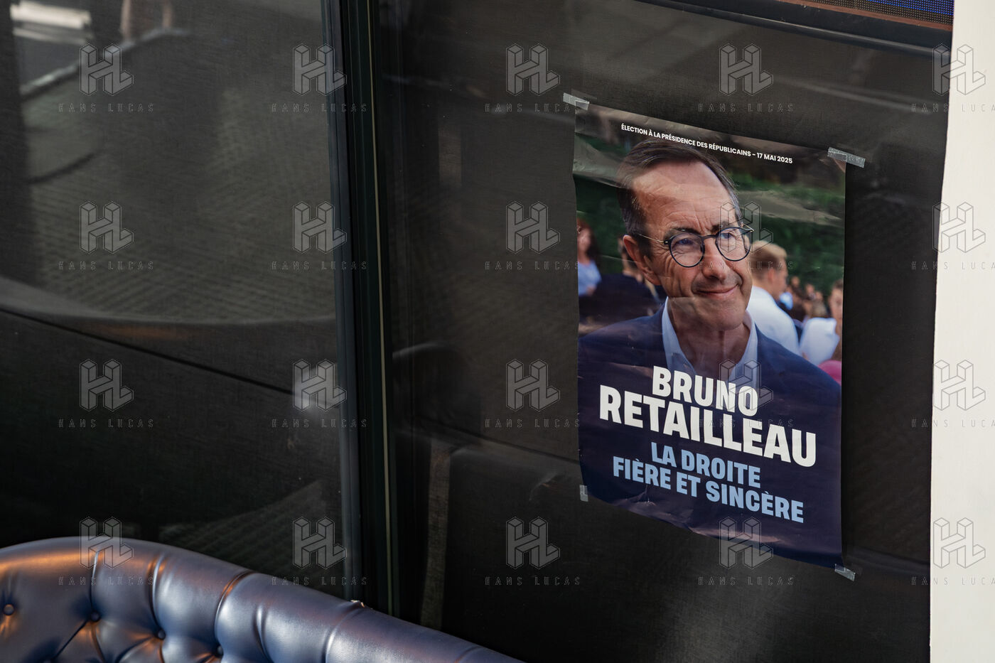 Cette série photo se concentre sur les éléments visuels de la campagne de Bruno Retailleau pour la présidence de Les Républicains. Affiches collées, pancartes brandies ou posées sur des chaises, slogans bien visibles : autant de signes graphiques qui participent à la construction d’une image politique.