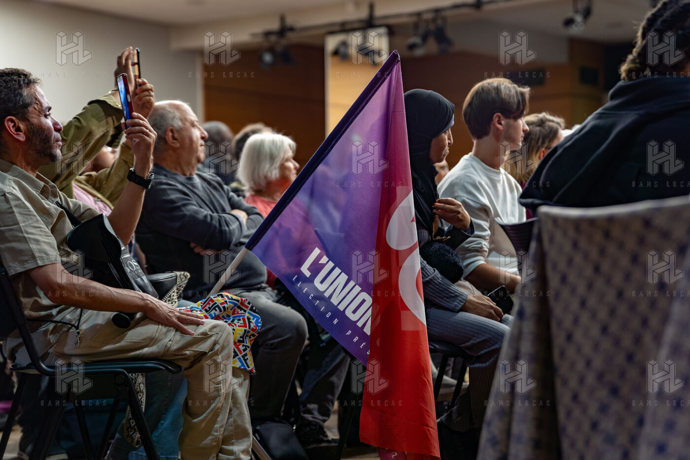 Whether in a meeting hall or pasted across city walls, the visuals of La France insoumise carry the colors and messages of a movement grounded in resistance.