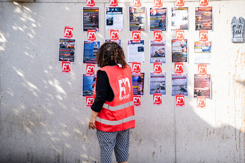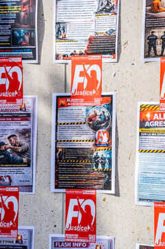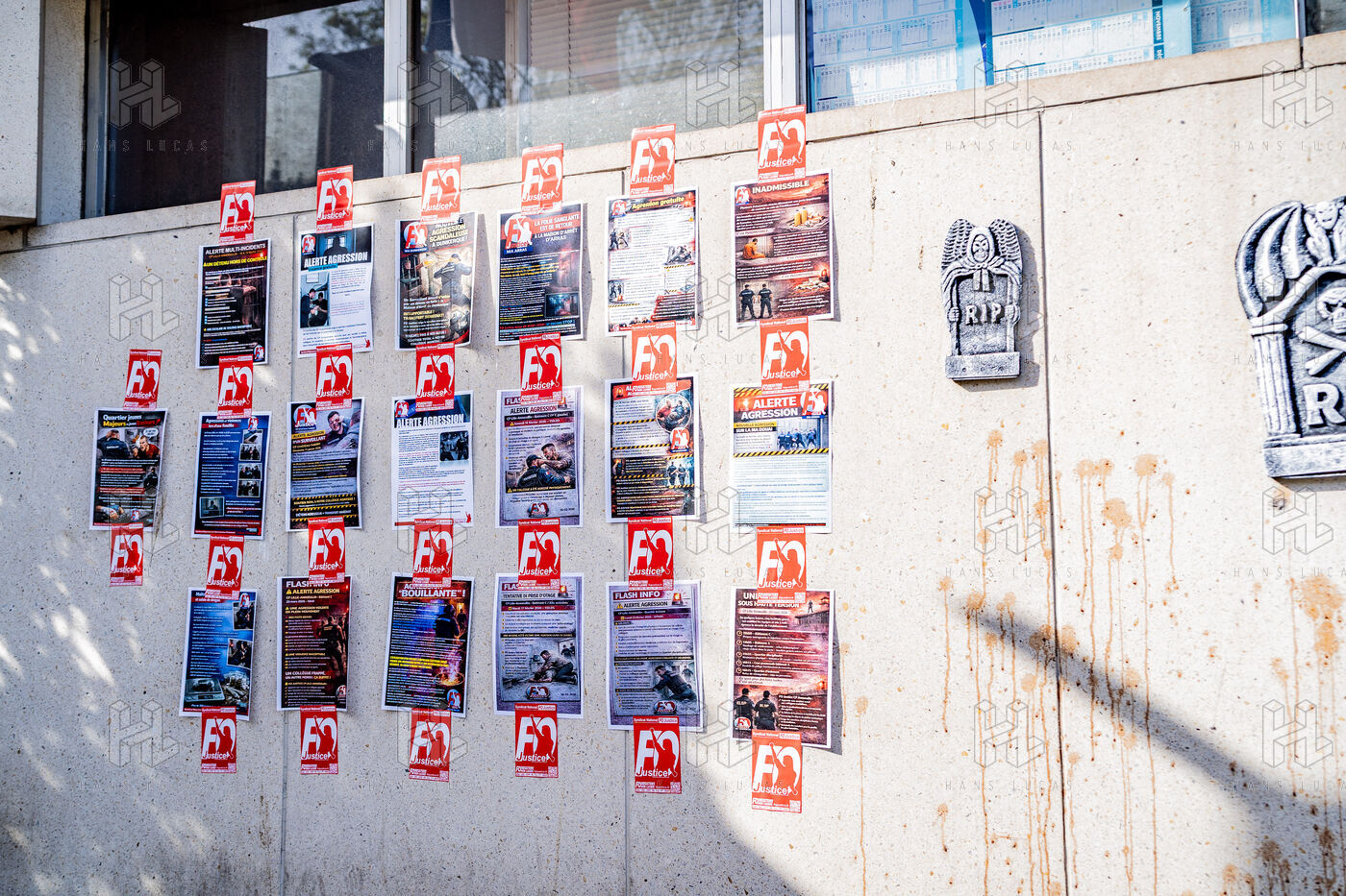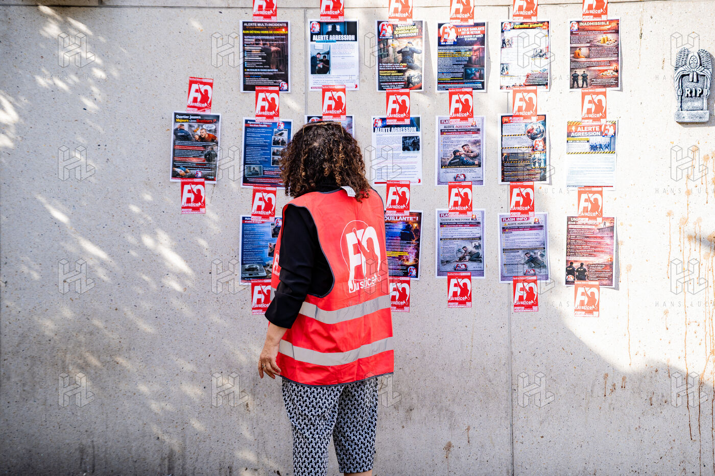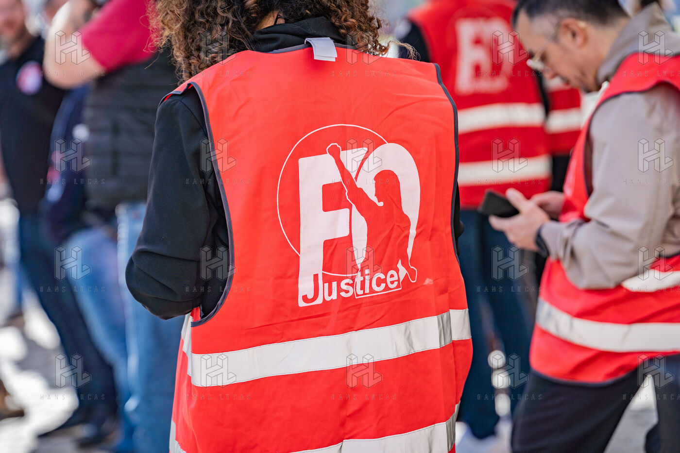 La série photographique capture les moments clés du rassemblement : présence des agents, messages affichés sur les banderoles et interaction avec l’environnement judiciaire, devant une institution directement concernée par les décisions d’incarcération.