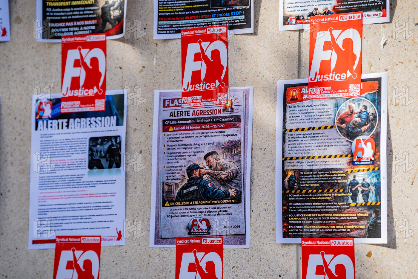 Members of the FO Justice union gather outside the Tribunal judiciaire de Lille to denounce prison overcrowding in facilities across the Hauts-de-France region.
