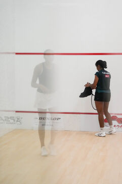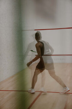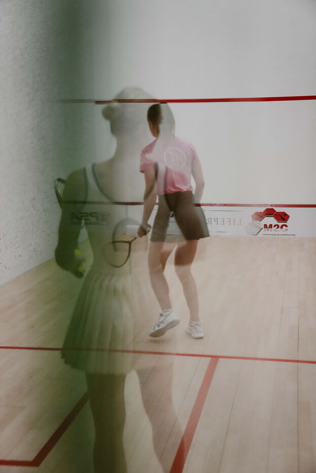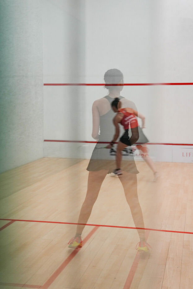 Through the thickness of the glass door of the squash court, bodies merge, intertwine, and clash, a play of reflections during the Monte-Carlo Squash Classic in Monaco on 2025 November.