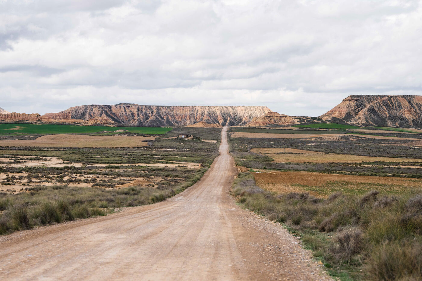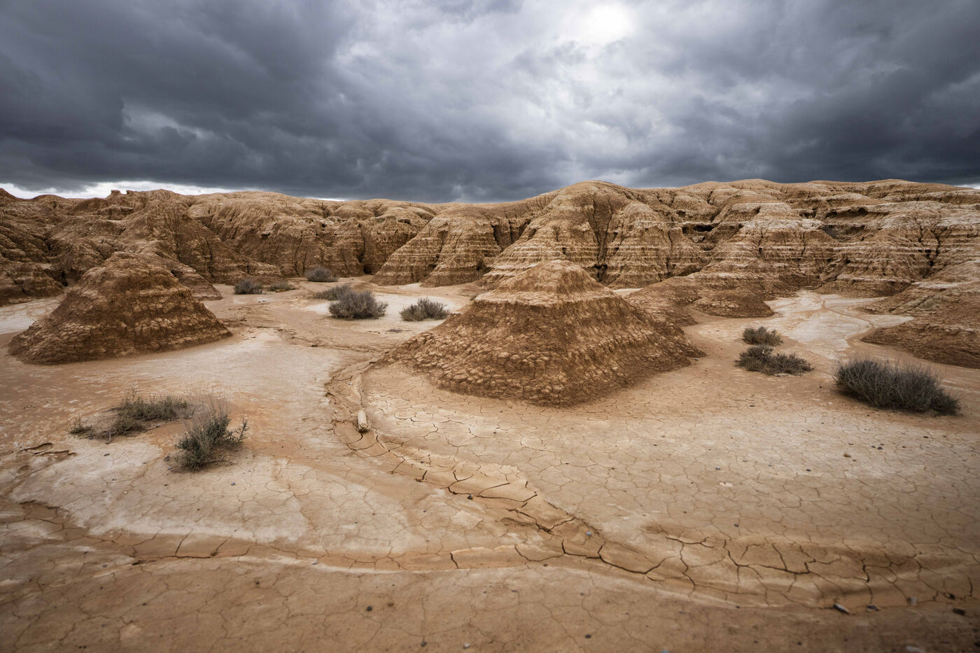 The Bardenas Reales is a desert shaped by wind and water erosion on clay, limestone, and gypsum soils, composed of vast plains, canyons, ravines, isolated hills, and sculpted cliffs that give the landscape an almost lunar or Western movie set appearance, located in northern Spain in the region of Navarre on March 10, 2025. It is a protected hiking destination with limited tourist access.
