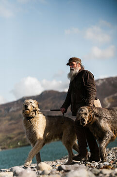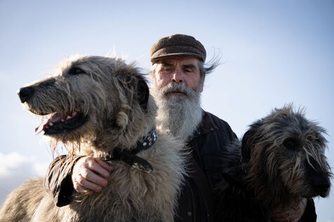 Irish Wolfhounds have been mentioned in Gaelic history for three thousand years and are one of the largest and oldest breeds of dog known to mankind, formerly used for hunting wolves. Some say they can read a man's soul. They can see into the heart of a traitor and instinctively know if a person means harm to their master. What I am sure of is that the Irish Wolfhound is a gentle and loyal breed that will protect its master to the death, hence the saying: gentle when stroked, fierce when provoked. Portraits of Aidan O Sullivan and his dogs Spir and Mairtin taken in Ireland at Betra Beach, County Mayo, on April 16, 2025.