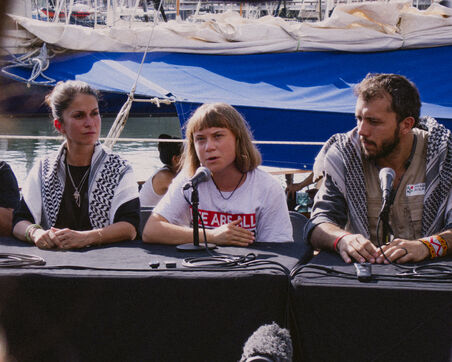 Espagne, Barcelone, 2025/08/31. Des activistes issus de 44 pays, parmi lesquels Greta Thunberg, embarquent depuis Barcelone dans le cadre de la Freedom Flotilla 2025, la plus grande mission humanitatre jamais organisée vers Gaza. L'initiative vise à briser le blocus israélien et à établir un corridor humanitaire. Photographie par Alexandre Bré / Hans Lucas.y Alexandre Bré / Hans Lucas.