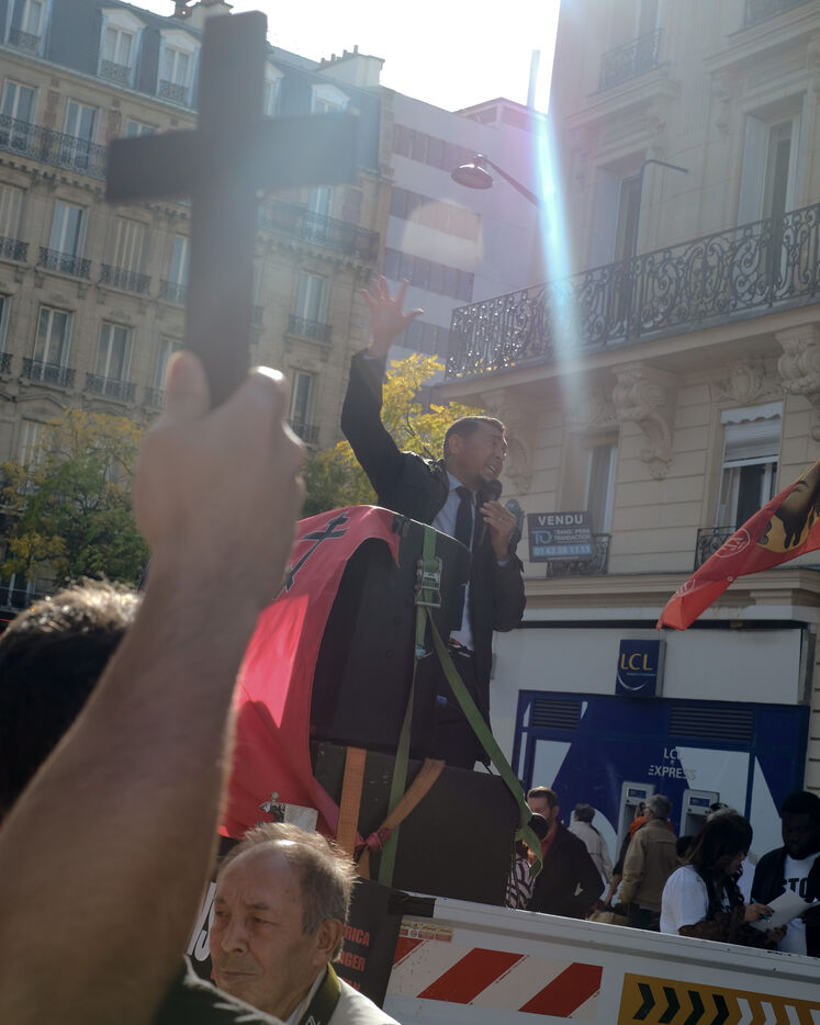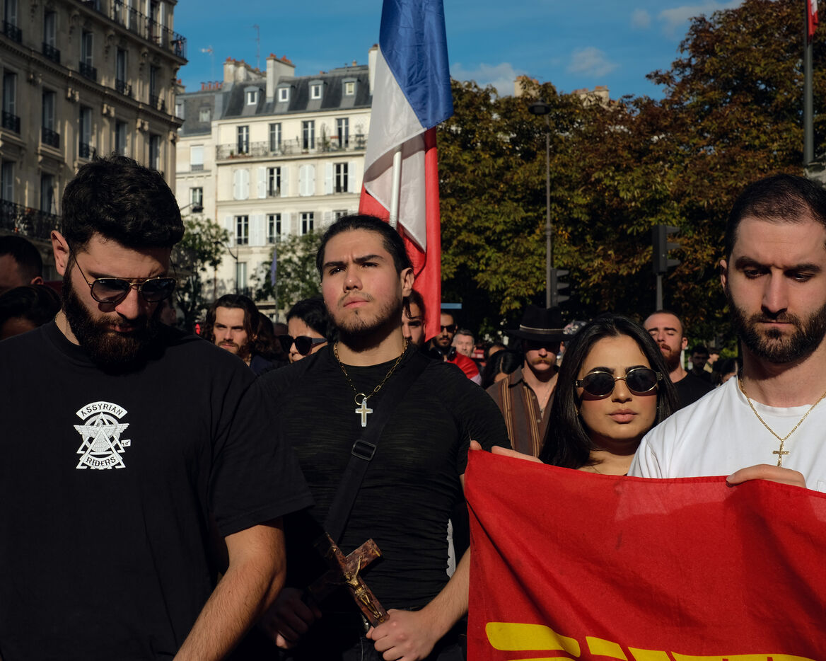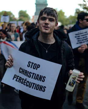 France, Paris, 2025/09/28. Rassemblement contre la christianophobie organisé par diverses associations dont SOS Chrétiens d'Orient pour mettre en lumière la persecution des chrétiens en France et dans le monde.