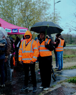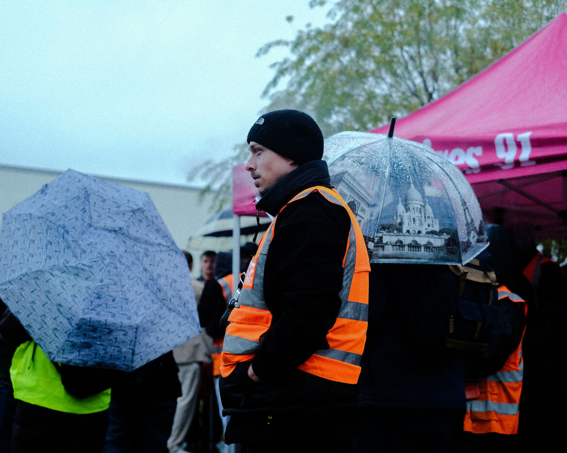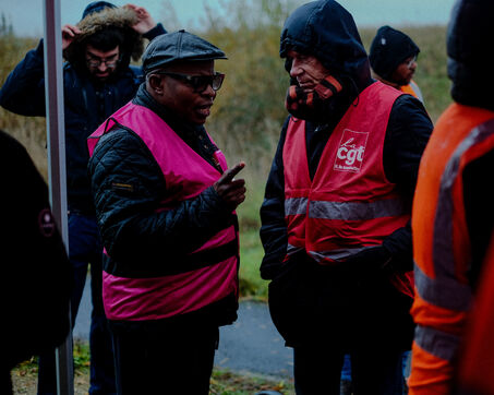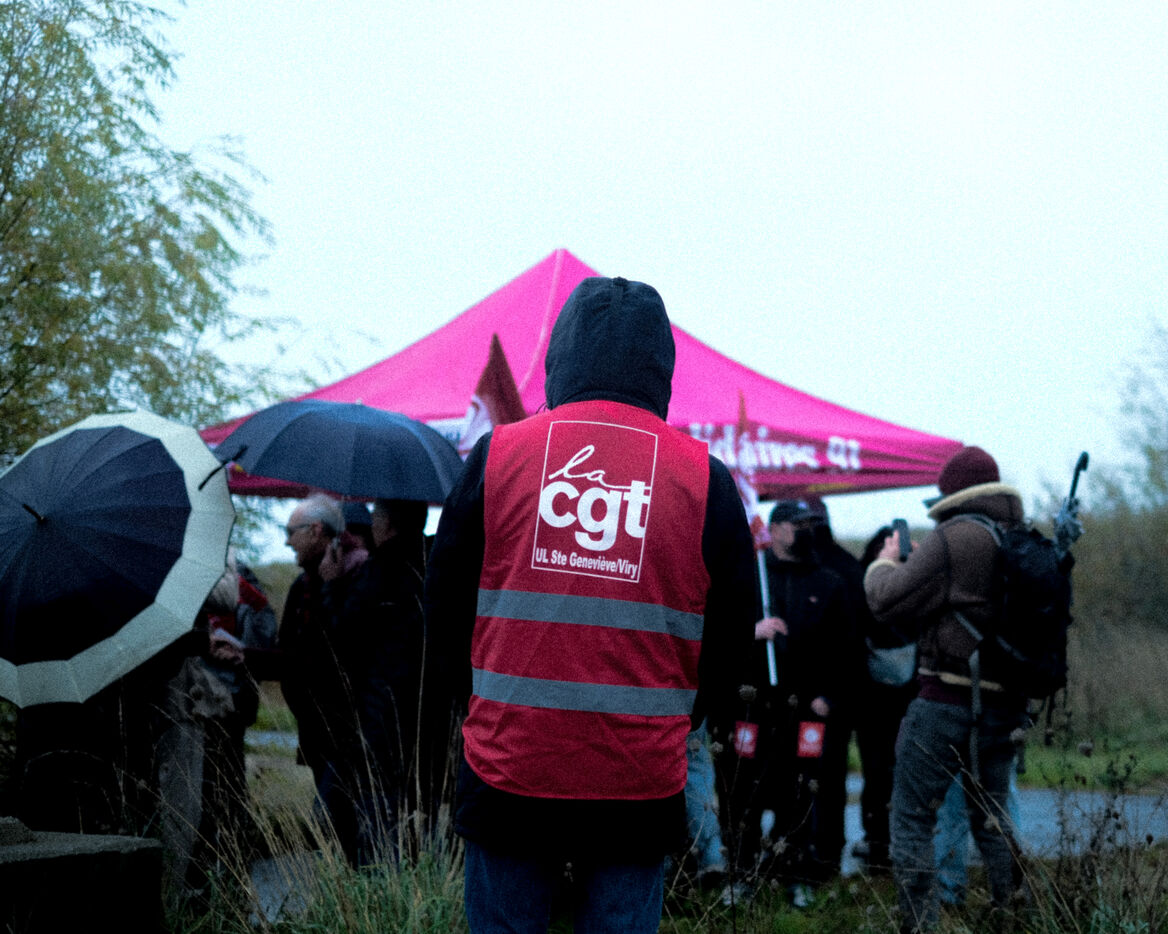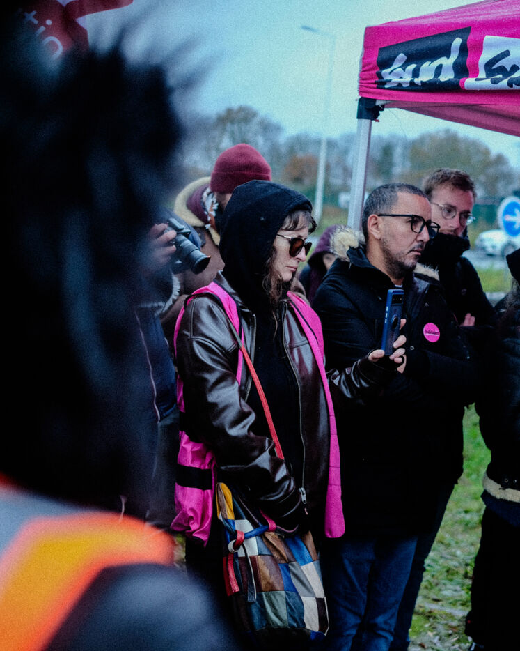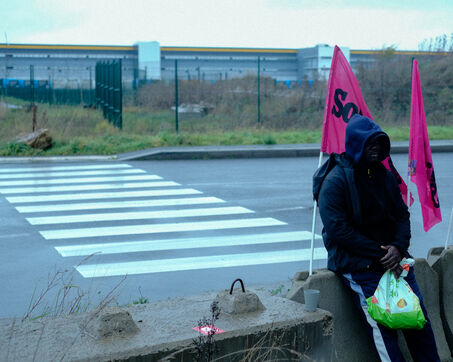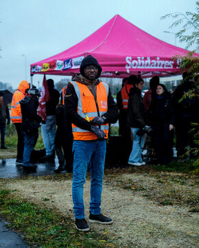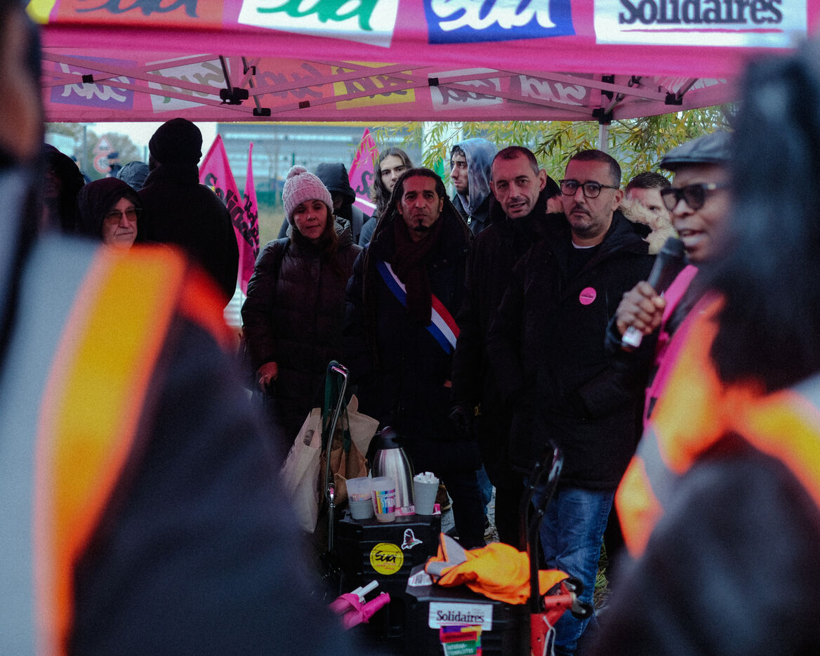 France, Bretigny-sur-Orge, 2025/11/28. Strike and protest outside the Amazon warehouse, part of a mobilization against working conditions, low wages and managerial pressure within the e-commerce giant. The action is supported by several unions ahead of the Black Friday period.