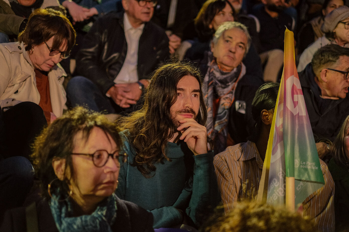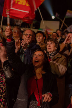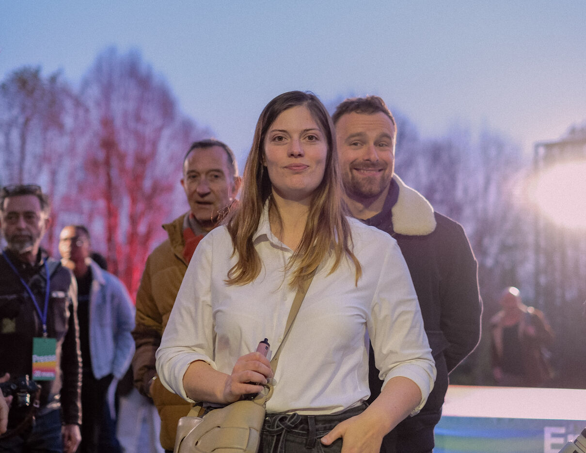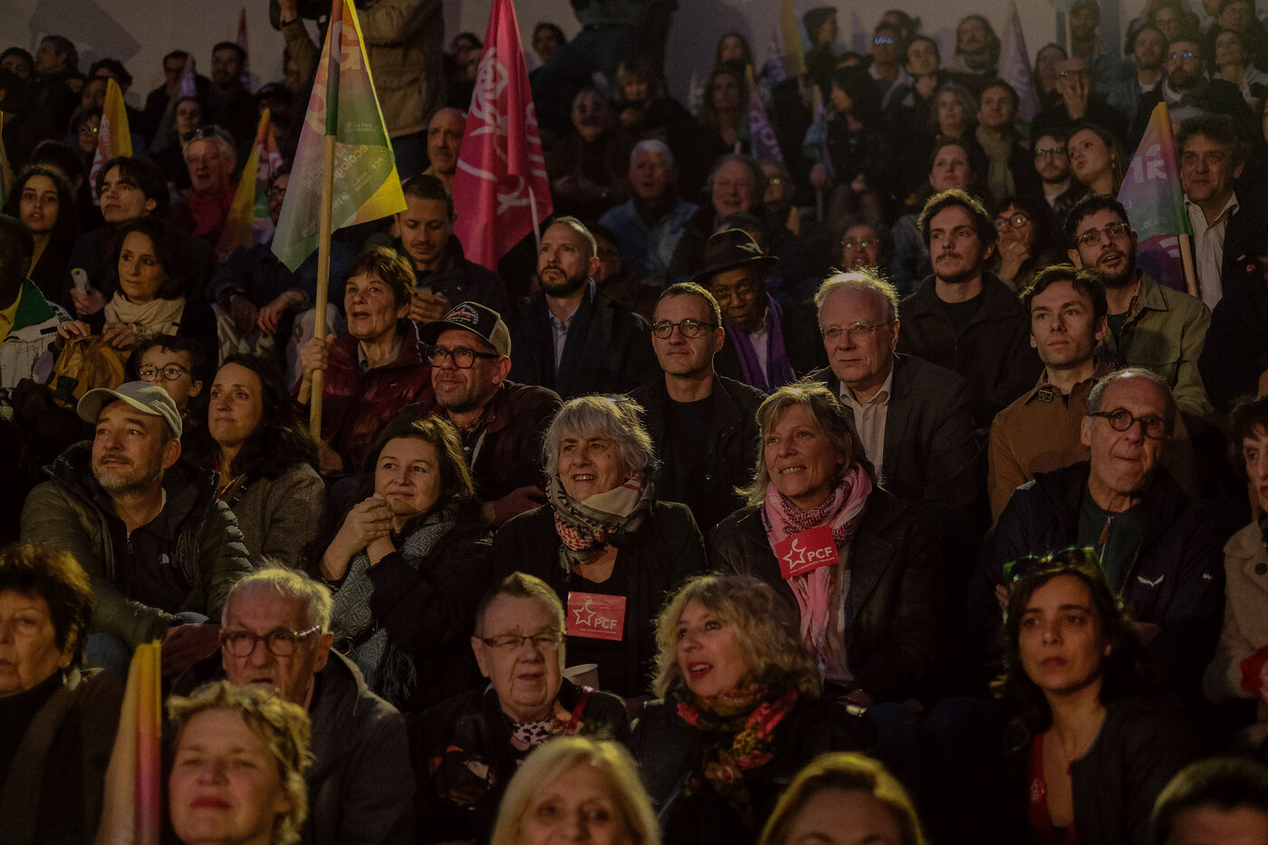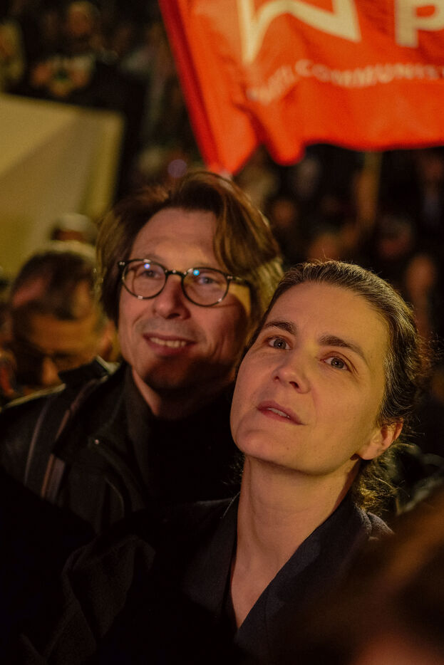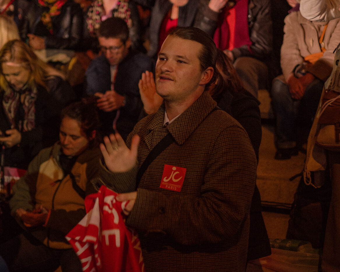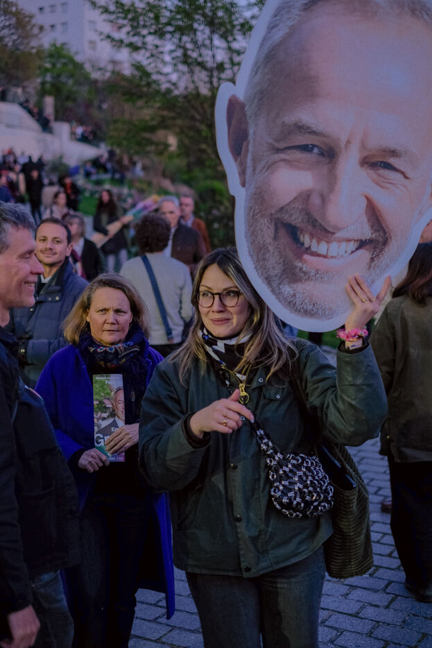 Paris, France, March 20, 2026: Supporters attend a political rally organised by the left-wing and Green coalition in Paris with mayoral candidate Emmanuel Grégoire. The meeting takes place at the Belvédère de Belleville in the 20th arrondissement as part of the municipal election campaign.