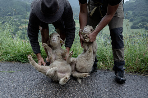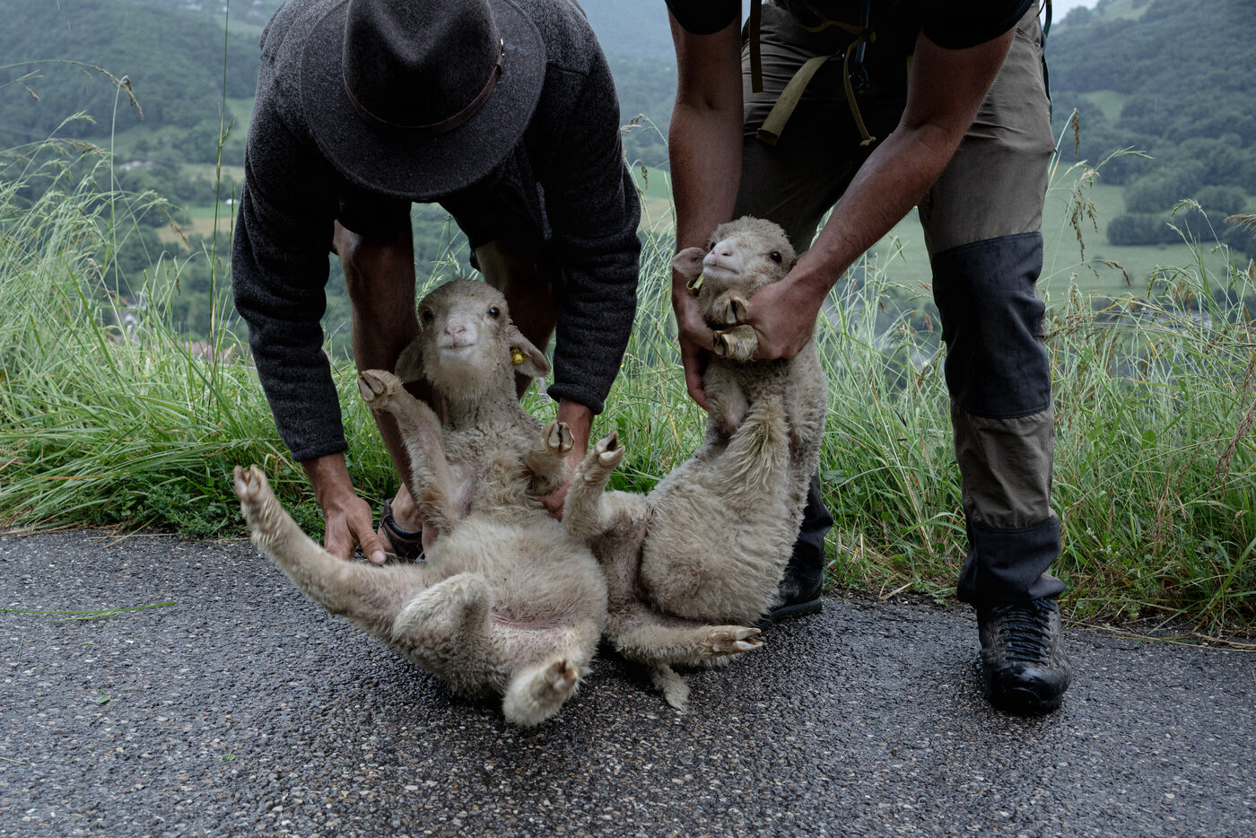 Transhumance estivale pour rejoindre les pâturages de montagne au Col de Porte au pied du sommet de Chamechaude dans le massif de la Chartreuse. Lise, Eudes et leur troupeau de 450 brebis et agneaux ont parcouru une cinquantaine de kilomètres à pied sur sept jours au départ de Tullins (Isère) pour atteindre leur quartier d'été. Elle et il ont été accompagné⸱es par leur entourage.