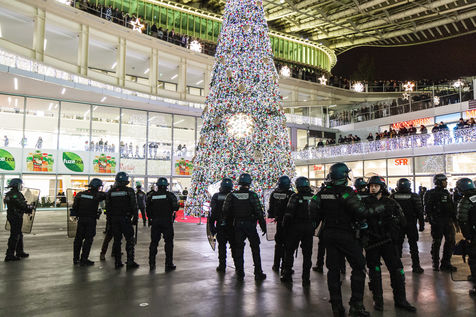 Rassemblement sauvage de gilets jaunes, de militants et d'activistes anticapitalistes au centre commercial des Halles qui a entrainé l'intervention des forces de l'ordre et l'évacuation et la fermeture du centre et des commerces. Paris, France, Samedi 07 Decembre 2019.