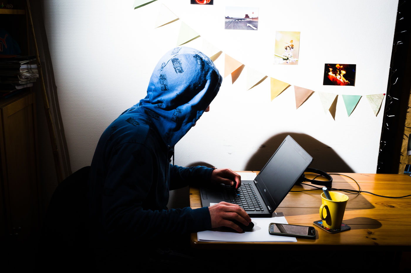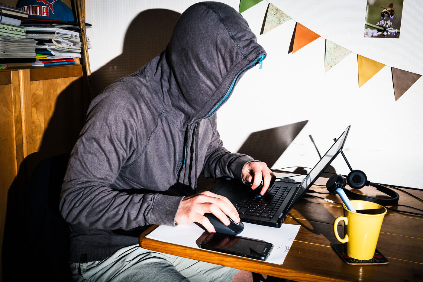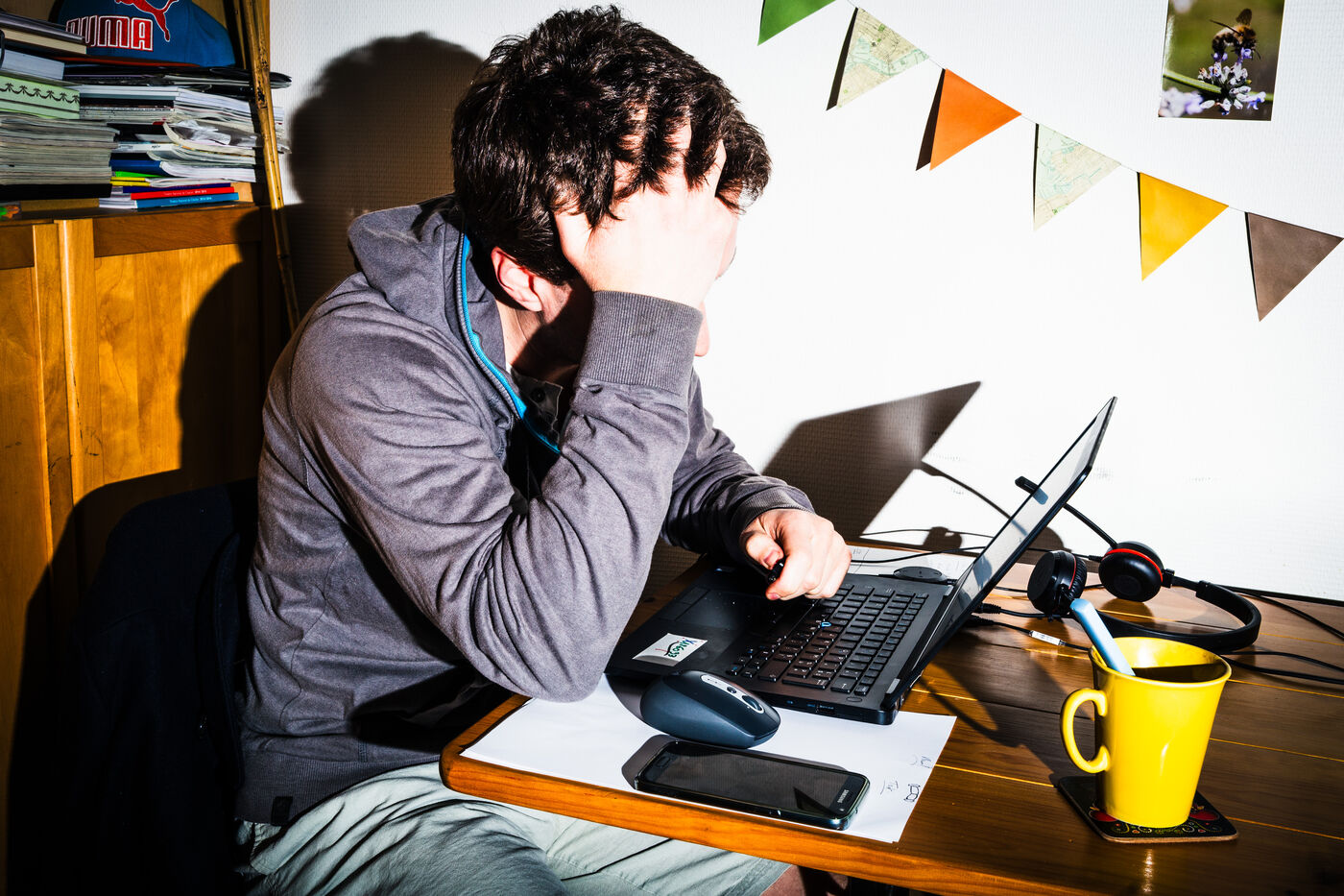 Self-portrait of an employee of a private company, an engineering manager working for a digital services company (ESN), formerly an IT services company (SSII), on a project management assignment for a client, working from home on a laptop connected to the internet, teleworking from a flat in Paris, France on March 23, 2020. Illustrative photo taken during the total lockdown period during the Coronavirus (Covid-19) epidemic, showing working conditions, isolation and alienation.