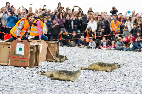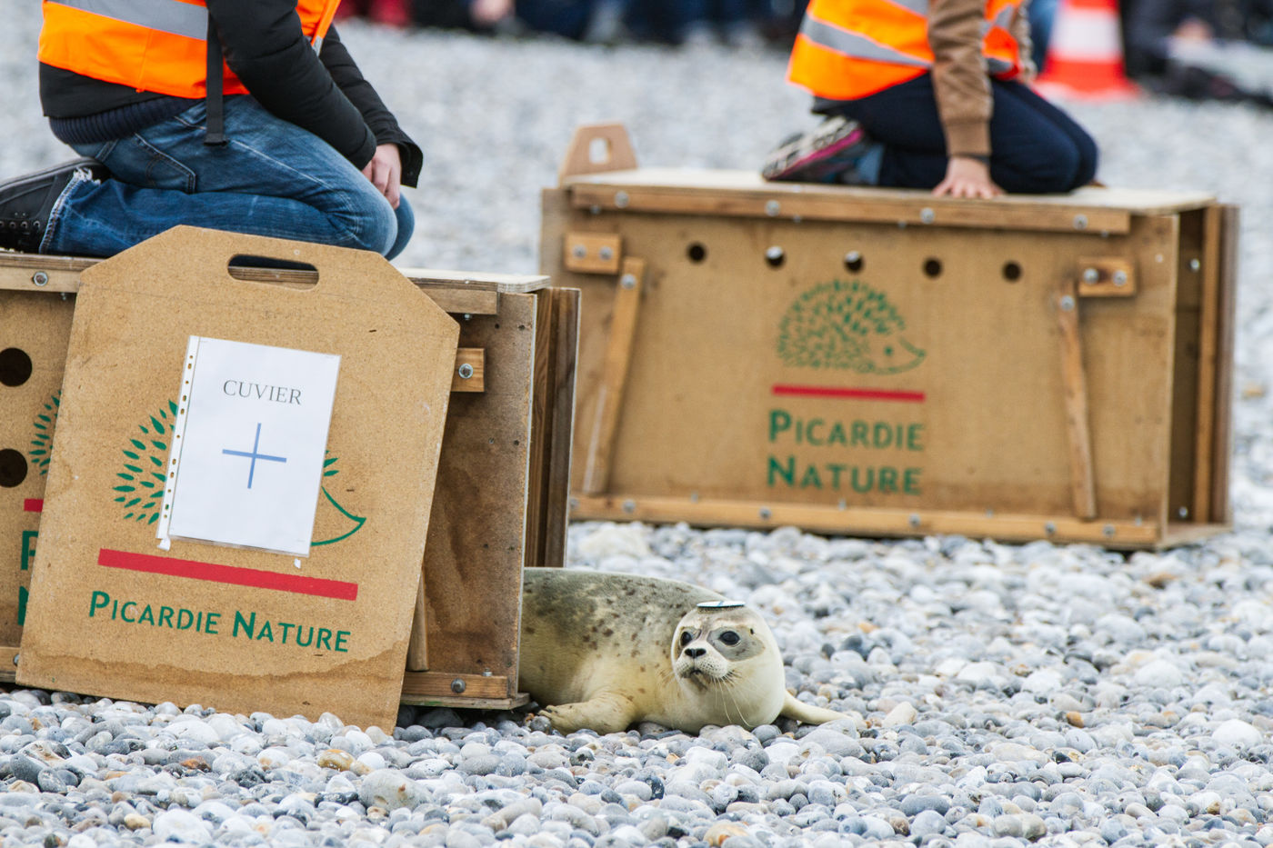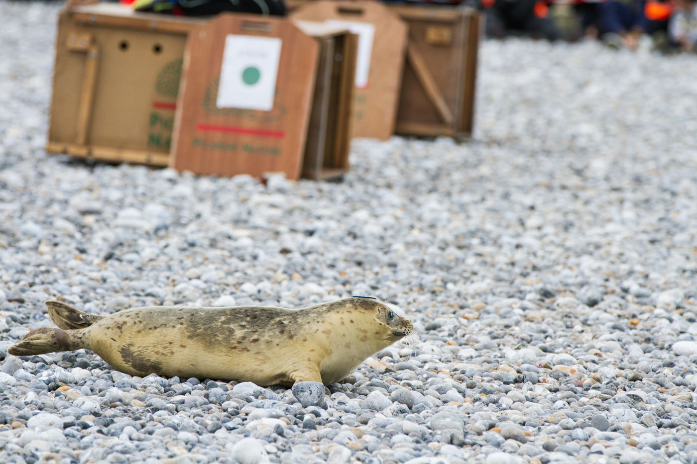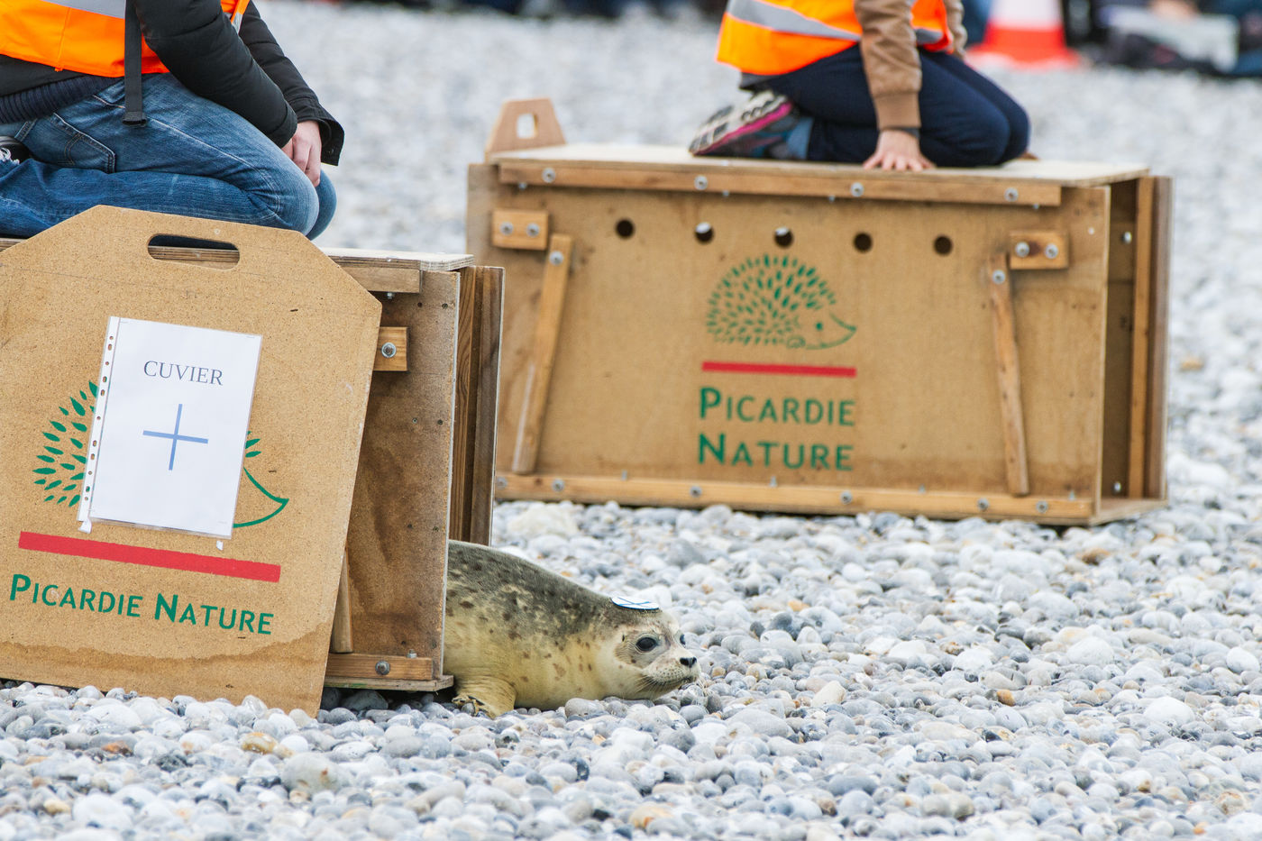 On Saturday, October 22, 2016, four calf seals (Phoca vitulina) were released in Le Hourdel, a hamlet located in the south of the Baie de Somme. Under the eyes of the curious and nature lovers who came to admire the show, Linnaeus, Cuvier, Belon and Goethe returned to the sea. While they had been discovered stranded and in distress after being separated from their mother, the four animals, born during the summer of 2016, were welcomed and cared for by the association Picardie Nature. After several months of care in the wildlife rescue center, the young seals were thus able to be released into their natural environment.