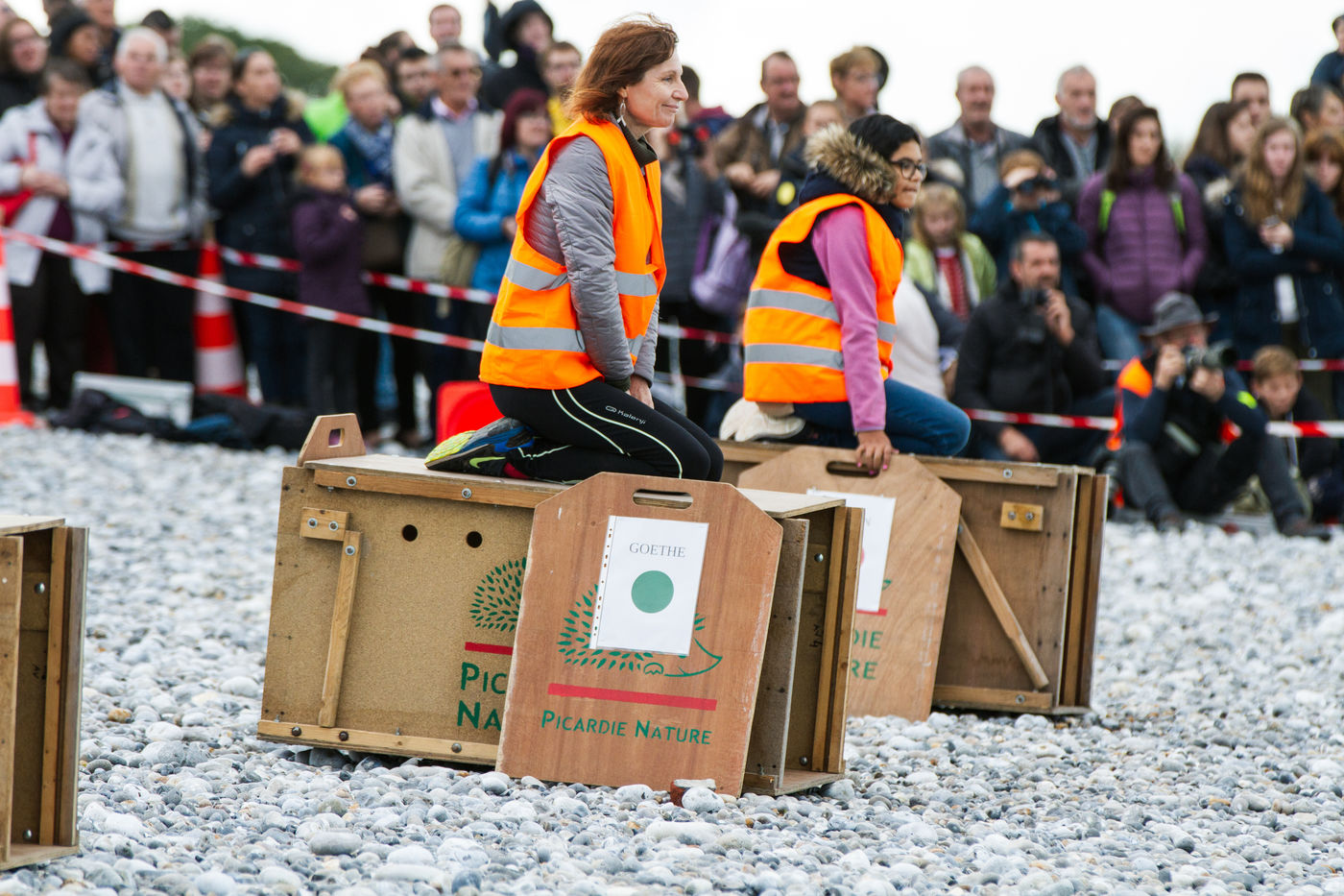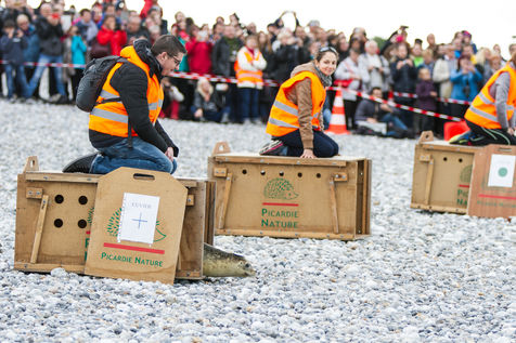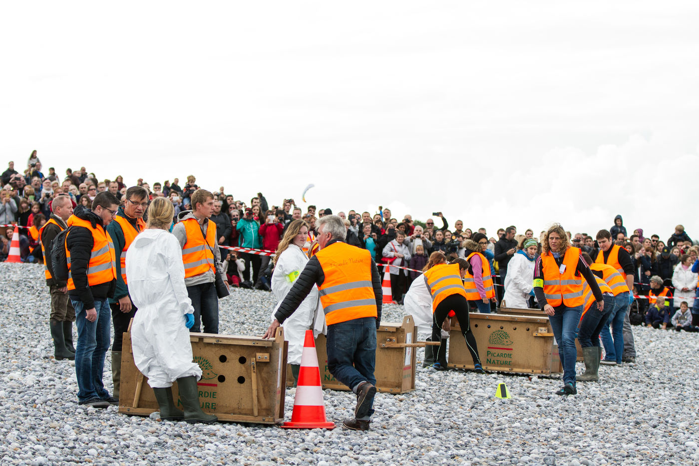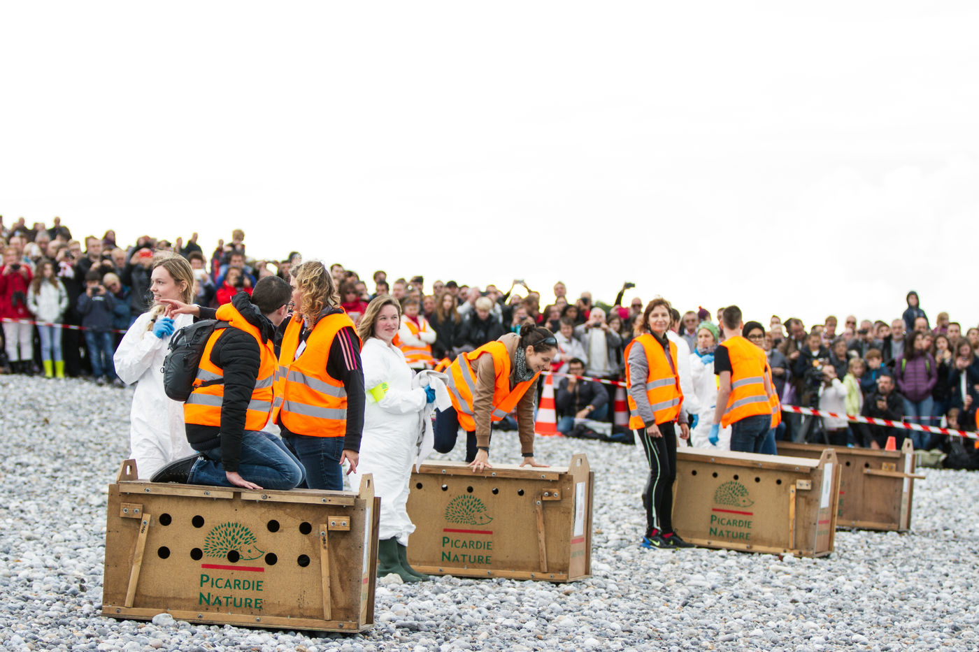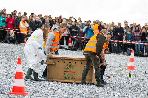 On Saturday, October 22, 2016, four calf seals (Phoca vitulina) were released in Le Hourdel, a hamlet located in the south of the Baie de Somme. Under the eyes of the curious and nature lovers who came to admire the show, Linnaeus, Cuvier, Belon and Goethe returned to the sea. While they had been discovered stranded and in distress after being separated from their mother, the four animals, born during the summer of 2016, were welcomed and cared for by the association Picardie Nature. After several months of care in the wildlife rescue center, the young seals were thus able to be released into their natural environment.