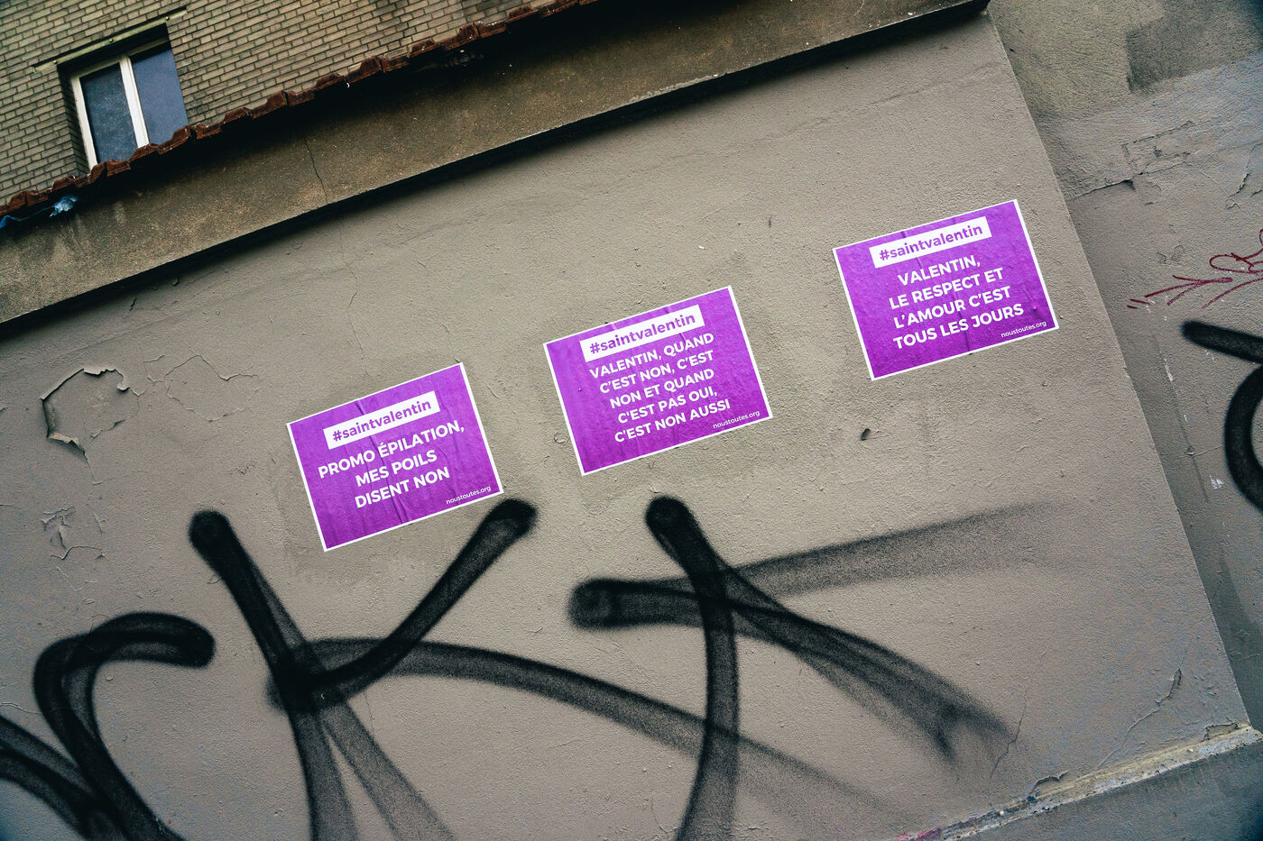 Collages du collectif féministe Nous Toutes #NousToutes sur des murs dans le 20e arrondissement de Paris à l'occasion de la Saint-Valentin qui a lieu le mardi 14 Février 2023, pour fêter la St Valentin de manière engagée en solidarité avec les femmes victimes.