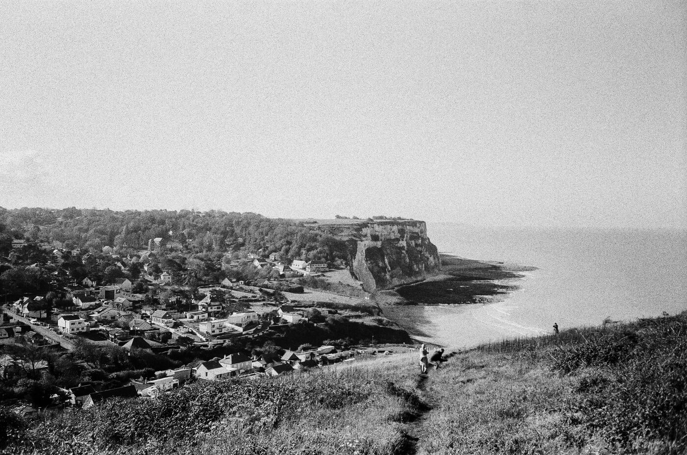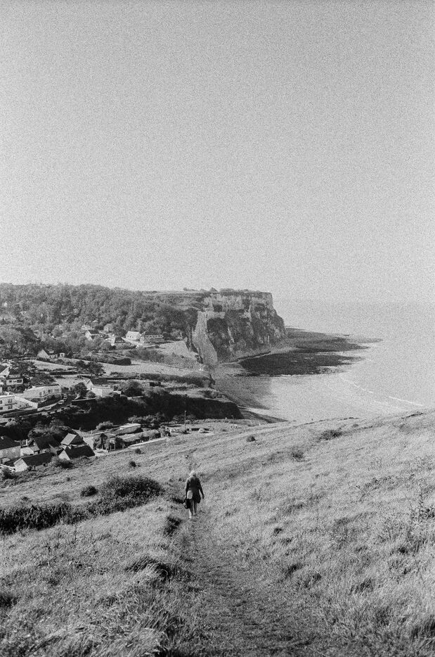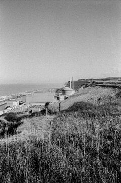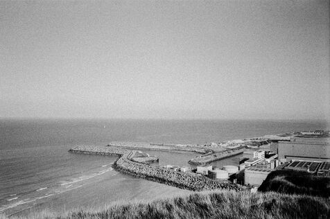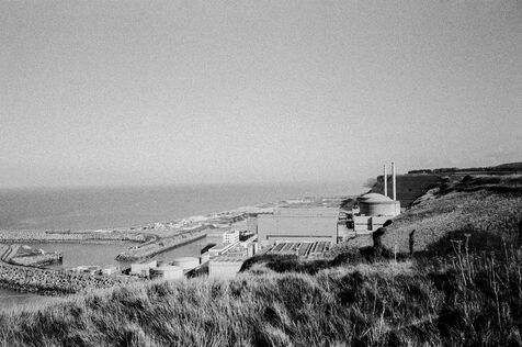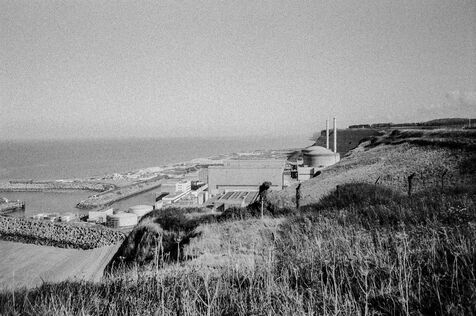 Environs de la centrale nucléaire de Penly, située dans la commune de Petit-Caux sur la côte de la Manche (réacteurs refroidis par l'eau de la manche). Le site a été retenu pour l'implantation de nouveaux EPR à partir de 2024 (projet EPR2 de EDF). Photo faite en Octobre 2023 le long de la barrière de sécurité, d'un côté des champs et des animaux de l'autre les parkings et l'accès à la centrale. Photo argentique, appareil Zenit-TTL, pellicule cinéma Sunbath 250D.