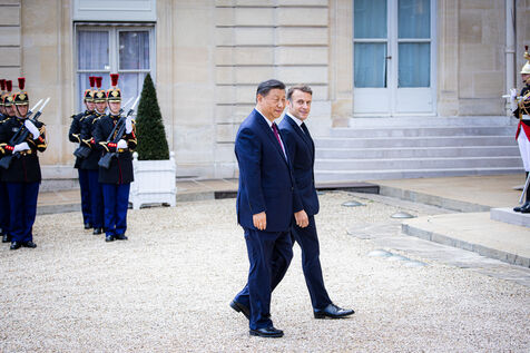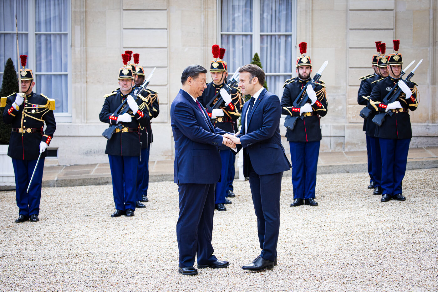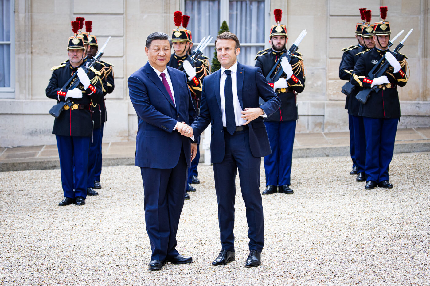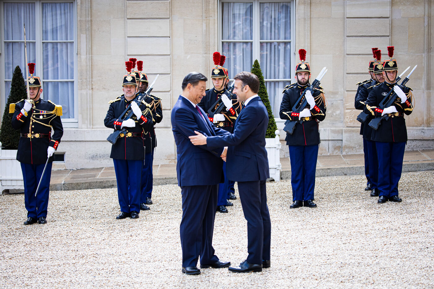 French President Emmanuel Macron welcomes President of the People's Republic of China XI Jinping for a meeting at the Elysee Palace in Paris, France on May 6, 2024. The Chinese President's state visit marks 60 years of diplomatic relations between France and China.