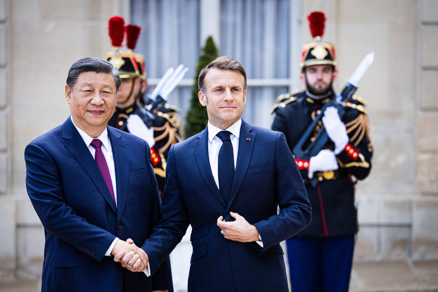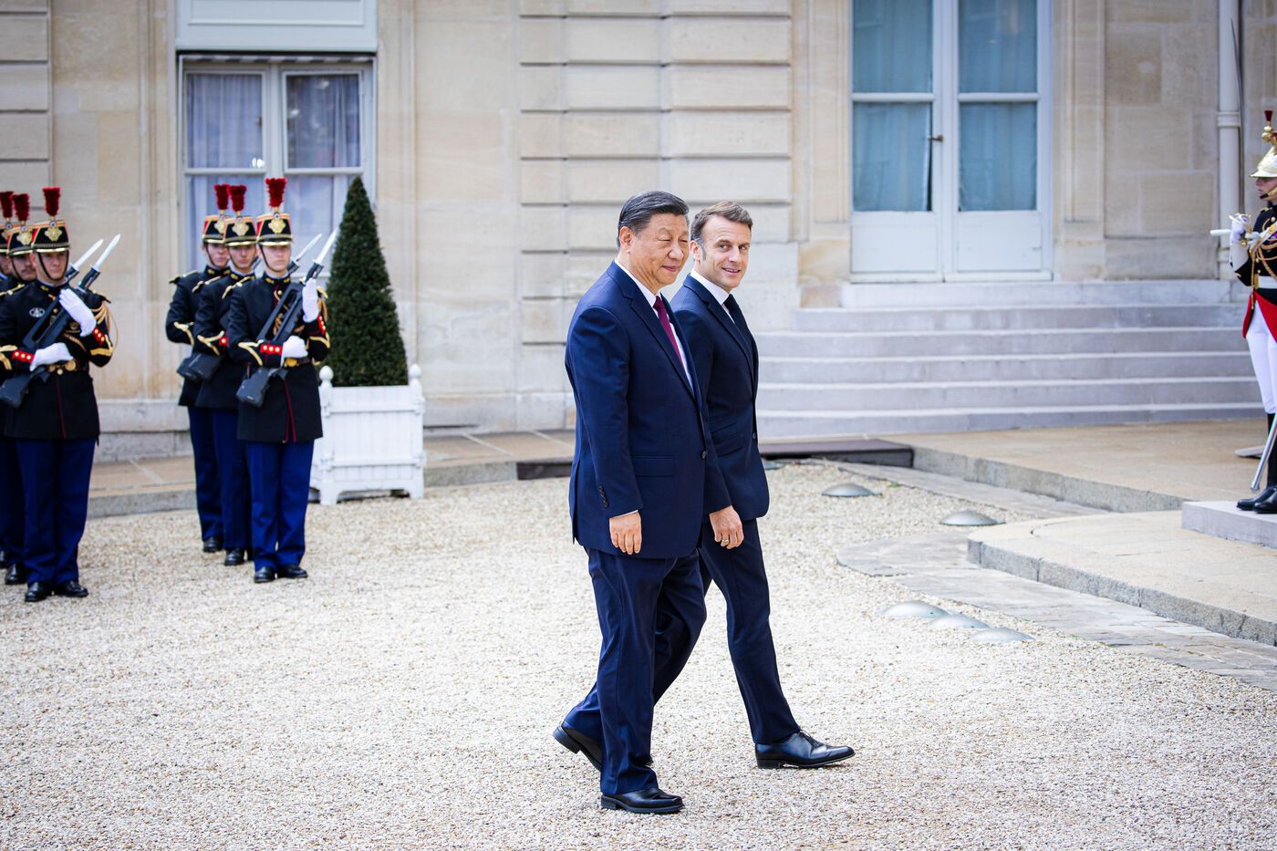 Le président français Emmanuel Macron accueille le président de la république populaire de Chine XI Jinping pour une réunion au Palais de l'Elysée à Paris, France le 6 mai 2024. La visite d'état du président chinois intervient à l?occasion des 60 ans des relations diplomatiques entre la France et la Chine.