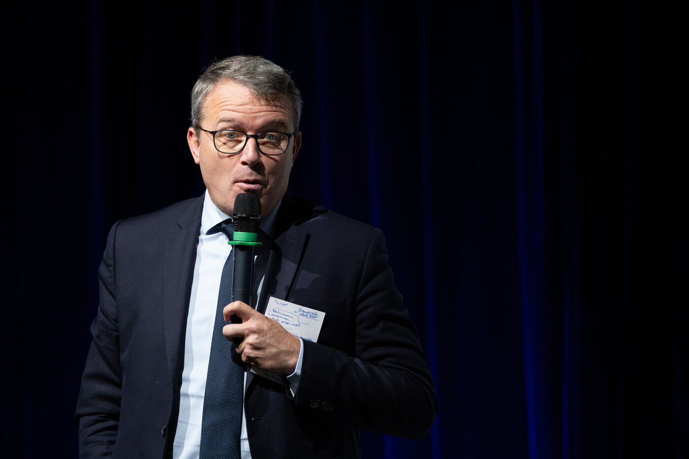 Colloque 2024 de l'Association Francaise du RAil AFRA qui a pour theme "Liberons le ferroviaire" sur l'ouverture a la concurrence du transport ferroviaire de personnes et de marchandises FRET (pour mettre fin au monopole du groupe SNCF qui possede le reseau ferroviaire) a l'Espace Saint-Martin a Paris, France le 8 Octobre 2024.