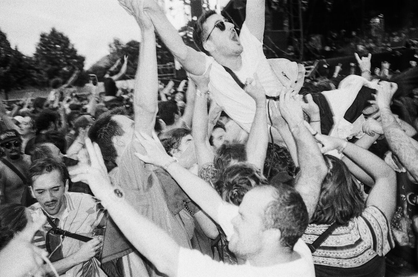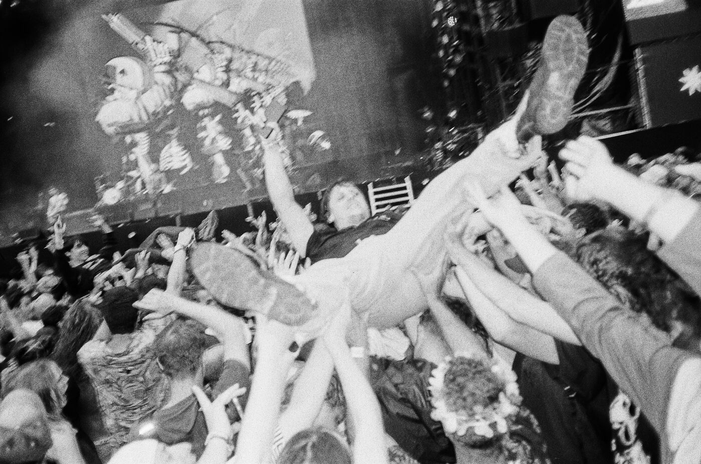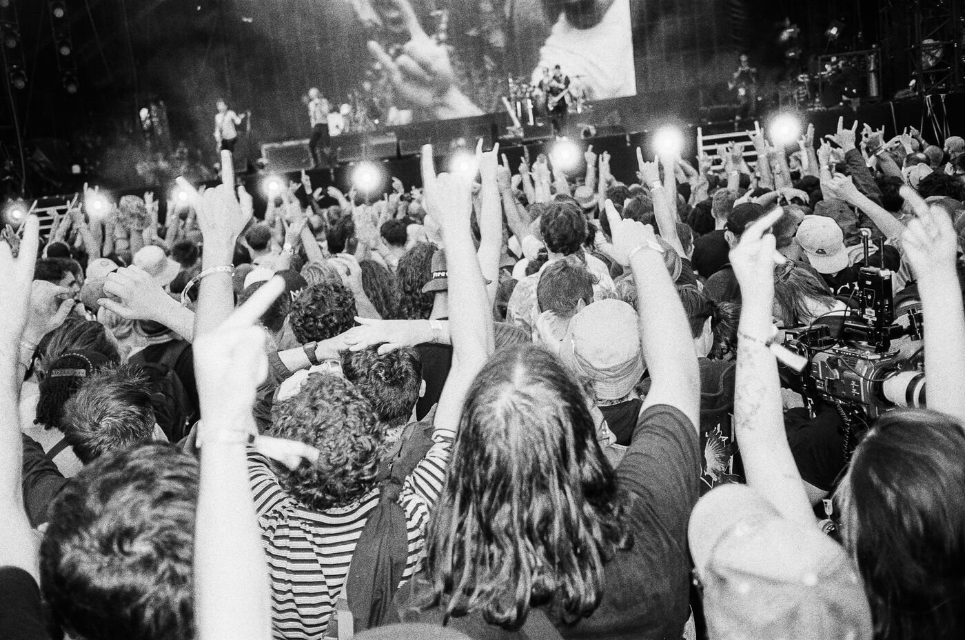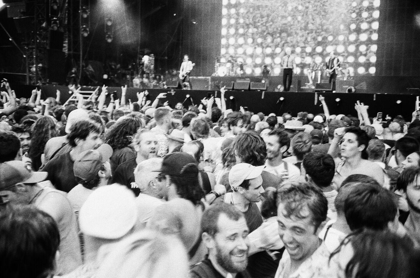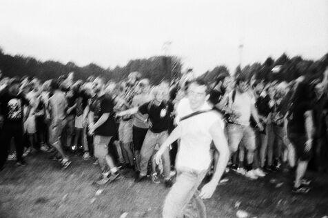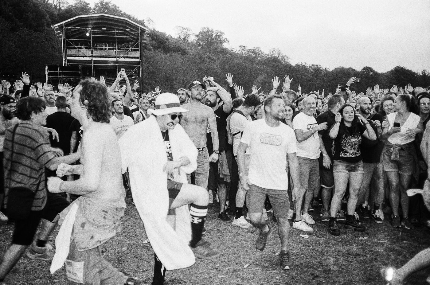 In the middle of a pogo with Festival-goers during a concert by American punk rock band The Offspring at the Rock en Seine festival at the Domaine National in Saint Cloud, France on August 24, 2024. Black and white photograph, Sunbath Double X silver film, Olympus Mju II camera.