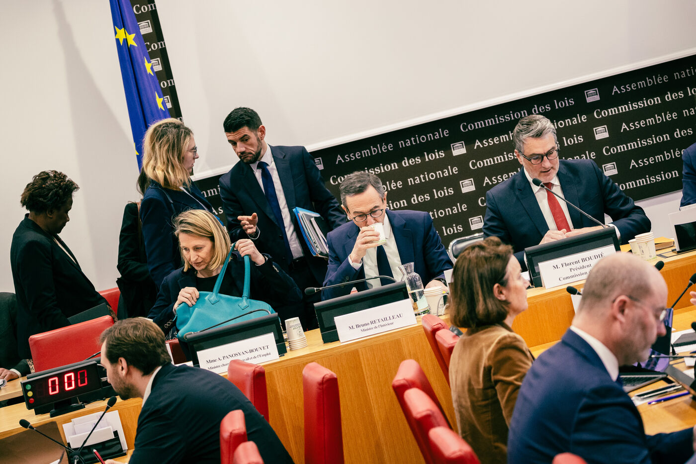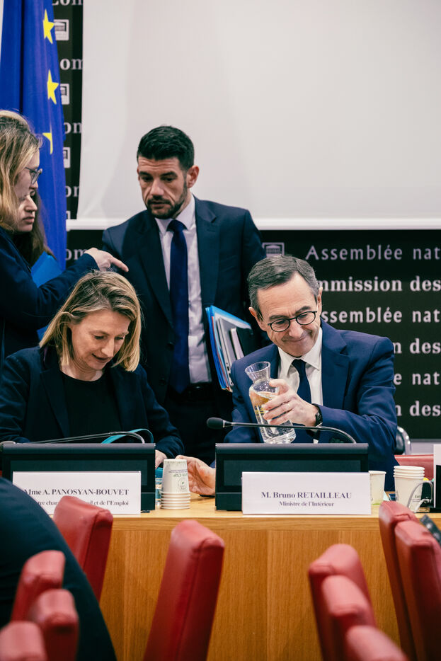 Hearing of France's Minister of State, Minister of the Interior Bruno Retailleau, and France's Minister of Labour, Health, Solidarity and the Family, responsible for Labour and Employment Astrid Panosyan-Bouvet, on the circular of 23 January 2025 setting out the general guidelines for the exceptional admission to residence provided for in articles L.435-1 and following of the Code on the Entry and Residence of Foreigners and the Right of Asylum and on regularisations justified by work (immigration, immigrant workers) by members of the Law Commission of the French National Assembly in Paris, France on February 12, 2025.