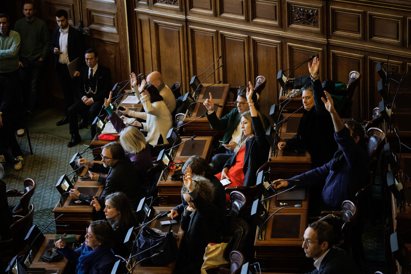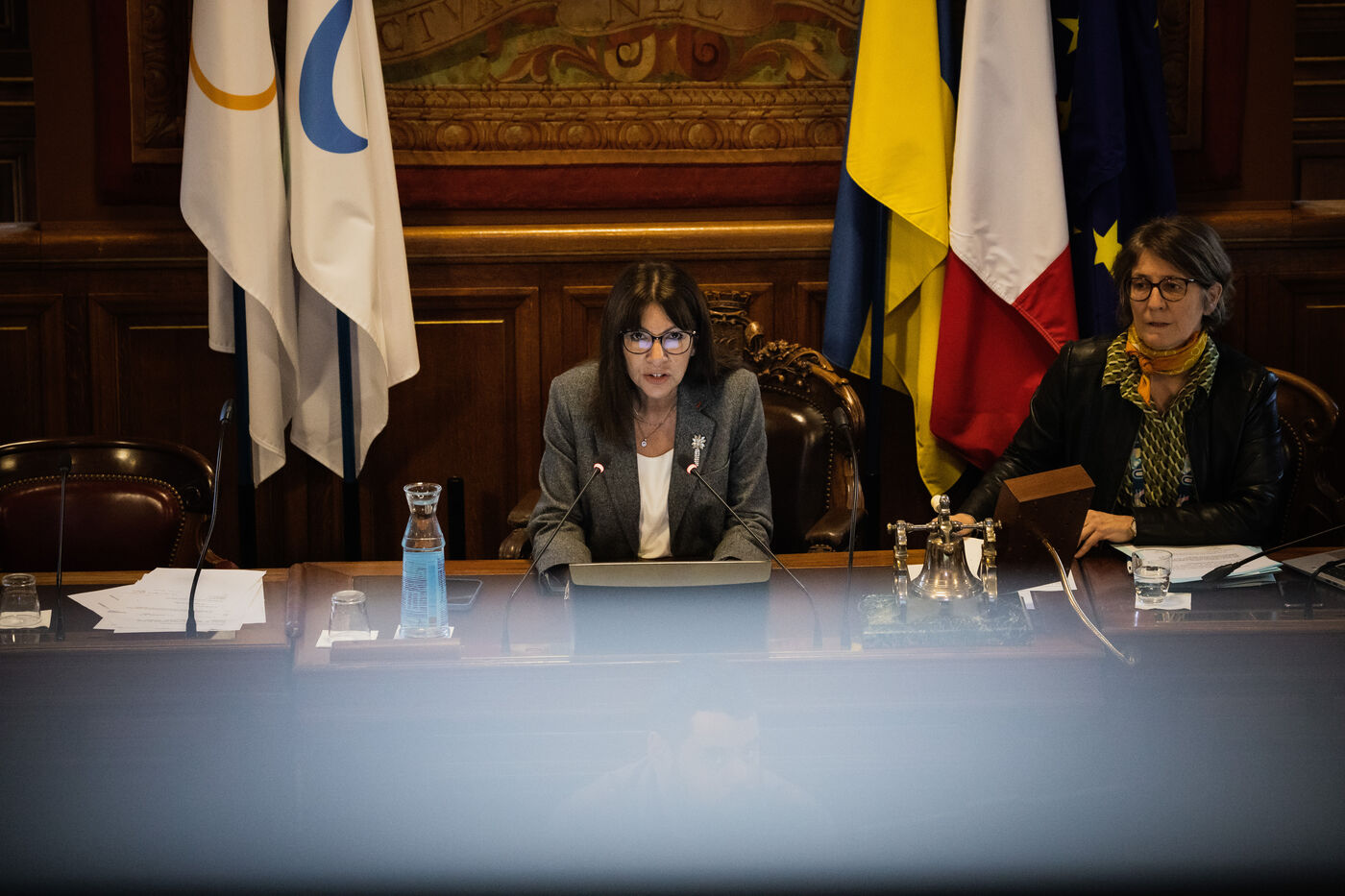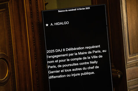Extraordinary meeting of the Paris City Council chaired by the Mayor of Paris to debate and vote on the decision to take legal action for defamation and/or public insult against Paris councillor Nelly Garnier, member of the Changer Paris group, following her comments concerning the death of young Elias, in the Council chamber of the Paris City Hall on February 14, 2025.