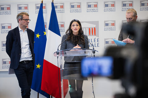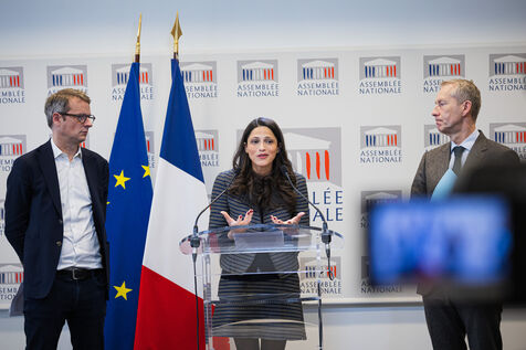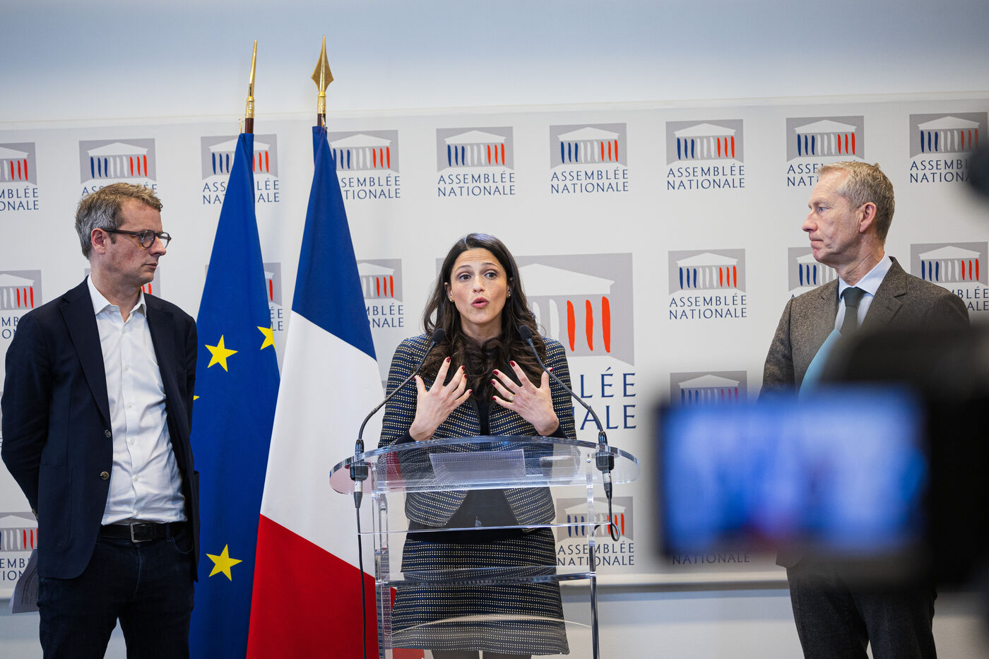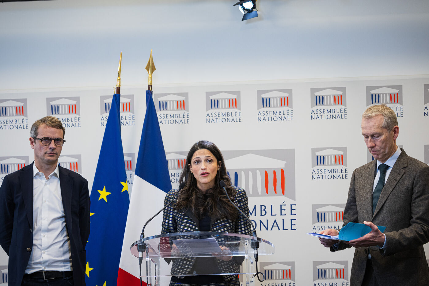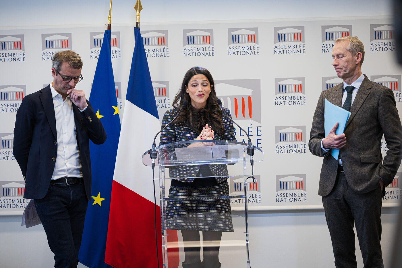 Presentation by MP Boris Tavernier (Ecologist and Socialist group EcoS), MP Eleonore Caroit (Ensemble Pour la Republique EPR, ex Renaissance) and Guillaume Garot (Socialist group) of a motion for a resolution calling for the recognition of the right to food and the adoption of a framework law for the right to food, in the press conference room of the National Assembly in Paris, France on February 19, 2025.