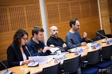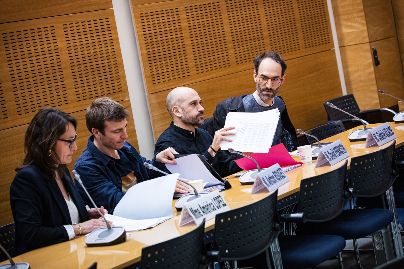 Round table discussion with journalists Gabriel Blaise (Sud-Ouest), America Lopez (France 3 Aquitaine), David Perrotin and Antton Rouget (Mediapart), work of the commission of enquiry into state control and the prevention of violence in educational establishments, hearing on acts of violence at the Notre-Dame de Betharram private school (Catholic establishment) at the National Assembly in Paris, France on March 26, 2025.