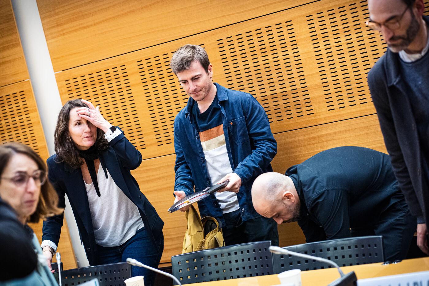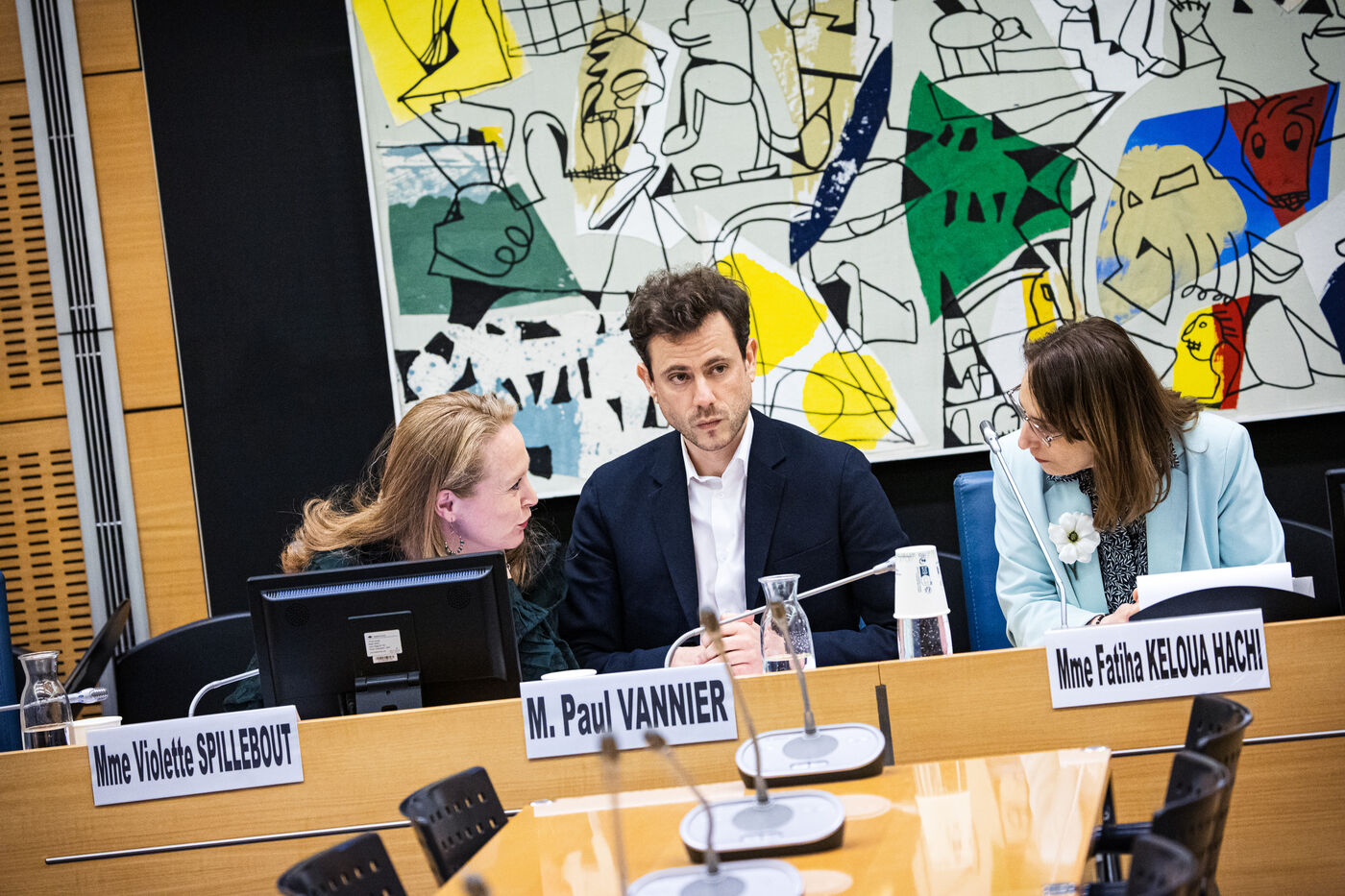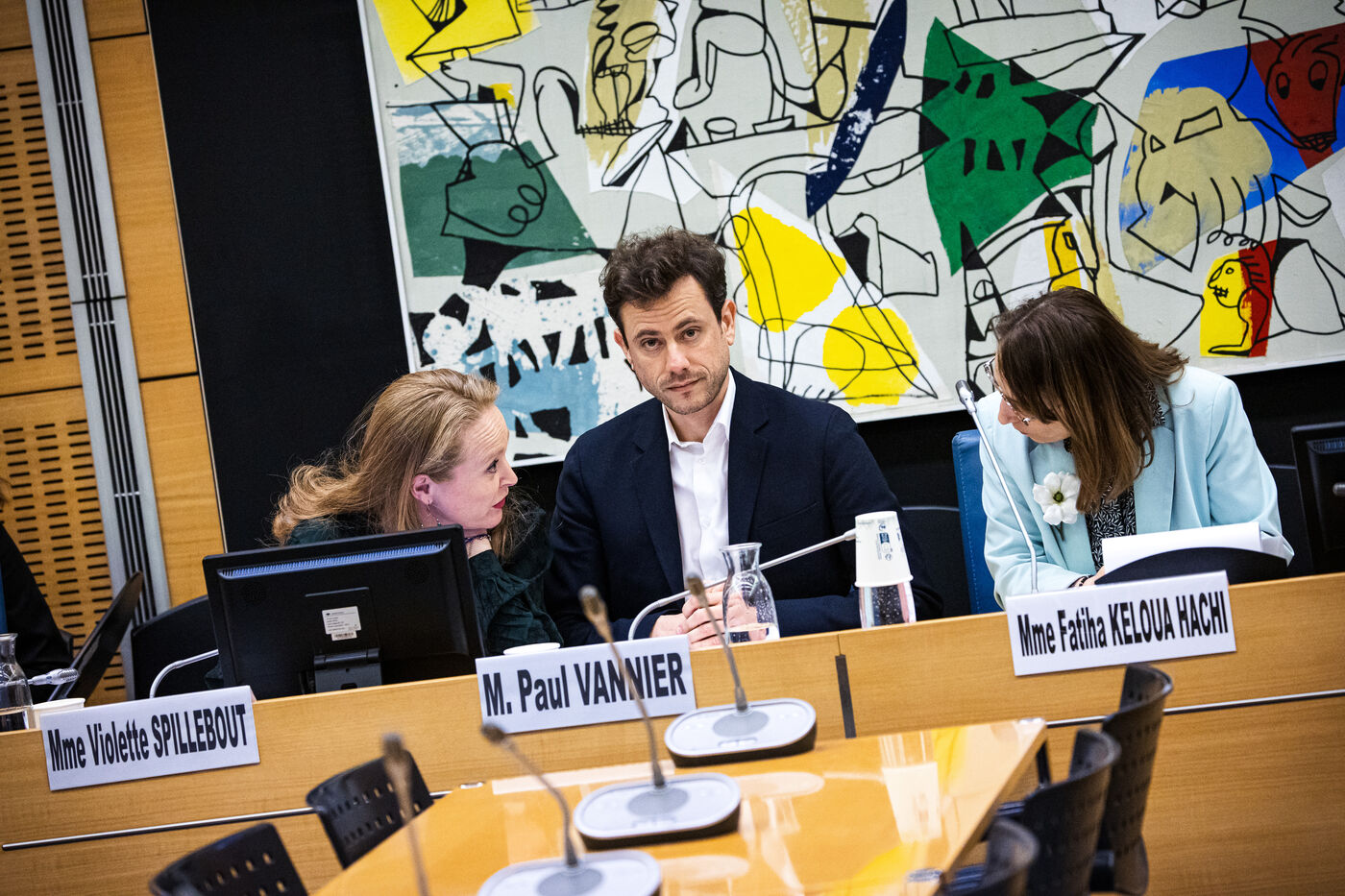 Table ronde avec les journalistes Gabriel Blaise (Sud-Ouest), America Lopez (France 3 Aquitaine), David Perrotin et Antton Rouget (Mediapart), Travaux de la commission d'enquête sur les modalités du contrôle par l'État et de la prévention des violences dans les établissements scolaires, audition sur des faits de violences à l'école privée Notre-Dame de Bétharram (établissement catholique) à l'Assemblée Nationale à Paris, France le 26 Mars 2025.
