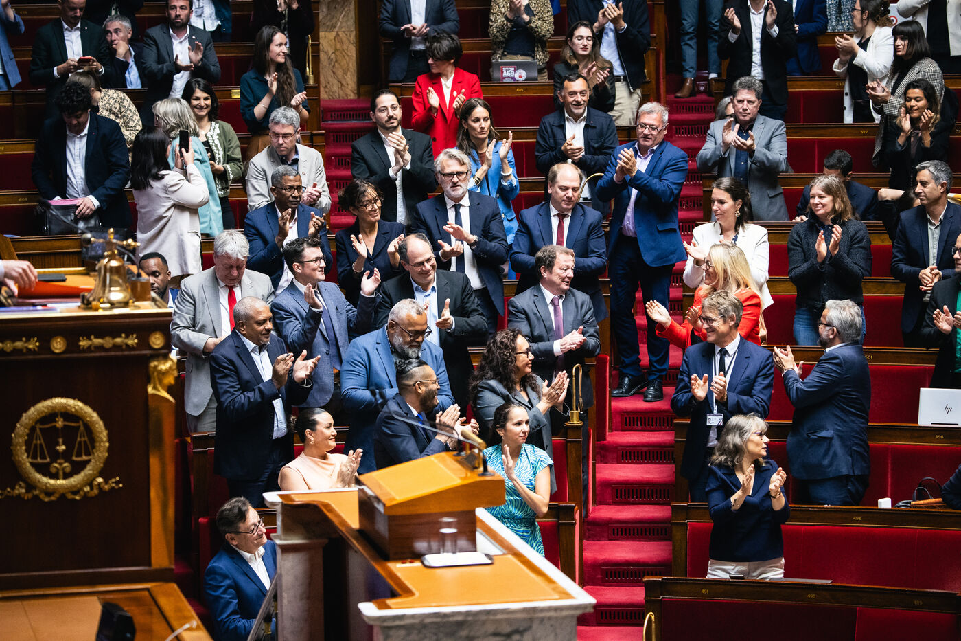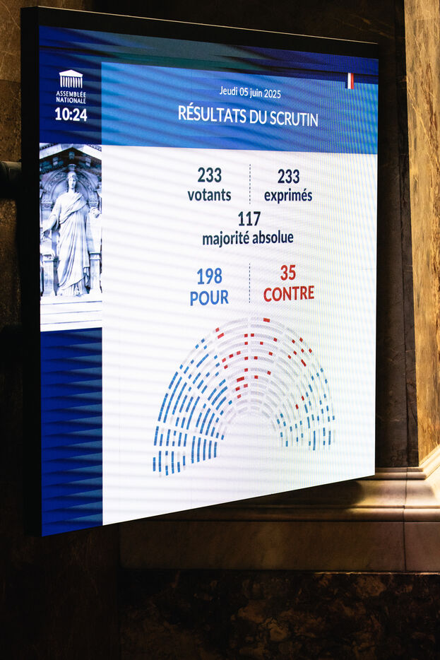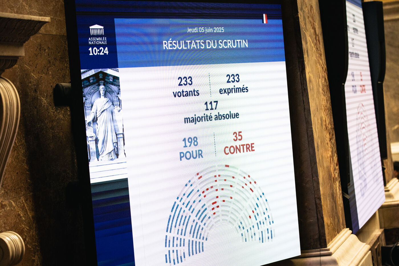 Examination, discussion and vote on a symbolic motion for a resolution to repeal the pension reform (postponement of the retirement age to 64), text tabled as part of the parliamentary day of the GDR Gauche Democratique et Republicaine group, made up of Communist and ultra-Marine elected representatives in the hemicycle of the National Assembly in Paris, France on June 5, 2025. The motion for a resolution was adopted by vote (198 in favour, 35 against).