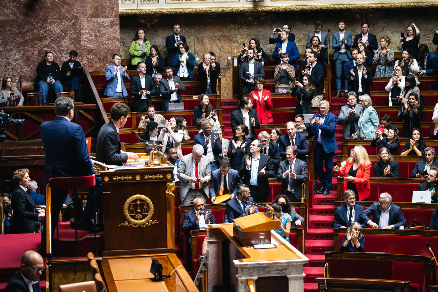 Examen, discussion et vote sur une proposition de résolution symbolique d'abrogation de la réforme des retraites (report de l'age de départ à 64 ans), texte déposé dans le cadre de la journée parlementaire du groupe Gauche démocrate et républicaine GDR, composé d'élus communistes et ultra-marins dans l'hémicycle de l'assemblée nationale à Paris, France le 5 Juin 2025. La proposition de résolution a été adoptée par vote (198 voix pour, 35 contre).
