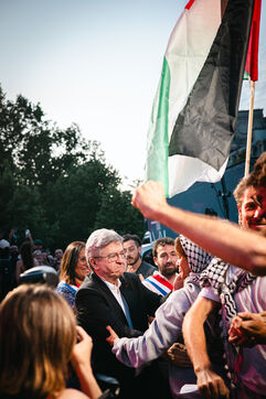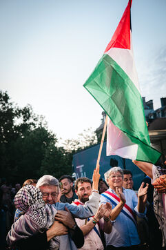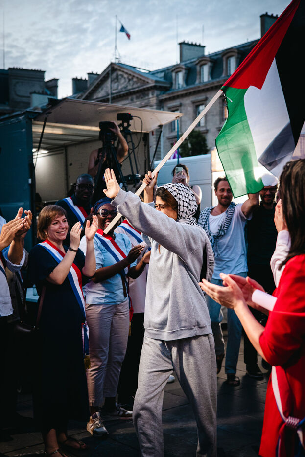 Gathering on the Place de la République to celebrate the liberation and return to France of some of the crew of the boat Madleen, Freedom Flotilla including MEP Rima Hassan, intercepted by the Israeli army on its way to Gaza to bring humanitarian aid to the Palestinian population against the blockade in Palestine, in Paris, France on June 12, 2025.
